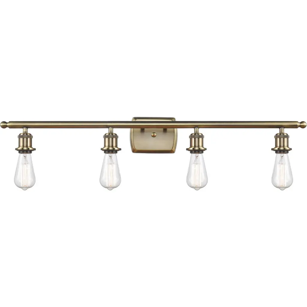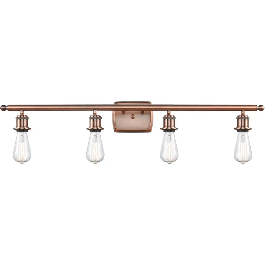 INNOVATIONS LIGHTING 215-AC Bare Bulb 4 Light Bath Vanity Light part of the Franklin Restoration Collection. Style: Traditional, Industrial, Farmhouse, Restoration-Vintage. Collection: Franklin Restoration. Material: Steel, Cast Brass. Metal Finish(Body): Antique Copper. Metal Finish(Canopy/Backplate): Antique Copper. Dimension(in): 4(H) x 42(W) x 6.125(Ext). Bulb: (4)60W Medium Base Vintage Bulb recommended(Not Included). Voltage: 120. Dimmable: Yes. Color Temperature: 2200. CRI: 99.9. Lumens: 220. Maximum Wattage Per Socket: 100. Canopy Dimension(in): 4.5(Dia). Backplate Dimenison(in): 4.5(Dia) x 0.75(Depth). ADA Compliant: No. UL & ETL Certification: Damp Location.