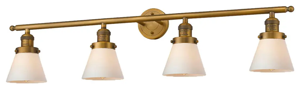 INNOVATIONS LIGHTING 215-BB-G181S-LED Small Canton 4 Light Bath Vanity Light part of the Franklin Restoration Collection. Style: Industrial, Farmhouse, Seaside, Nautical, Restoration-Vintage, Traditional. Collection: Franklin Restoration. Material: Steel, Cast Brass, Glass. Metal Finish(Body): Brushed Brass. Metal Finish(Canopy/Backplate): Brushed Brass. Dimension(in): 11.25(H) x 42(W) x 7.5(Ext). Bulb: (4)3.5 Watt LED Vintage Medium Base Bulb Included. Voltage: 120. Dimmable: Yes. Color Temperature: 2700. CRI: 82. Lumens: 350. Maximum Wattage Per Socket: 100. Glass Shade Description: Matte White Small Canton. Shade Material: Glass. Glass or Metal Shade Color: Matte White. Glass Type: Frosted. Shade Size Dimension(in): 5.25(Dia) x 5.5(H). Shade Fitter Measurement: 3.25 inch Fitter. Canopy Dimension(in): 4.5(Dia). Backplate Dimenison(in): 4.5(Dia) x 0.75(Depth). UL & ETL Certification: Damp Location.