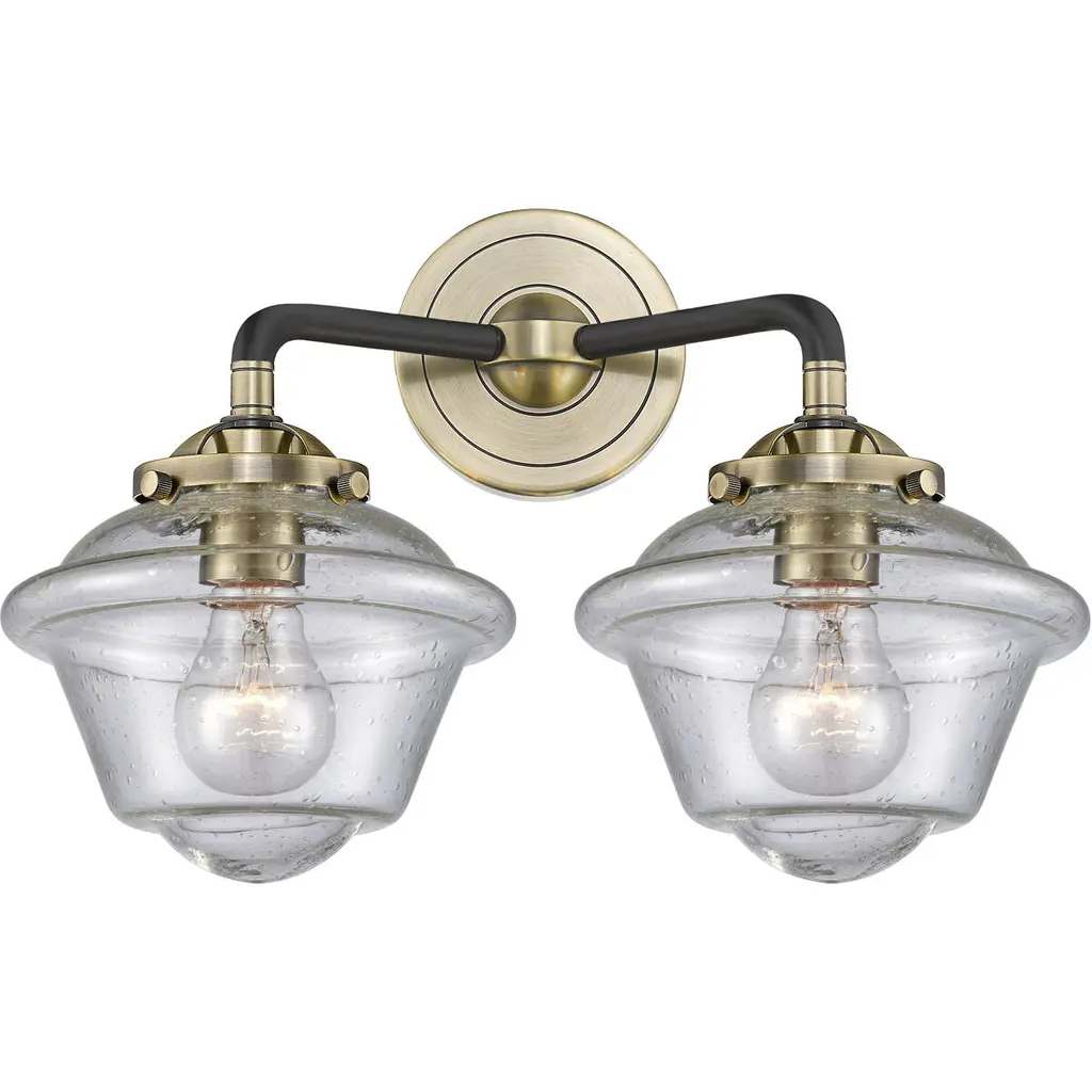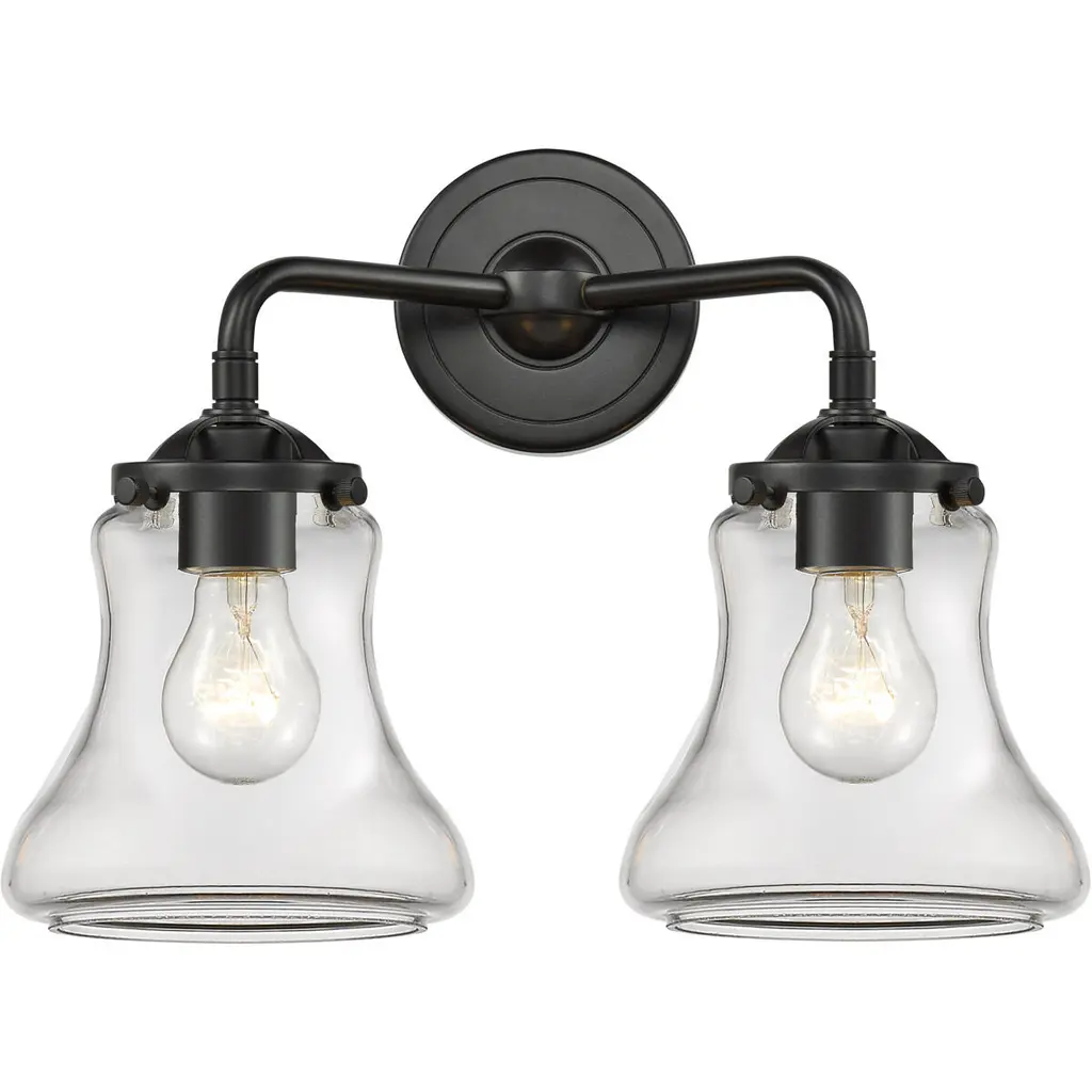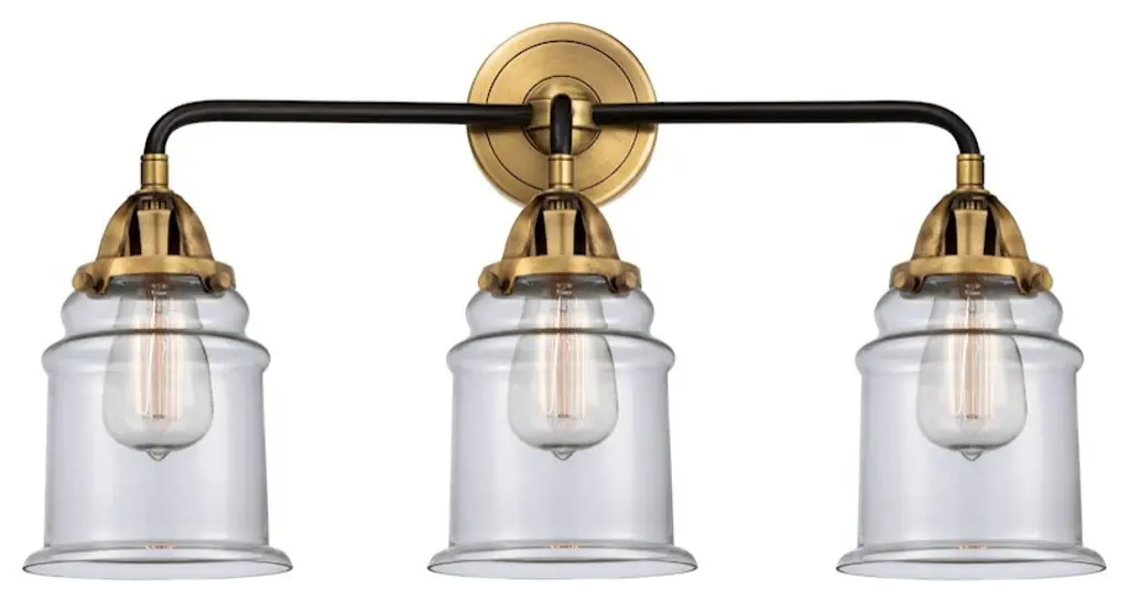 Innovations Lighting 288-2W-BAB-G182-LED Canton 2 Light 14" Bath Vanity Light. Style: Transitional, Industrial, Farmhouse, Seaside, Restoration-Vintage. Collection: Nouveau 2. Material: Steel, Cast Brass, Glass. Metal Finish(Body): Black Antique Brass. Metal Finish(Canopy/Backplate): Antique Brass. Accent Color: Matte Black. Dimension(in): 13.625(H) x 14(W) x 7.25(Ext). Bulb: (2)3.5 Watt LED Vintage Medium Base Bulb Included. Voltage: 120. Dimmable: Yes. Color Temperature: 2700. CRI: 82. Lumens: 350. Maximum Wattage Per Socket: 100. Glass Shade Description: Clear Canton. Shade Material: Glass. Glass or Metal Shade Color: Clear. Glass Type: Transparent . Shade Size Dimension(in): 6(Dia) x 7.25(H). Shade Fitter Measurement: 3.25" Fitter. Canopy Dimension(in): 4.5(Dia). Backplate Dimenison(in): 4.5(Dia) x 0.75(Depth). UL and ETL Certification: Damp Location.