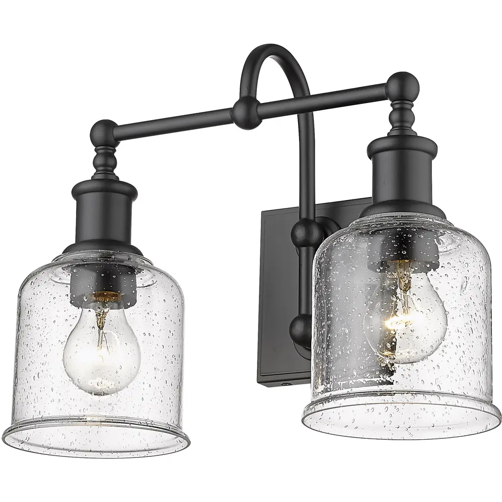 Innovations Lighting 288-2W-BK-G184 Canton 2 Light 14" Bath Vanity Light. Style: Transitional, Industrial, Farmhouse, Seaside, Restoration-Vintage. Collection: Nouveau 2. Material: Steel, Cast Brass, Glass. Metal Finish(Body): Matte Black. Metal Finish(Canopy/Backplate): Matte Black. Dimension(in): 13.625(H) x 14(W) x 7.25(Ext). Bulb: (2)60W Medium Base Vintage Bulb recommended(Not Included). Voltage: 120. Dimmable: Yes. Color Temperature: 2200. CRI: 99.9. Lumens: 220. Maximum Wattage Per Socket: 100. Glass Shade Description: Seedy Canton. Shade Material: Glass. Glass or Metal Shade Color: Seedy. Glass Type: Seeded. Shade Size Dimension(in): 6(Dia) x 7.25(H). Shade Fitter Measurement: 3.25" Fitter. Canopy Dimension(in): 4.5(Dia). Backplate Dimenison(in): 4.5(Dia) x 0.75(Depth). UL and ETL Certification: Damp Location.