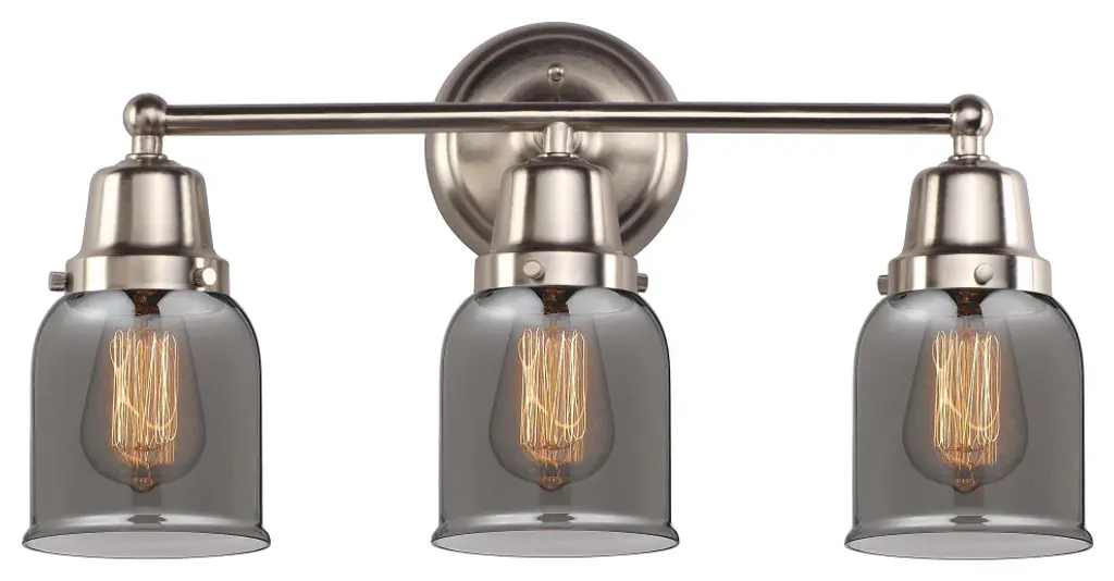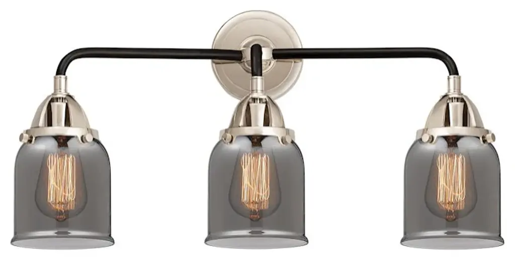 Innovations Lighting 288-3W-BPN-G63 Small Cone 3 Light 24.25" Bath Vanity Light. Style: Transitional, Industrial, Farmhouse, Restoration-Vintage. Collection: Nouveau 2. Material: Steel, Cast Brass, Glass. Metal Finish(Body): Black Polished Nickel. Metal Finish(Canopy/Backplate): Polished Nickel. Accent Color: Matte Black. Dimension(in): 10.125(H) x 24.25(W) x 7.375(Ext). Bulb: (3)60W Medium Base Vintage Bulb recommended(Not Included). Voltage: 120. Dimmable: Yes. Color Temperature: 2200. CRI: 99.9. Lumens: 220. Maximum Wattage Per Socket: 100. Glass Shade Description: Plated Smoke Small Cone. Shade Material: Glass. Glass or Metal Shade Color: Plated Smoke. Glass Type: Colorful . Shade Size Dimension(in): 6.25(Dia) x 5.75(H). Shade Fitter Measurement: 3.25" Fitter. Canopy Dimension(in): 4.5(Dia). Backplate Dimenison(in): 4.5(Dia) x 0.75(Depth). UL and ETL Certification: Damp Location.