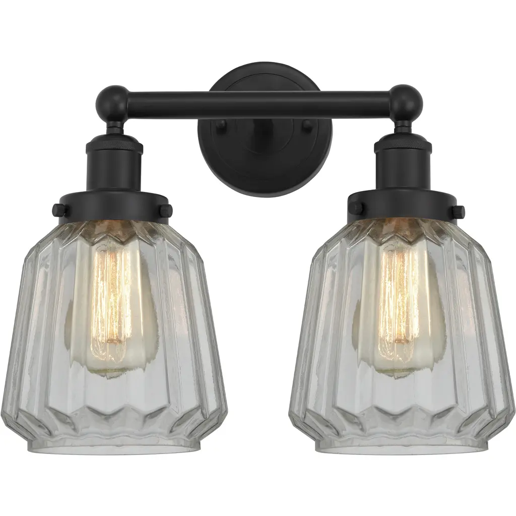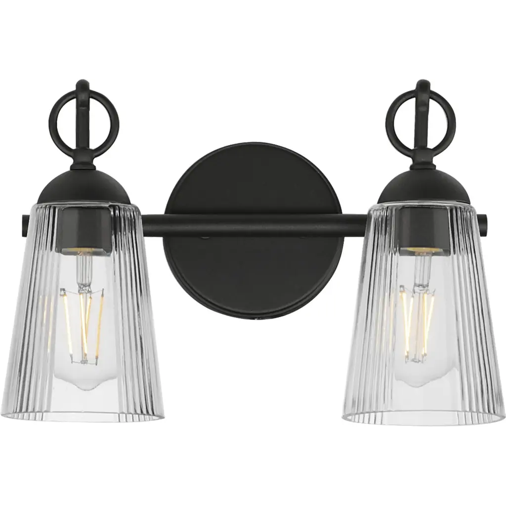 INNOVATIONS LIGHTING 447-2W-BK-G142-LED Caden 2 Light 17 inch Bath Vanity Light. Innovations Lighting Caden 2 Light 17 inch Matte Black Bath Vanity Light. Metal Finish (Body): Matte Black. Metal Finish (Canopy/Backplate): Matte Black. Glass or Metal Shade Color: Clear. Material: Steel, Glass. Shade Material: Glass. Dimension(in): 12(H) x 15.25(W) x 8.375(Ext). Backplate Dimension(in): 0.875(D) x 5(Dia). Shade Size(in): 6.75(H) x 6.25(Dia). Bulb: (2) 3.5 Watt LED Vintage Medium Base Bulb Included. Voltage: 120. Dimmable: Yes. Color Temperature(Kelvin): 2700. CRI: 82. Lumens: 350. Glass Type: Transparent . Glass or Metal Shade Shape: Cone. Shade Fitter Measurement: 3.25 inch Fitter. ADA Compliant: No. Style: Retro, Industrial. Ul Certification Type: Damp Location. Warranty: 2 Year Finish, Lifetime Electrical.