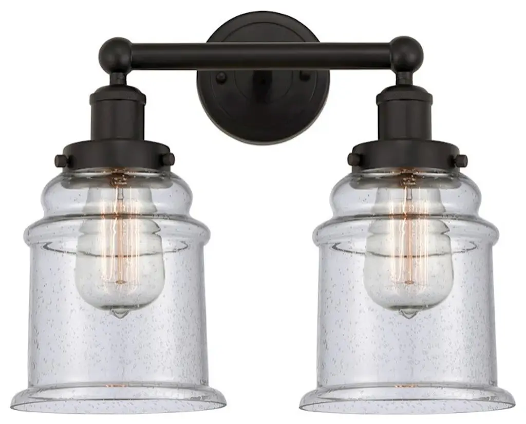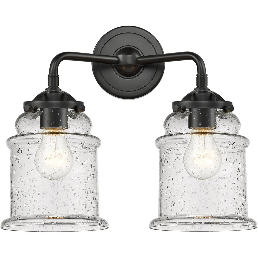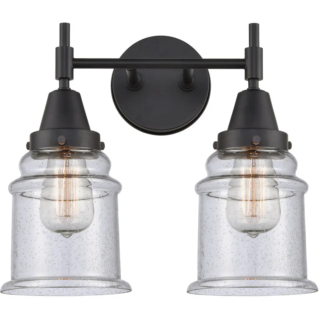 INNOVATIONS LIGHTING 447-2W-BK-G184-LED Caden 2 Light 17 inch Bath Vanity Light. Innovations Lighting Caden 2 Light 17 inch Matte Black Bath Vanity Light. Metal Finish (Body): Matte Black. Metal Finish (Canopy/Backplate): Matte Black. Glass or Metal Shade Color: Seedy. Material: Steel, Glass. Shade Material: Glass. Dimension(in): 12.5(H) x 15(W) x 8.25(Ext). Backplate Dimension(in): 0.875(D) x 5(Dia). Shade Size(in): 7.25(H) x 6(Dia). Bulb: (2) 3.5 Watt LED Vintage Medium Base Bulb Included. Voltage: 120. Dimmable: Yes. Color Temperature(Kelvin): 2700. CRI: 82. Lumens: 350. Glass Type: Seeded. Glass or Metal Shade Shape: Cone. Shade Fitter Measurement: 3.25 inch Fitter. ADA Compliant: No. Style: Retro, Industrial. Ul Certification Type: Damp Location. Warranty: 2 Year Finish, Lifetime Electrical.