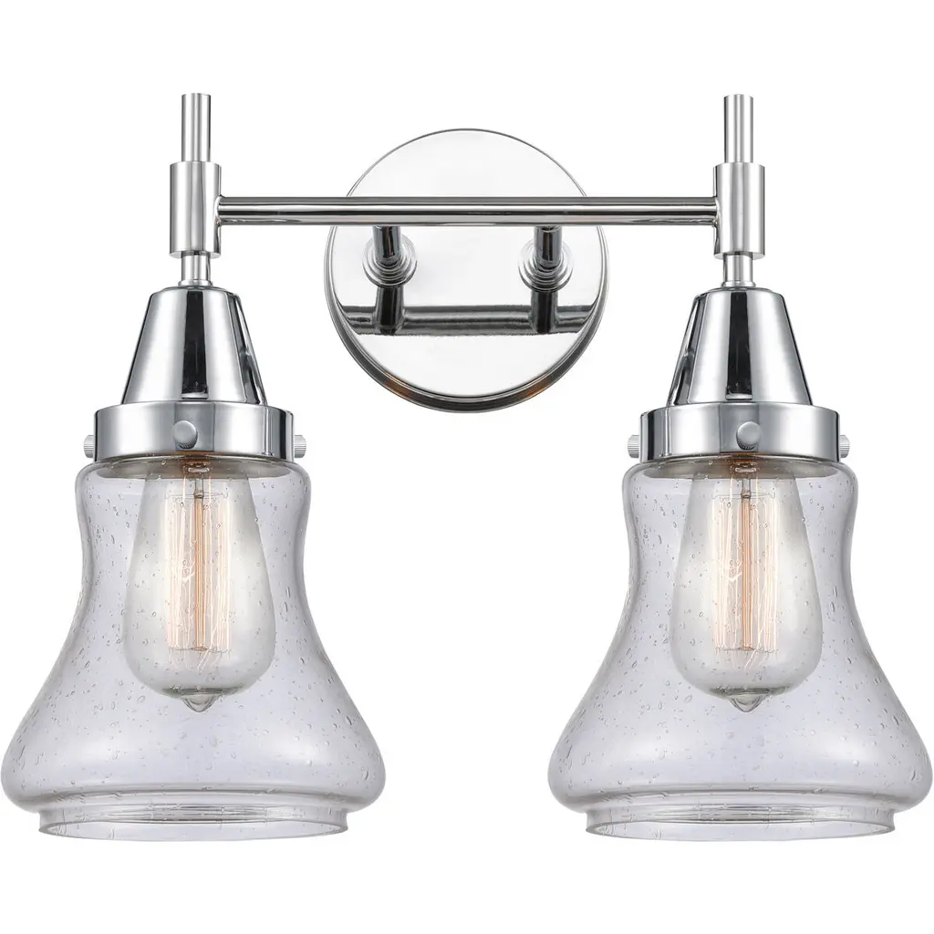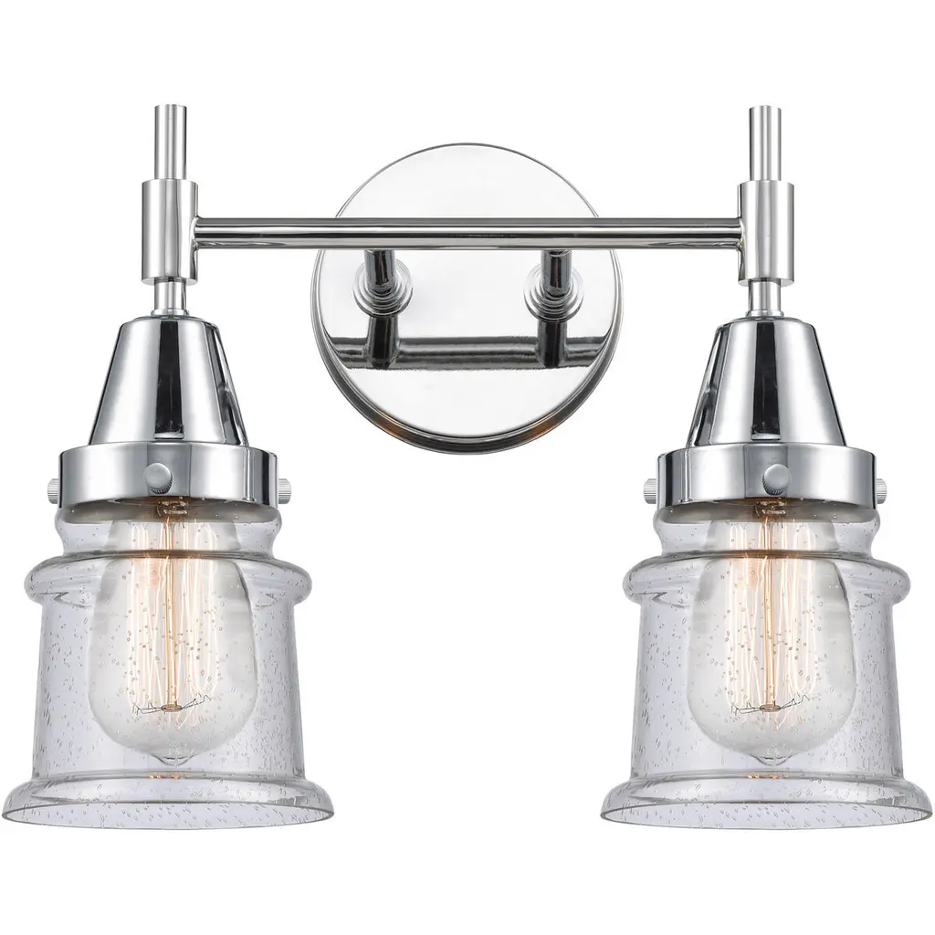 INNOVATIONS LIGHTING 447-2W-PC-G194-LED Caden 2 Light 17 inch Bath Vanity Light. Innovations Lighting Caden 2 Light 17 inch Polished Chrome Bath Vanity Light. Metal Finish (Body): Polished Chrome. Metal Finish (Canopy/Backplate): Polished Chrome. Glass or Metal Shade Color: Seedy. Material: Steel, Glass. Shade Material: Glass. Dimension(in): 11.5(H) x 15(W) x 8.25(Ext). Backplate Dimension(in): 0.875(D) x 5(Dia). Shade Size(in): 6.25(H) x 6(Dia). Bulb: (2) 3.5 Watt LED Vintage Medium Base Bulb Included. Voltage: 120. Dimmable: Yes. Color Temperature(Kelvin): 2700. CRI: 82. Lumens: 350. Glass Type: Seeded. Glass or Metal Shade Shape: Cone. Shade Fitter Measurement: 3.25 inch Fitter. ADA Compliant: No. Style: Retro, Industrial. Ul Certification Type: Damp Location. Warranty: 2 Year Finish, Lifetime Electrical.