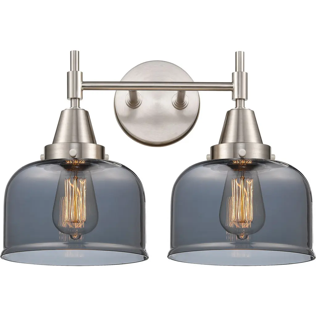 INNOVATIONS LIGHTING 447-2W-SN-G1 Caden 2 Light 17 inch Bath Vanity Light. Innovations Lighting Caden 2 Light 17 inch Satin Nickel Bath Vanity Light. Metal Finish (Body): Satin Nickel. Metal Finish (Canopy/Backplate): Satin Nickel. Glass or Metal Shade Color: Matte White. Material: Steel, Glass. Shade Material: Glass. Dimension(in): 7.25(H) x 18(W) x 9.75(Ext). Backplate Dimension(in): 0.875(D) x 5(Dia). Shade Size(in): 2(H) x 9(Dia). Bulb: (2)60W Incandescent Medium Base(Not Included). Voltage: 120. Dimmable: Yes. Color Temperature(Kelvin): 2200. CRI: 99.9. Lumens: 220. Glass Shade: Matte White Cased Large Cone. Glass Type: Frosted. Glass or Metal Shade Shape: Cone. Shade Fitter Measurement: 3.25 inch Fitter. ADA Compliant: No. Style: Retro, Industrial. Ul Certification Type: Damp Location. Warranty: 2 Year Finish, Lifetime Electrical.