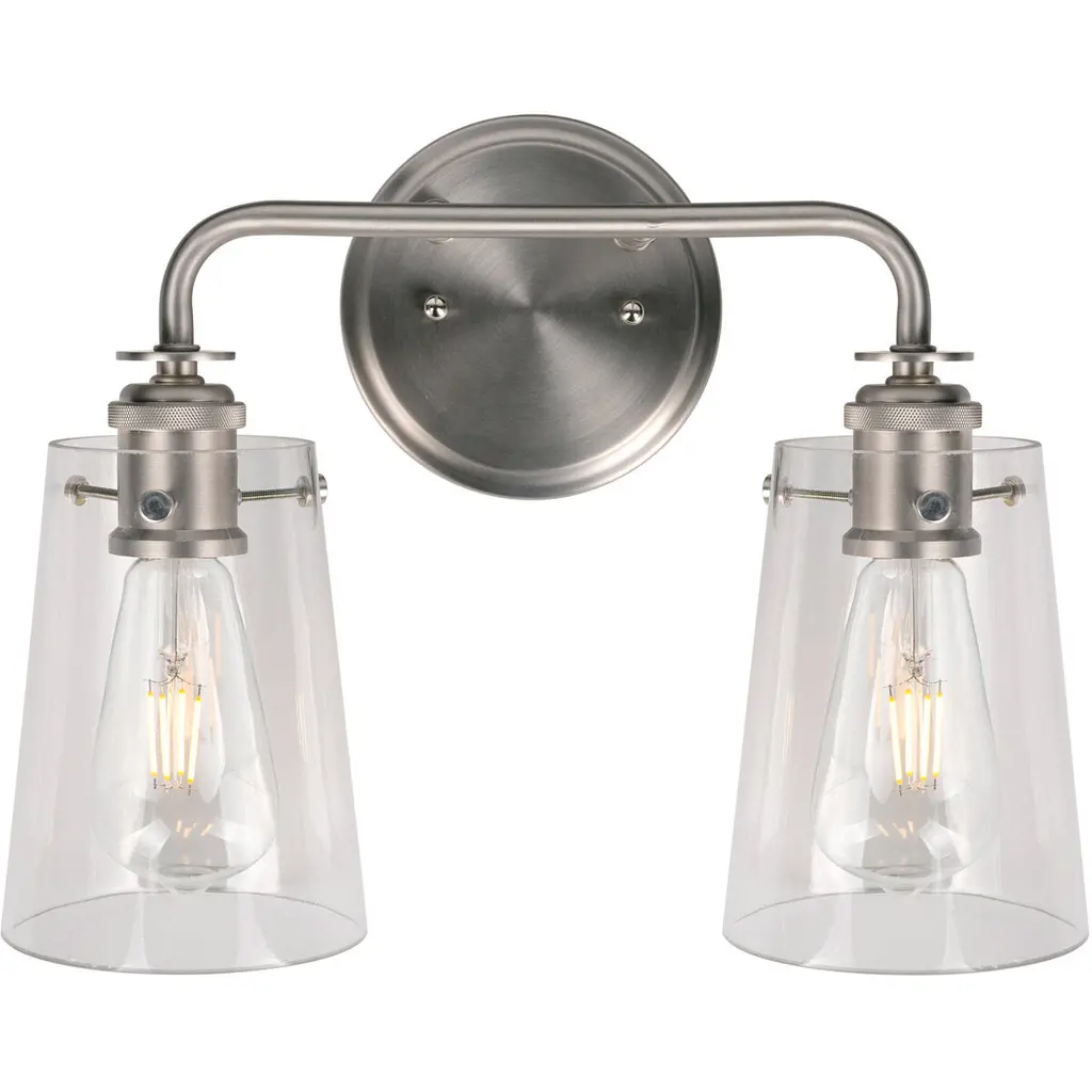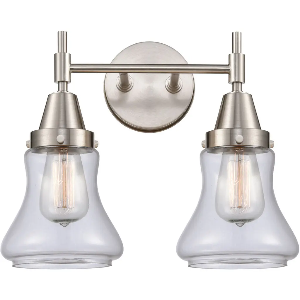 INNOVATIONS LIGHTING 447-2W-SN-G172-LED Caden 2 Light 17 inch Bath Vanity Light. Innovations Lighting Caden 2 Light 17 inch Satin Nickel Bath Vanity Light. Metal Finish (Body): Satin Nickel. Metal Finish (Canopy/Backplate): Satin Nickel. Glass or Metal Shade Color: Clear. Material: Steel, Glass. Shade Material: Glass. Dimension(in): 10.5(H) x 15.75(W) x 8.625(Ext). Backplate Dimension(in): 0.875(D) x 5(Dia). Shade Size(in): 5.25(H) x 6.75(Dia). Bulb: (2) 3.5 Watt LED Vintage Medium Base Bulb Included. Voltage: 120. Dimmable: Yes. Color Temperature(Kelvin): 2700. CRI: 82. Lumens: 350. Glass Type: Transparent . Glass or Metal Shade Shape: Cone. Shade Fitter Measurement: 3.25 inch Fitter. ADA Compliant: No. Style: Retro, Industrial. Ul Certification Type: Damp Location. Warranty: 2 Year Finish, Lifetime Electrical.