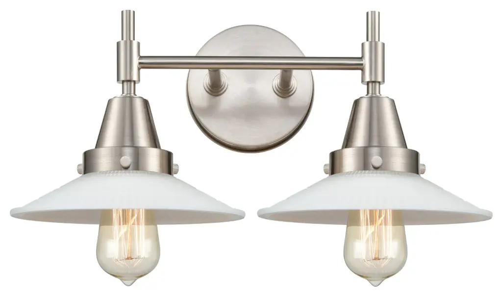 INNOVATIONS LIGHTING 447-2W-SN-G2 Caden 2 Light 17 inch Bath Vanity Light. Innovations Lighting Caden 2 Light 17 inch Satin Nickel Bath Vanity Light. Metal Finish (Body): Satin Nickel. Metal Finish (Canopy/Backplate): Satin Nickel. Glass or Metal Shade Color: Clear. Material: Steel, Glass. Shade Material: Glass. Dimension(in): 7.25(H) x 18(W) x 9.75(Ext). Backplate Dimension(in): 0.875(D) x 5(Dia). Shade Size(in): 2(H) x 9(Dia). Bulb: (2)60W Incandescent Medium Base(Not Included). Voltage: 120. Dimmable: Yes. Color Temperature(Kelvin): 2200. CRI: 99.9. Lumens: 220. Glass Shade: Clear Large Cone. Glass Type: Transparent . Glass or Metal Shade Shape: Cone. Shade Fitter Measurement: 3.25 inch Fitter. ADA Compliant: No. Style: Retro, Industrial. Ul Certification Type: Damp Location. Warranty: 2 Year Finish, Lifetime Electrical.
