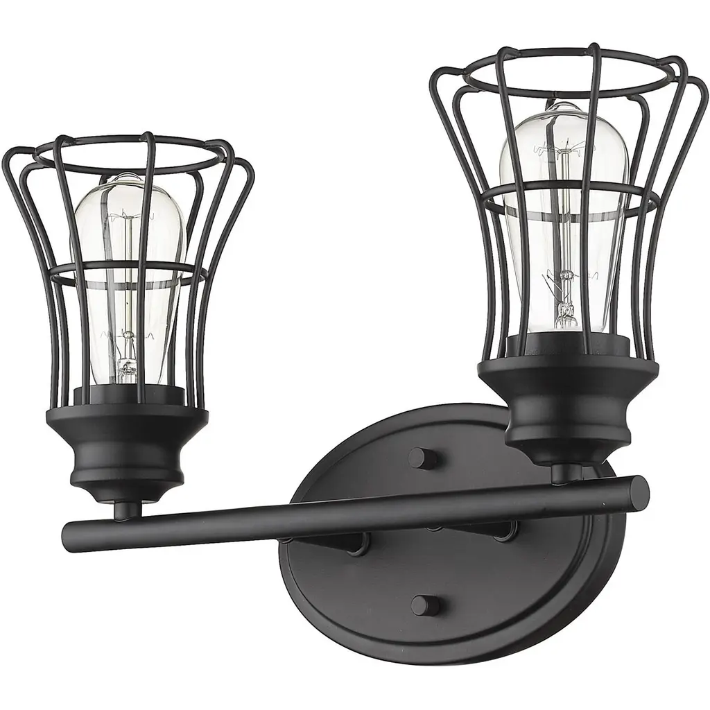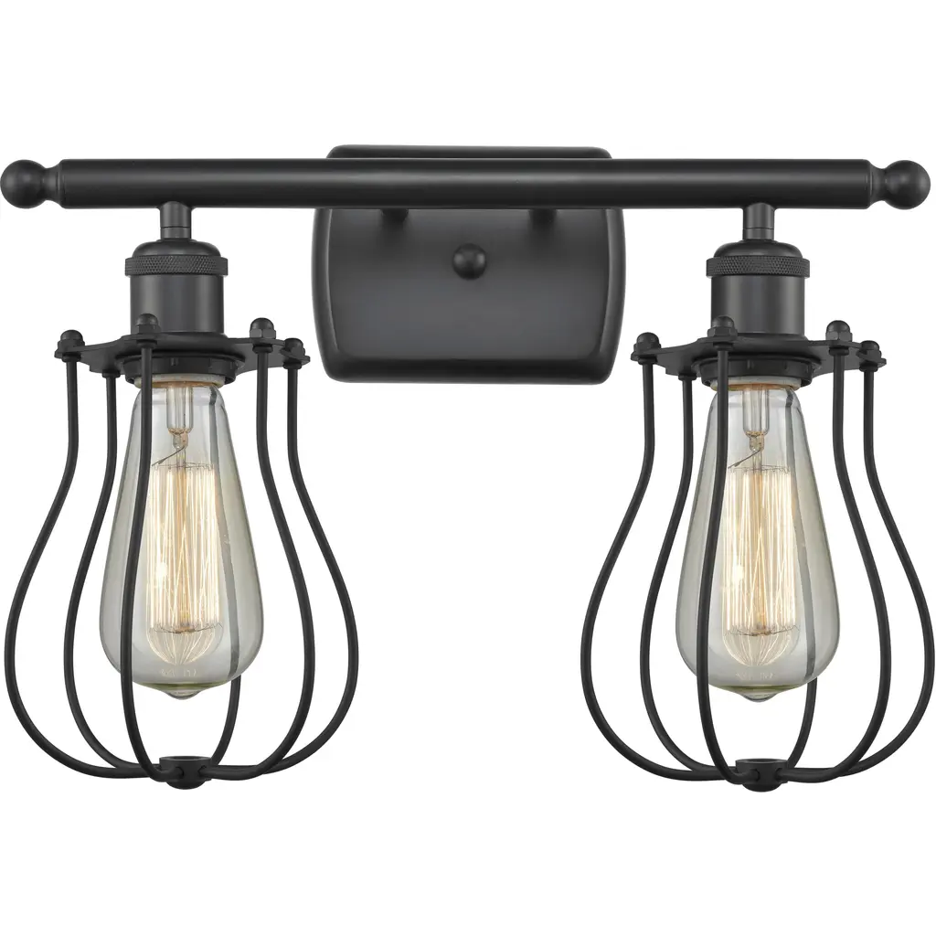 INNOVATIONS LIGHTING 516-2W-BK-CE219 Bleecker 2 Light Bath Vanity Light. The Bleecker 2 Light Bath Vanity Light is part of the Austere Collection. . Collection: Austere. Material: Steel, Cast Brass. Metal Finish(Body): Matte Black. Metal Finish(Shade): Matte Black. Metal Finish (Canopy/Backplate): Matte Black. Dimension(in): 12(H) x 16(W) x 7(Ext). Bulb: (2)60W Medium Base(Not Included). Dimmable: Yes. Lumens: CE219. Color Rendering Index(CRI): 99.9. Voltage: 120. Glass or Metal Shade Shape: Cone. Glass or Metal Shade Color: Matte Black. Shade Material: Metal. Shade Size (Diameter x Height)(in): 3.5 X 7. Canopy Dimensions(in): . Backplate Dimensions(in): 4.5x6x0.75. Certification: UL & ETL, Damp Location.