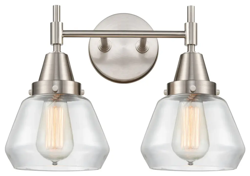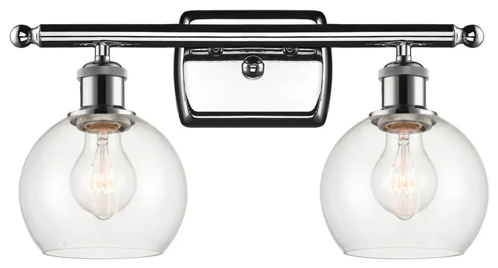 Innovations Lighting 516-2W-SN-G122-8-LED Athens 2 Light 16 inch Bath Vanity Light. Style: Industrial, Modern Contempo, Restoration-Vintage, Transitional . Collection: Ballston. Material: Steel, Cast Brass, Glass. Metal Finish(Body): Brushed Satin Nickel. Metal Finish(Canopy/Backplate): Brushed Satin Nickel. Dimension(in): 11.25(H) x 18(W) x 8.125(Ext). Bulb: (2)3.5 Watt LED Vintage Medium Base Bulb Included. Voltage: 120. Dimmable: Yes. Color Temperature: 2700. CRI: 82. Lumens: 350. Maximum Wattage Per Socket: 100. Glass Shade Description: Clear Athens. Shade Material: Glass. Glass or Metal Shade Color: Clear. Glass Type: Transparent . Shade Size Dimension(in): 8(Dia) x 7(H). Shade Fitter Measurement: Neckless with a 2.125 inch Hole. Backplate Dimenison(in): 4.5(H) x 6(W) x 0.75(Depth). UL and ETL Certification: Damp Location.