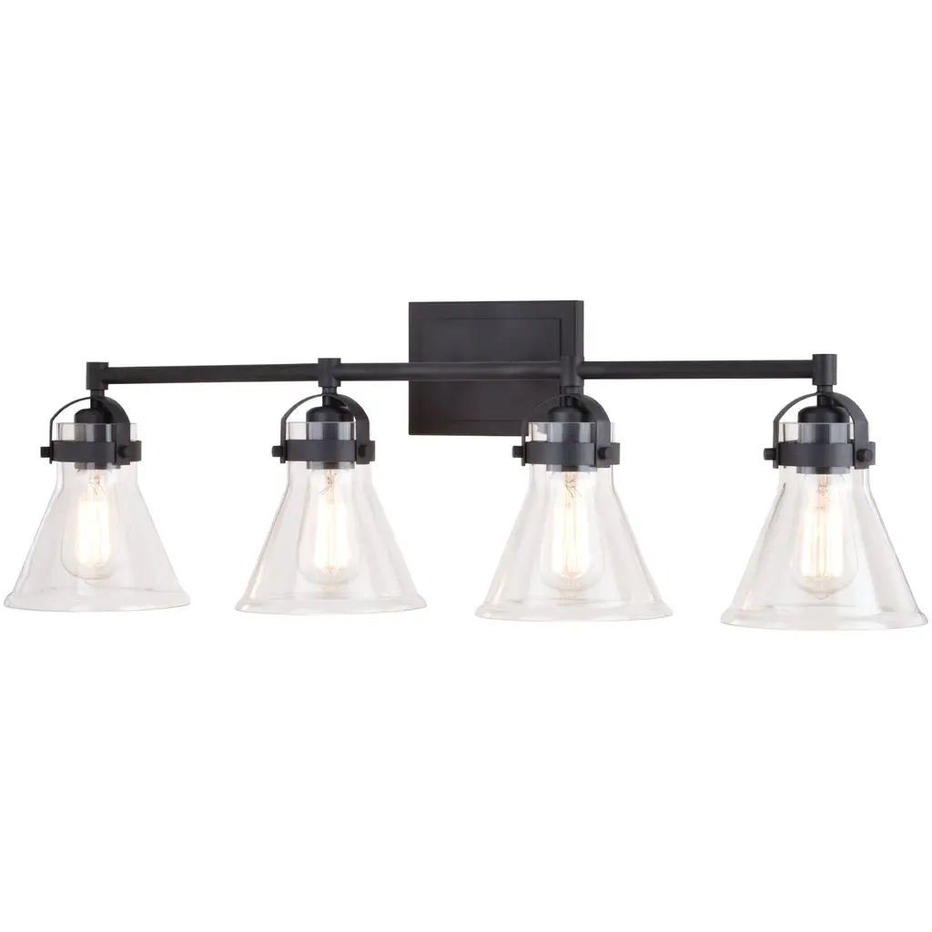 INNOVATIONS LIGHTING 916-4W-OB-G42-LED Large Cone 3 Light Bath Vanity Light part of the Ballston Collection. The Large Cone 3 Light Bath Vanity Light is part of the Ballston Collection. . Collection: Ballston. Metal Finish (Body): Oil Rubbed Bronze. Metal Finish (Canopy/Backplate): Oil Rubbed Bronze. Glass or Metal Shade Color: Clear. Material: Steel, Cast Brass, Glass. Shade Material: Glass. Dimension(in): 11(H) x 36(W) x 8(Ext). Backplate Dimension(in): 4.5(H) x 6(W) x 0.75(D). Shade Size(in): 6(H) x 7.75(Dia). Bulb: (4) 3.5 Watt LED Vintage Medium Base Bulb Included. Voltage: 120. Dimmable: Yes. Color Temperature(Kelvin): 2700. CRI: 82. Lumens: 350. Glass Type: Transparent . Glass or Metal Shade Shape: Cone. Shade Fitter Measurement: 3.25 inch Fitter. Style: Industrial, Modern Contempo, Restoration-Vintage, Transitional . Ul Certification Type: Damp Location. Warranty: 2 Year Finish, Lifetime Electrical.