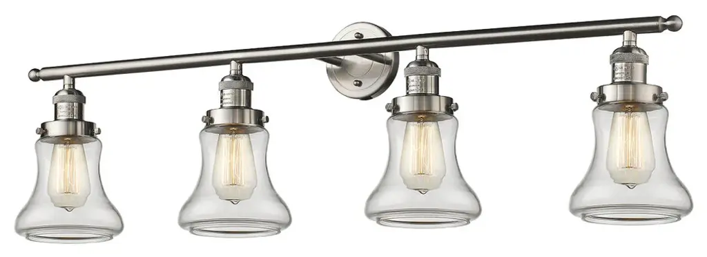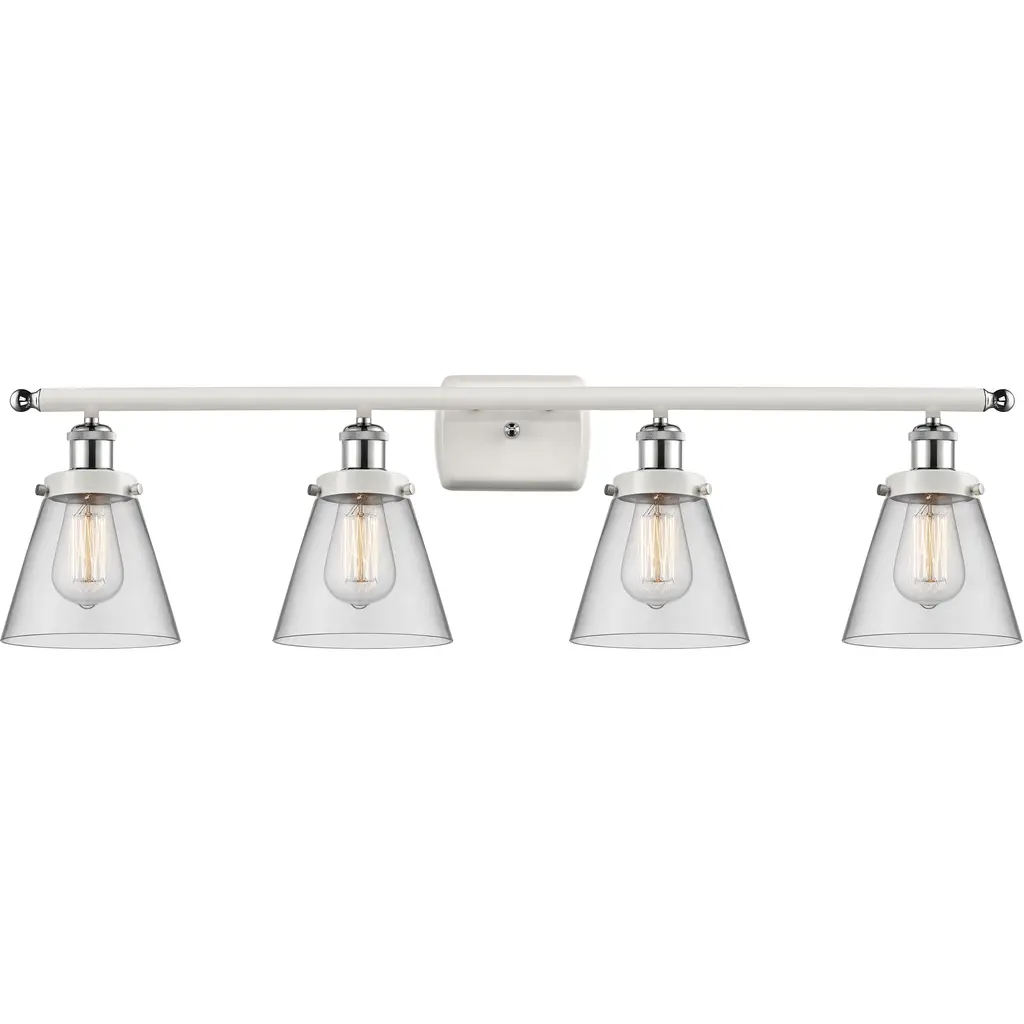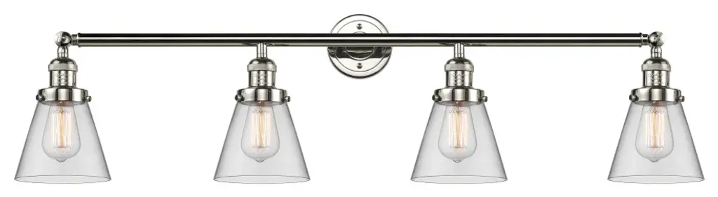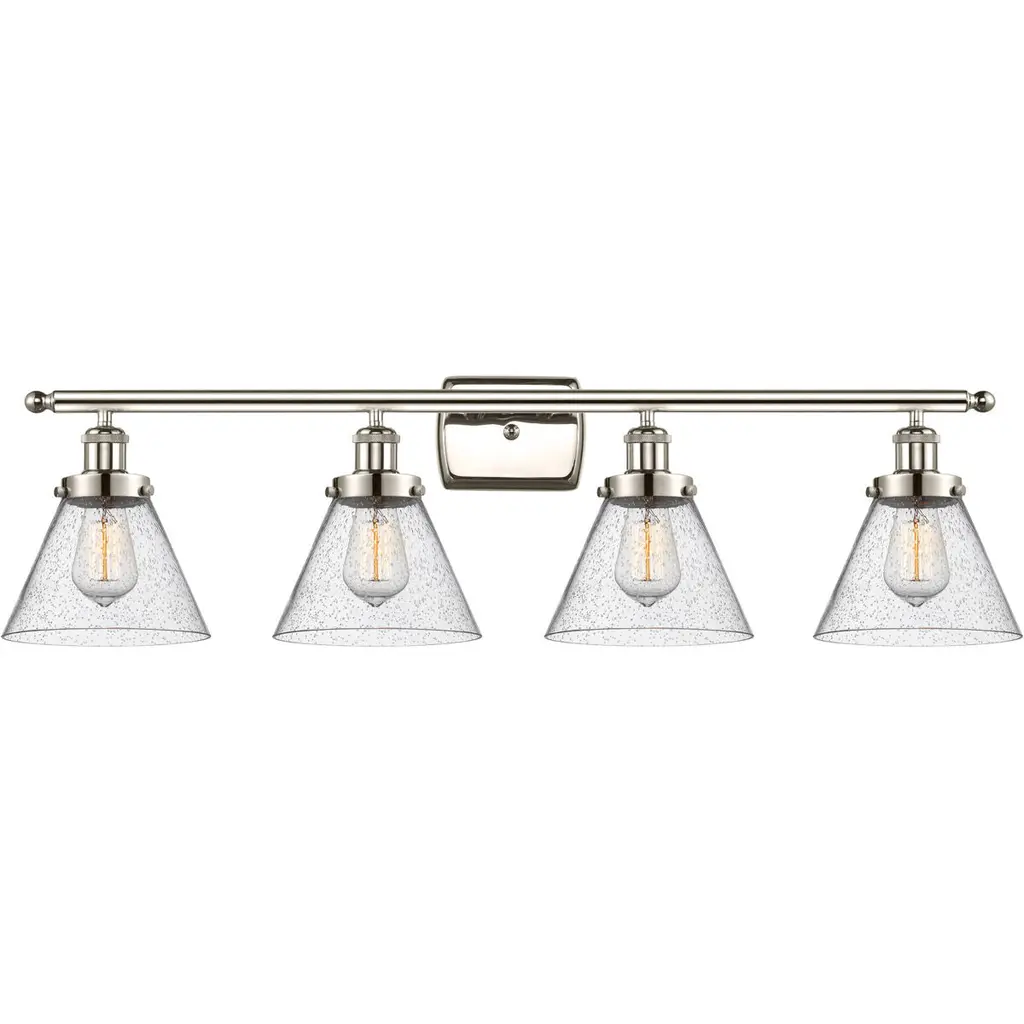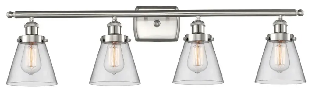 INNOVATIONS LIGHTING 916-4W-SN-G42-LED Large Cone 3 Light Bath Vanity Light part of the Ballston Collection. The Large Cone 3 Light Bath Vanity Light is part of the Ballston Collection. . Collection: Ballston. Metal Finish (Body): Brushed Satin Nickel. Metal Finish (Canopy/Backplate): Brushed Satin Nickel. Glass or Metal Shade Color: Clear. Material: Steel, Cast Brass, Glass. Shade Material: Glass. Dimension(in): 11(H) x 36(W) x 8(Ext). Backplate Dimension(in): 4.5(H) x 6(W) x 0.75(D). Shade Size(in): 6(H) x 7.75(Dia). Bulb: (4) 3.5 Watt LED Vintage Medium Base Bulb Included. Voltage: 120. Dimmable: Yes. Color Temperature(Kelvin): 2700. CRI: 82. Lumens: 350. Glass Type: Transparent . Glass or Metal Shade Shape: Cone. Shade Fitter Measurement: 3.25 inch Fitter. Style: Industrial, Modern Contempo, Restoration-Vintage, Transitional . Ul Certification Type: Damp Location. Warranty: 2 Year Finish, Lifetime Electrical.