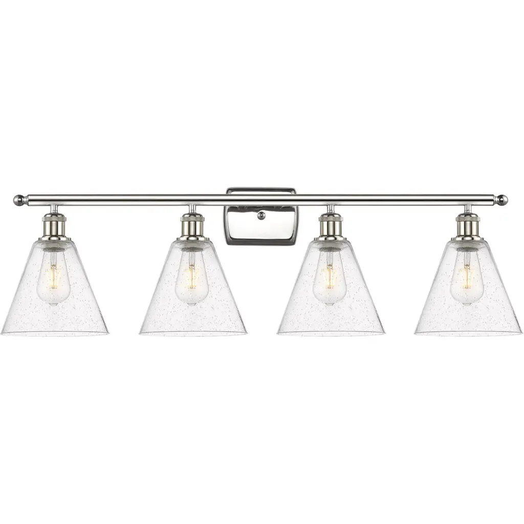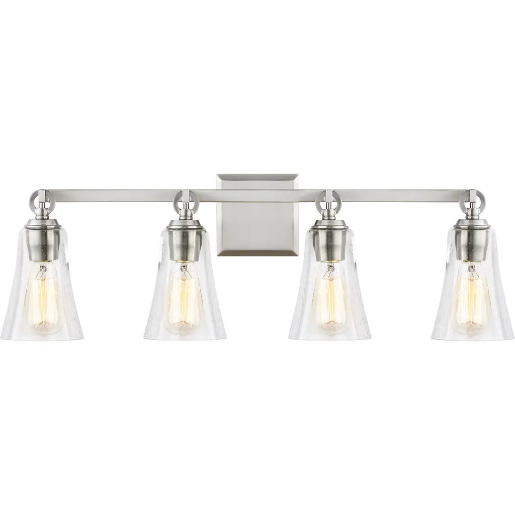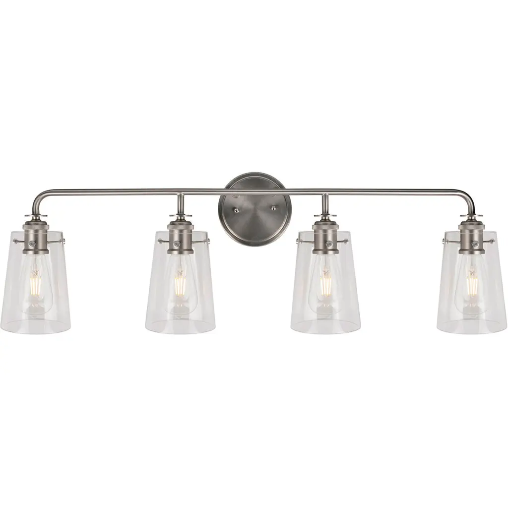 INNOVATIONS LIGHTING 916-4W-SN-G62 Small Cone 3 Light Bath Vanity Light part of the Ballston Collection. The Small Cone 3 Light Bath Vanity Light is part of the Ballston Collection. . Collection: Ballston. Metal Finish (Body): Brushed Satin Nickel. Metal Finish (Canopy/Backplate): Brushed Satin Nickel. Glass or Metal Shade Color: Clear. Material: Steel, Cast Brass, Glass. Shade Material: Glass. Dimension(in): 11(H) x 36(W) x 8(Ext). Backplate Dimension(in): 4.5(H) x 6(W) x 0.75(D). Shade Size(in): 6(H) x 6(Dia). Bulb: (4)60W Incandescent Medium Base(Not Included). Voltage: 120. Dimmable: Yes. Color Temperature(Kelvin): 2200. CRI: 99.9. Lumens: 220. Glass Shade: Clear Small Cone. Glass Type: Seeded. Glass or Metal Shade Shape: Sphere. Shade Fitter Measurement: Neckless with a 2.125 inch Hole. Style: Industrial, Modern Contempo, Restoration-Vintage, Transitional . Ul Certification Type: Damp Location. Warranty: 2 Year Finish, Lifetime Electrical.