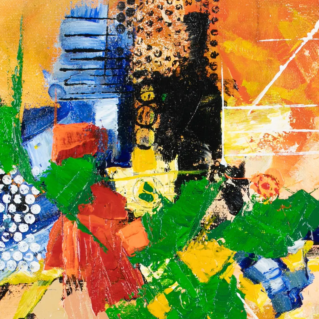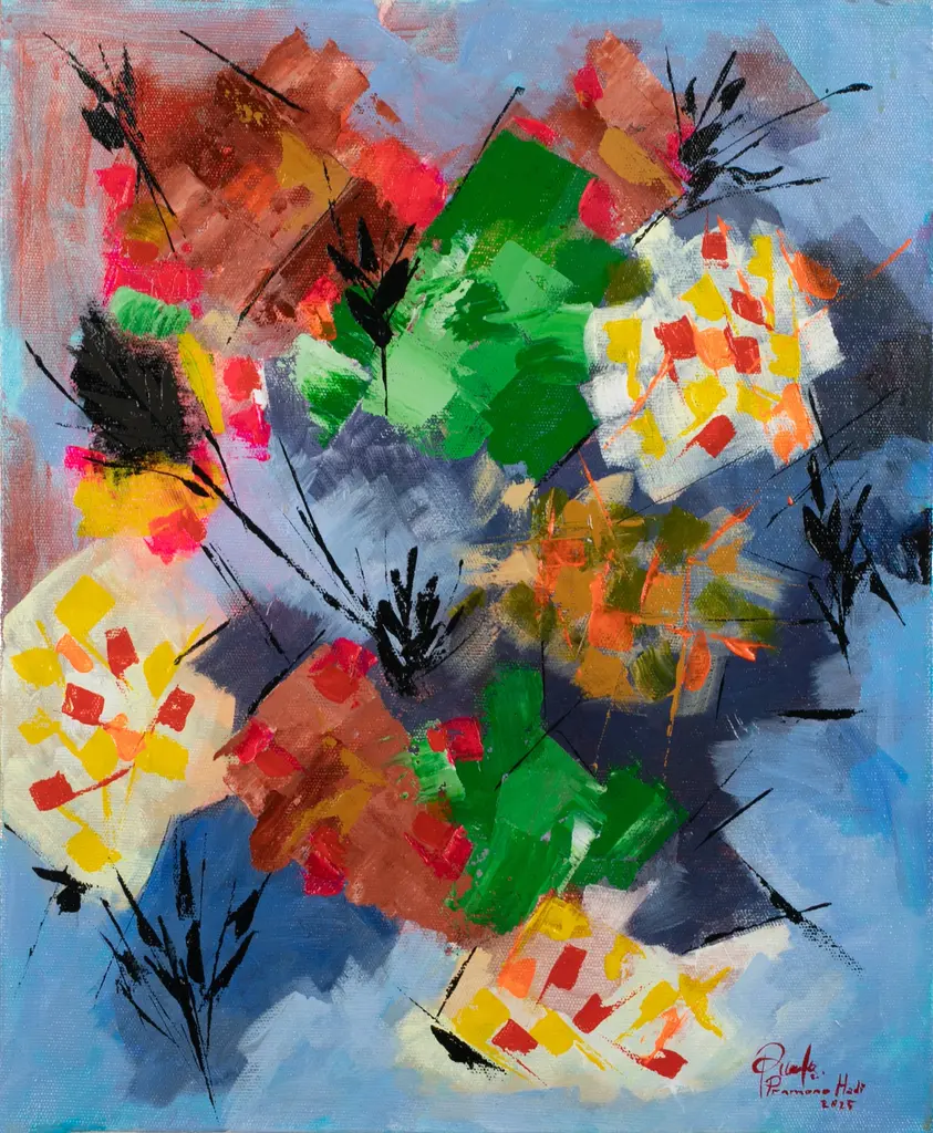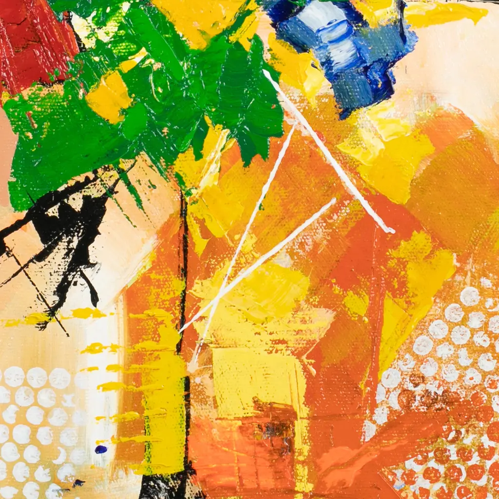 A tree can regrow and flourish as beautifully as its past self, conveying a strong message of resilience portrayed by artist Pramono Hadi of Java. Bright acrylic hues paint this abstract composition, whose warm illusion invites you to follow Mother Nature's example and bloom again.The painting arrives signed and unstretched.