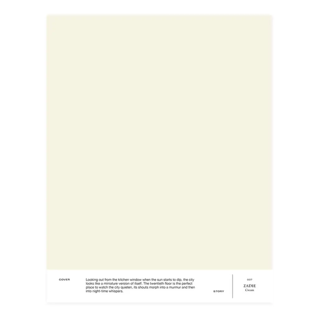 Cover Story’s interior paint in the shade 007 Zadie is a classic cream white paint whose yellowish tone adds a lovely warmth to the space. The matte paint provides a velvety smooth, non-reflective finish on the painted surface. Cover Story’s high-quality interior paints are suitable for both walls and ceilings. The eco-friendly, water-based paints are safe to use indoors, as they are odorless and do not emit harmful VOCs into the indoor air. The paints are plastic-free and therefore breathable, making them also suitable for wooden surfaces. Tips for purchasing Cover Story paints: One can of paint will cover a surface of 75–100 m². Count the amount of paint needed by multiplying the wall or ceiling width with its length. We recommend then doubling that, as the best result is achieved with two coats of paint. It is advisable to always use a sample before painting – lighting has a huge impact on how a particular shade looks in a particular space! Cover Story’s no-mess adhesive paint samples are available for purchase separately.