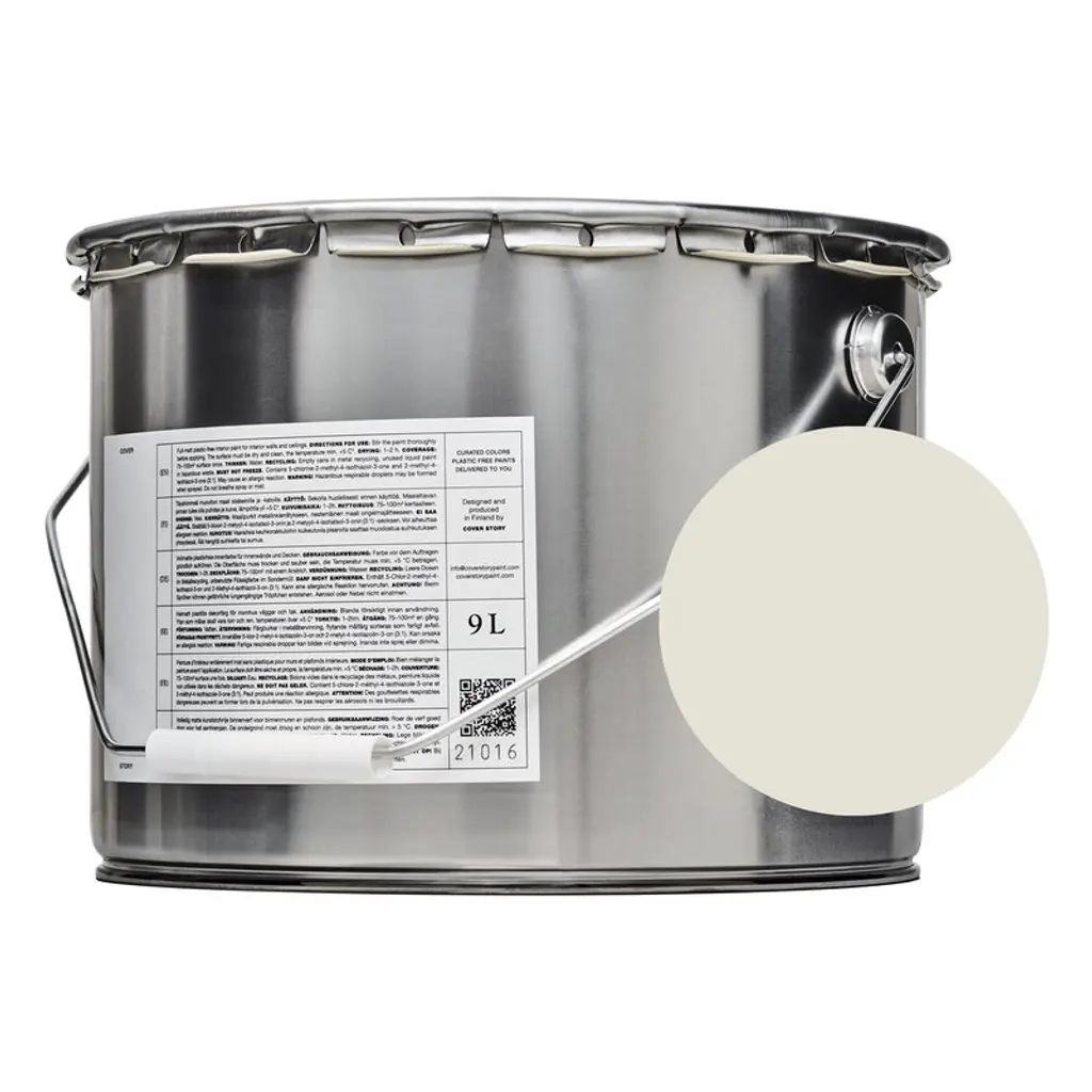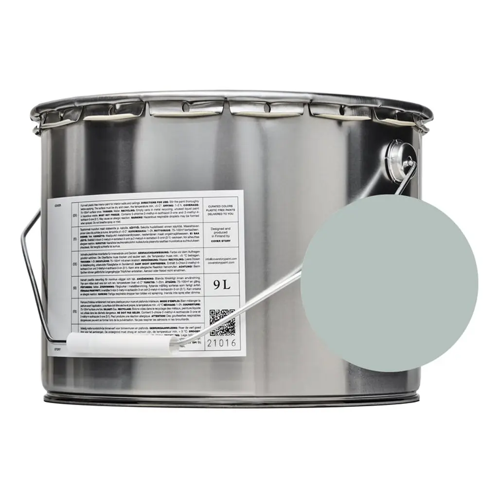 Cover Story’s interior paint in the shade 026 Agatha is a pale green-gray paint that goes well with both light and dark tones. The grayish sage-green also creates a beautiful background for furniture made of cherry or walnut. Agatha is a matte paint and provides a velvety, non-reflective finish on the painted surface. Cover Story’s high-quality interior paints are suitable for both walls and ceilings. The eco-friendly, water-based paints are safe to use indoors, as they are odorless and do not emit harmful VOCs into the indoor air. The paints are plastic-free and therefore breathable, making them also suitable for wooden surfaces. Tips for purchasing Cover Story paints: One can of paint will cover a surface of 75–100 m². Count the amount of paint needed by multiplying the wall or ceiling width with its length. We recommend then doubling that, as the best result is achieved with two coats of paint. It is advisable to always use a sample before painting – lighting has a huge impact on how a particular shade looks in a particular space! Cover Story’s no-mess adhesive paint samples are available for purchase separately.