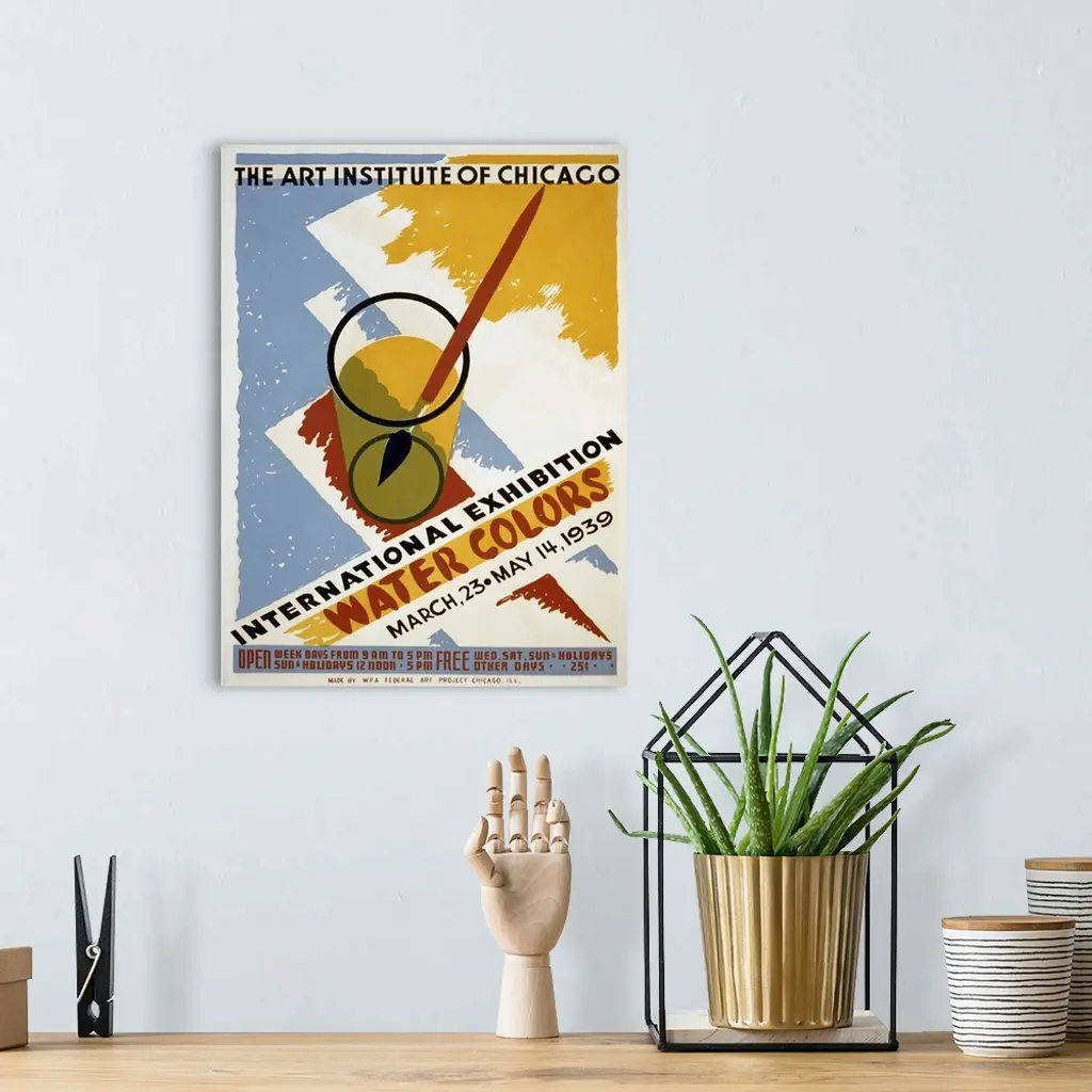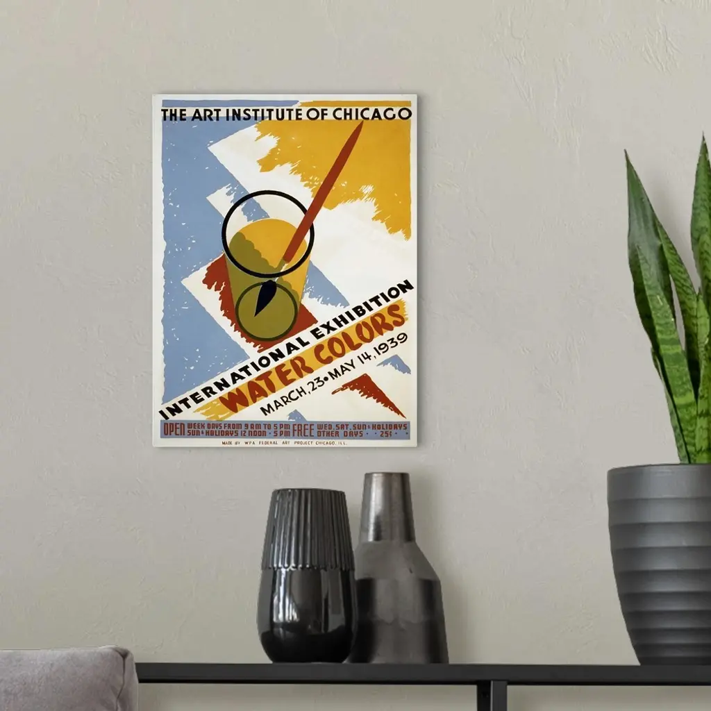 International Exhibition of Water Colorsm The Art Institute of Chicago. March 23 - May 14 1939. Poster for exhibit of watercolors at the Art Institute of Chicago, showing a paintbrush in a glass of water. Library of Congress, Prints and Photographs Division, WPA Poster Collection.