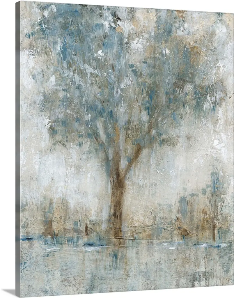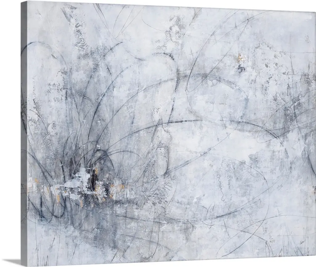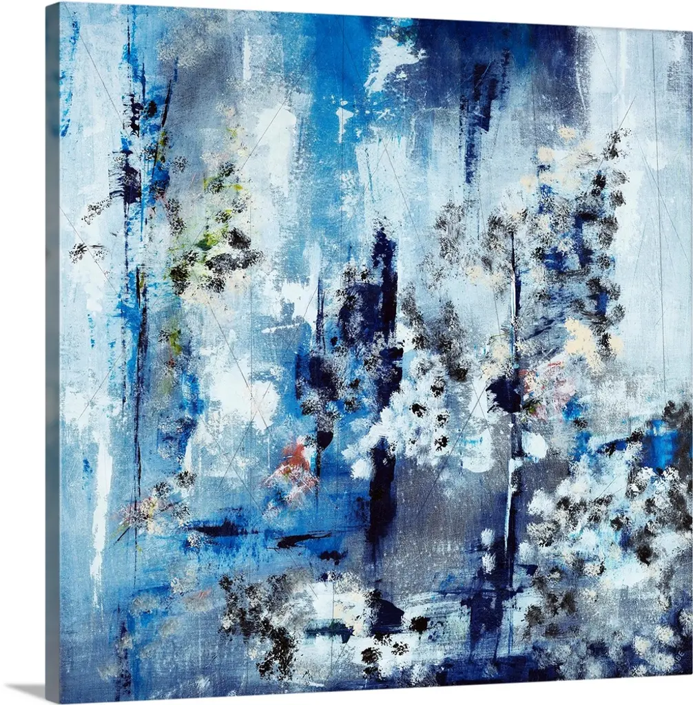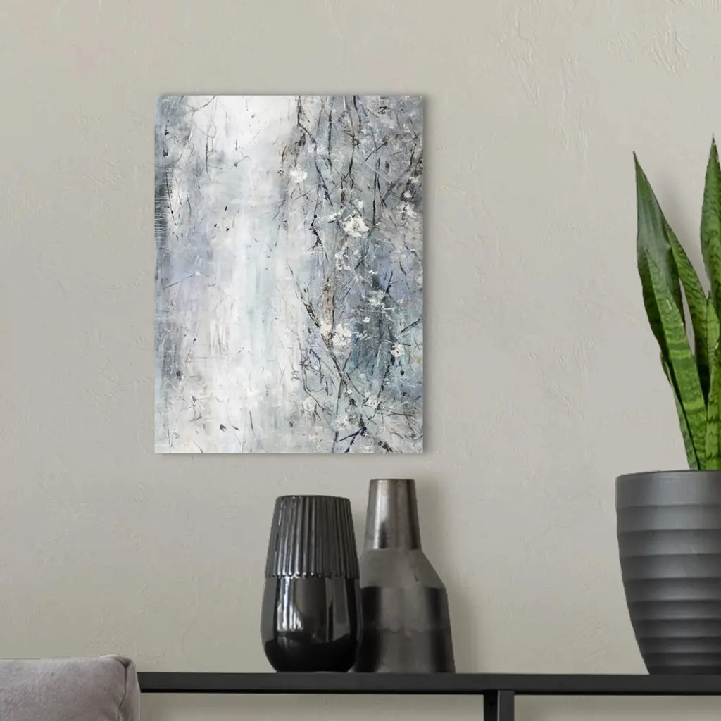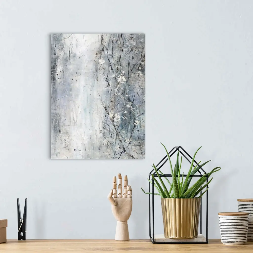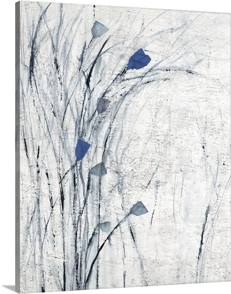 Contemporary abstract painting with vines of flowers on the running vertically on the right side of the canvas in shades of blue, gray, brown, and white.