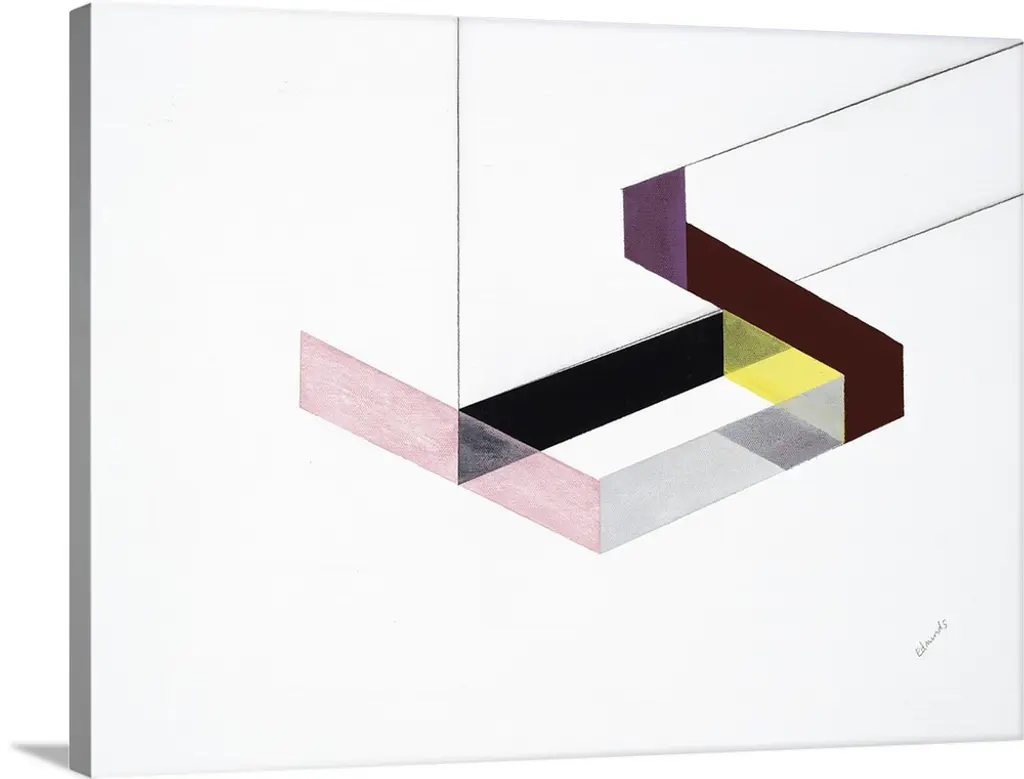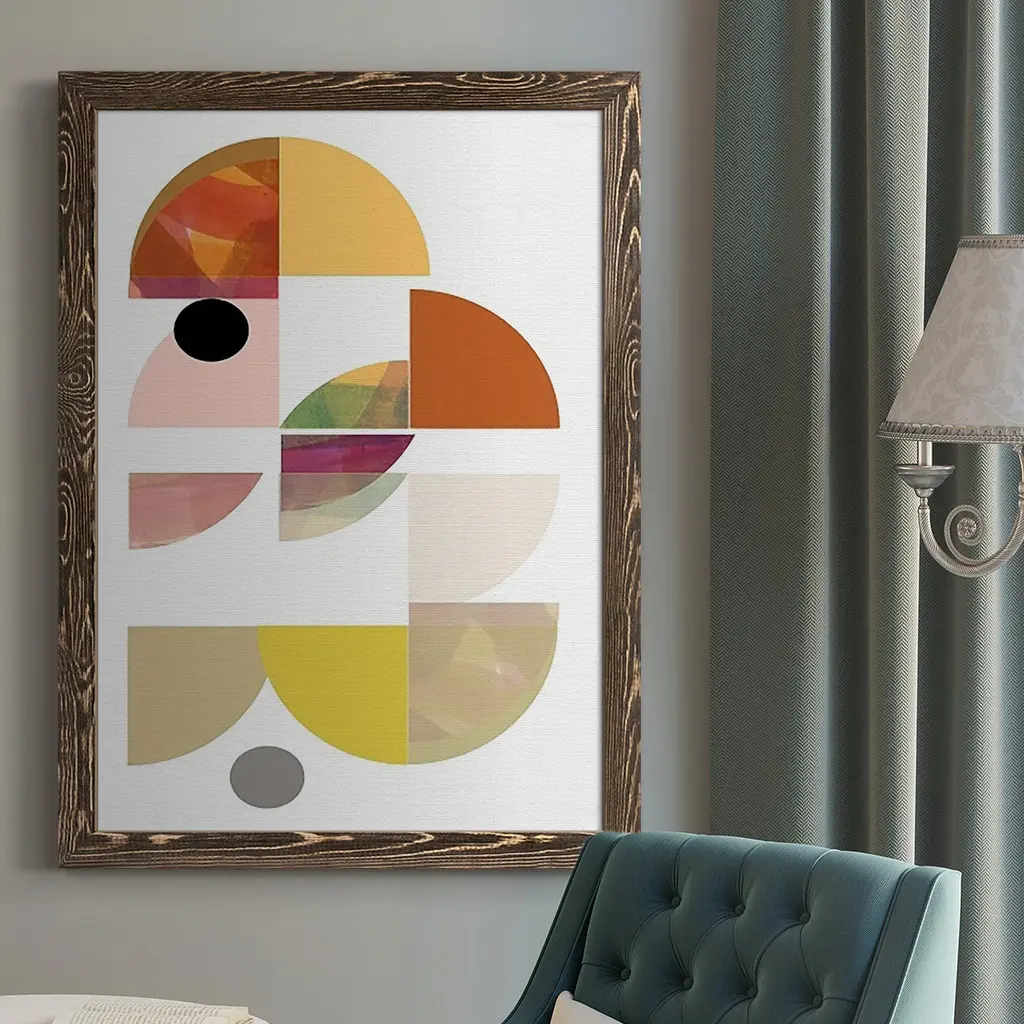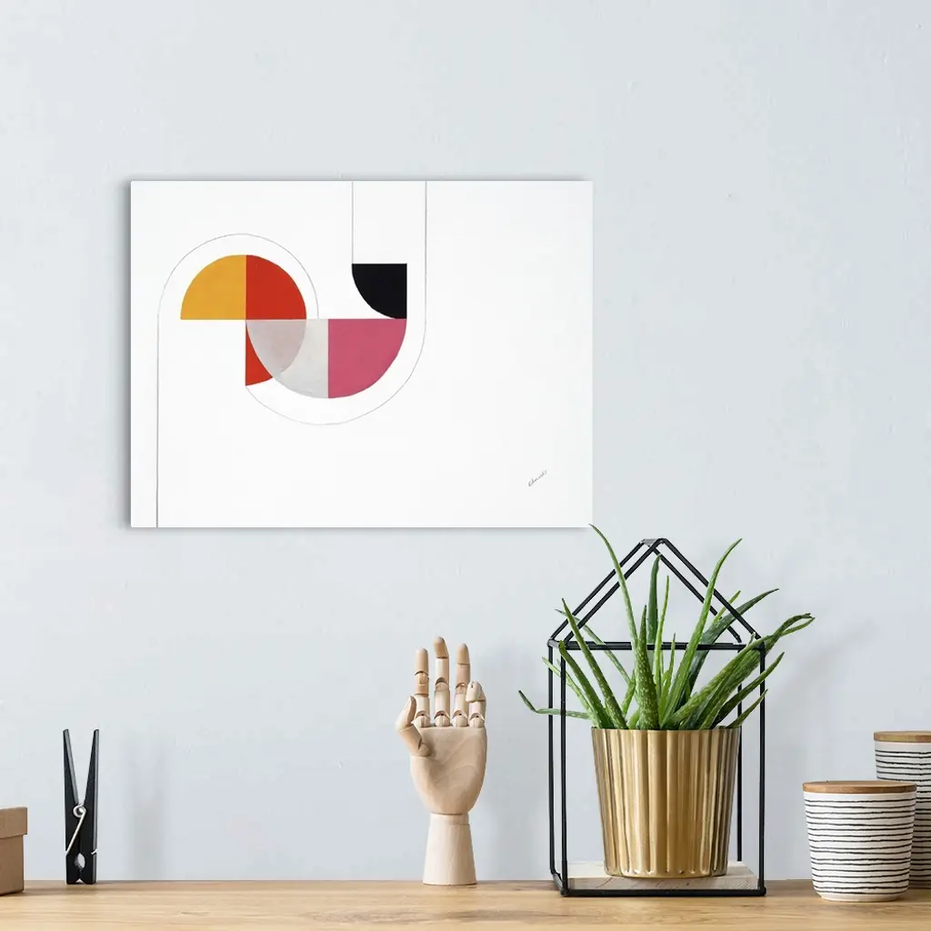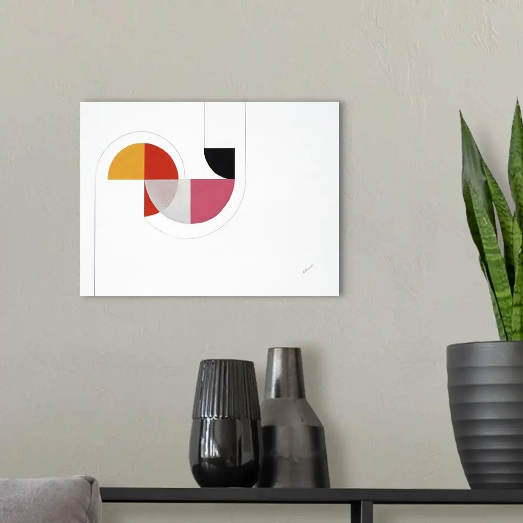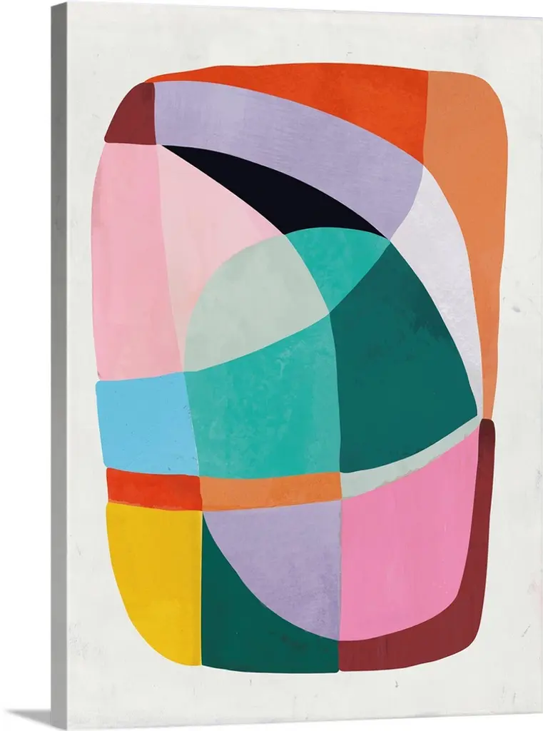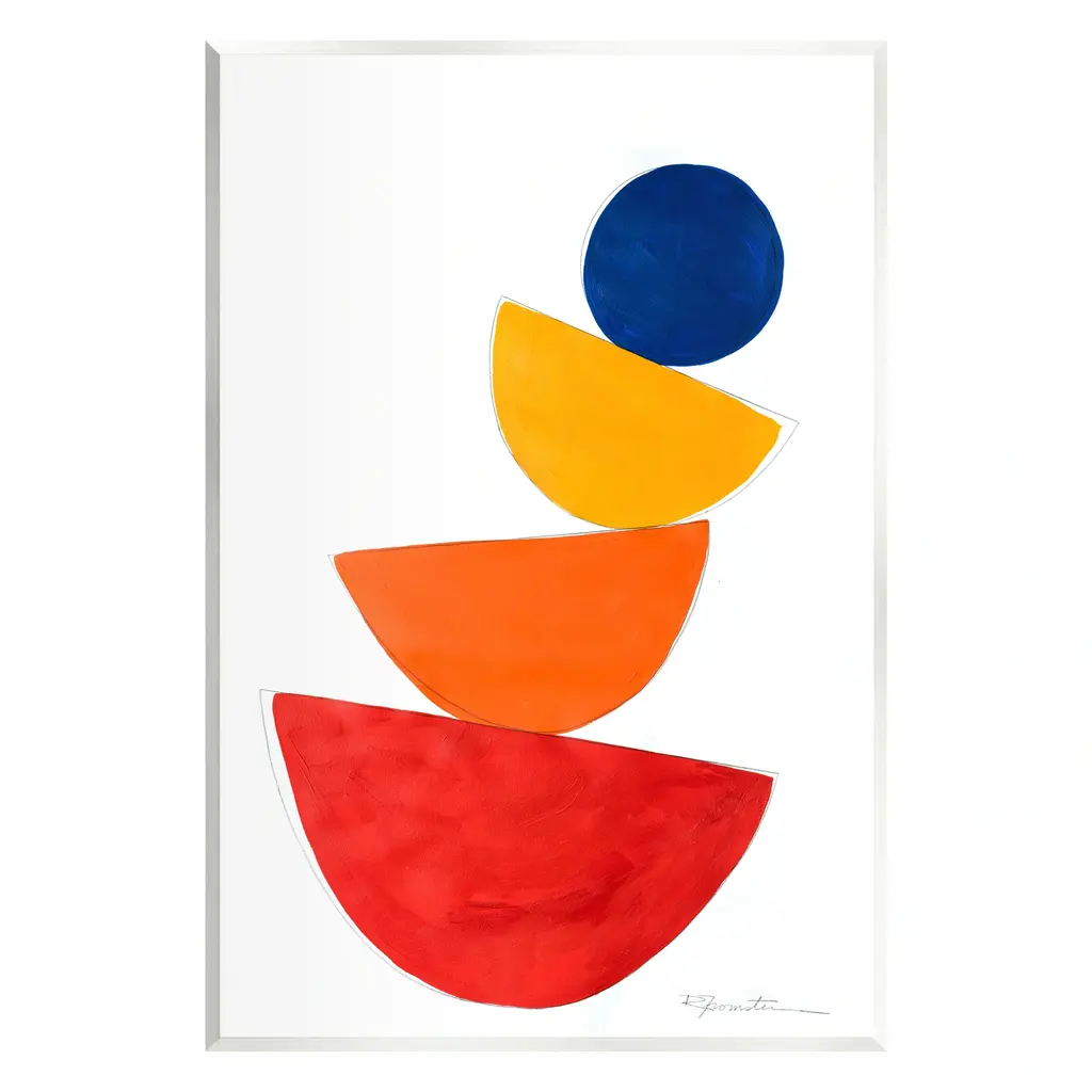 A simple painting of geometric shapes in a curve of warm colors of orange and yellow.