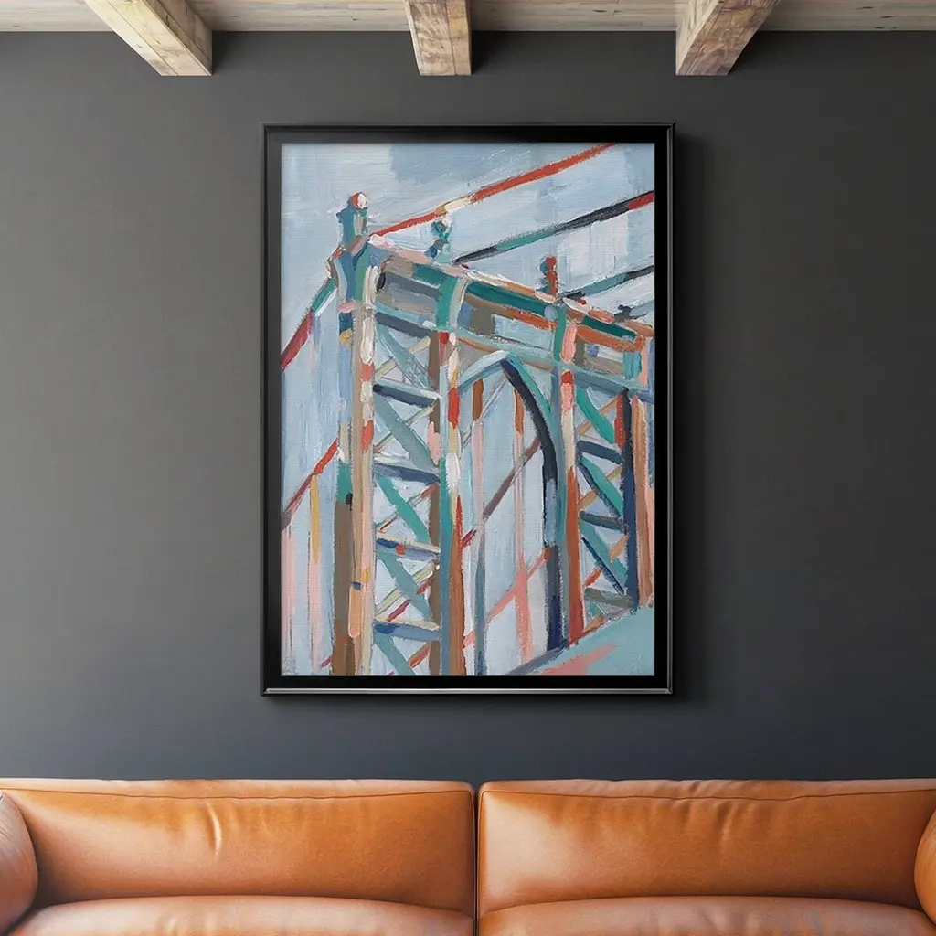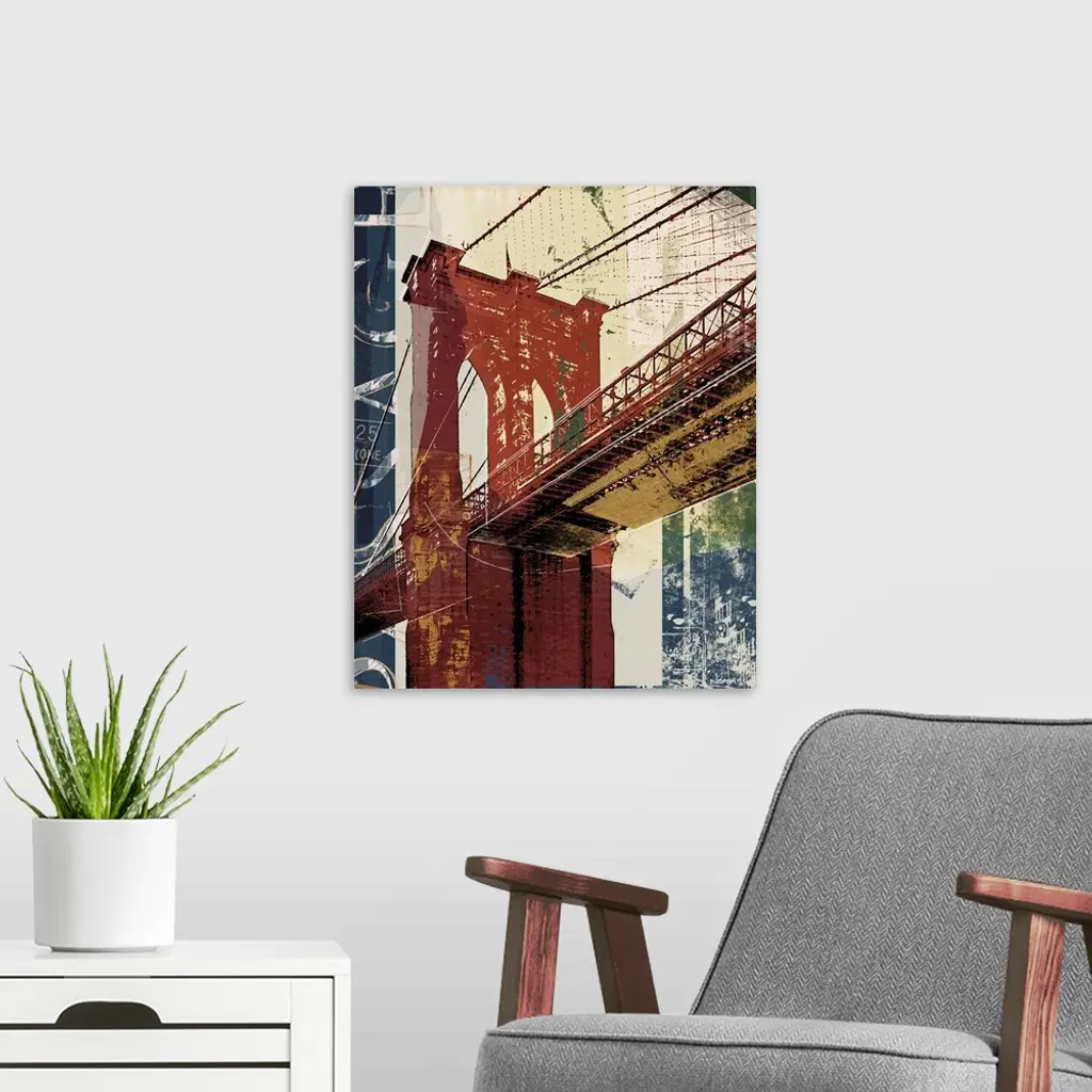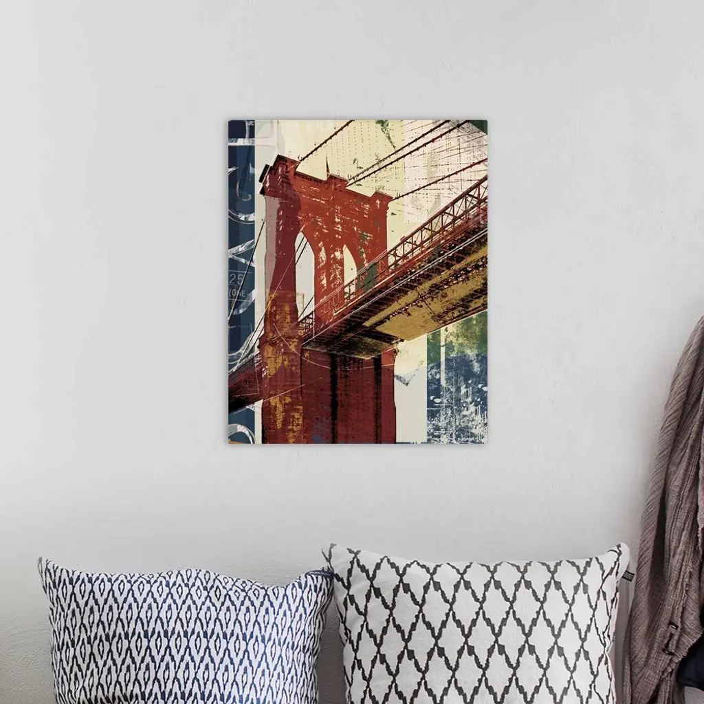 Contemporary artwork of a bridge into Manhattan in textures and vibrant colors.
