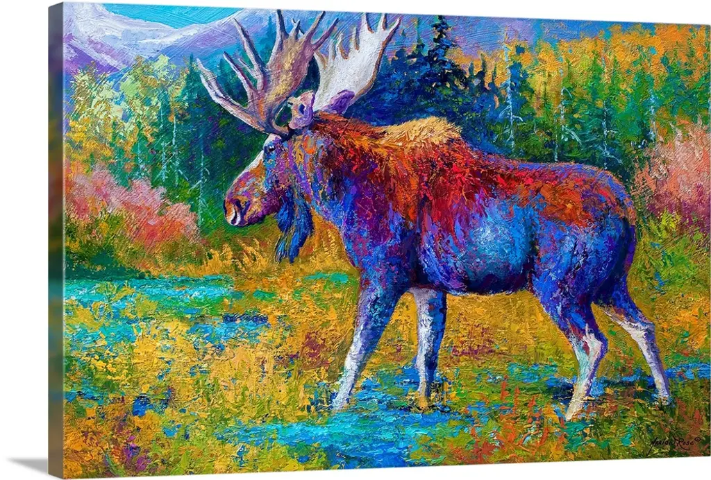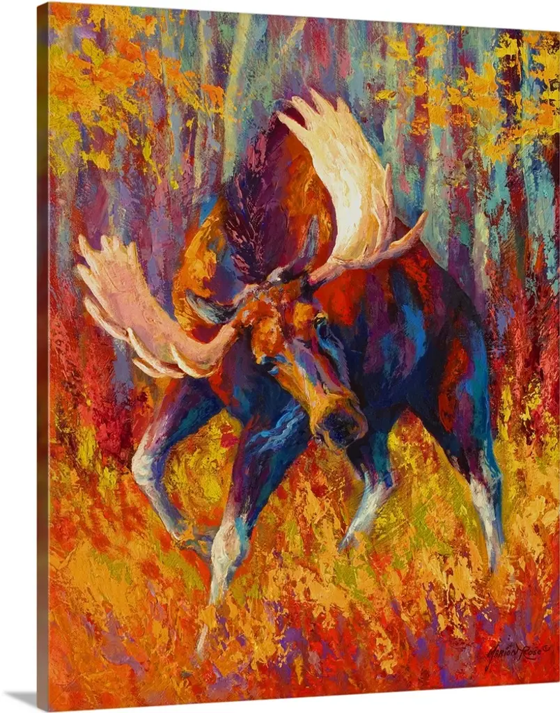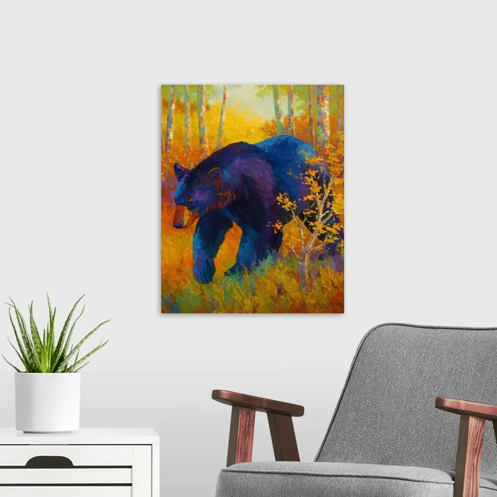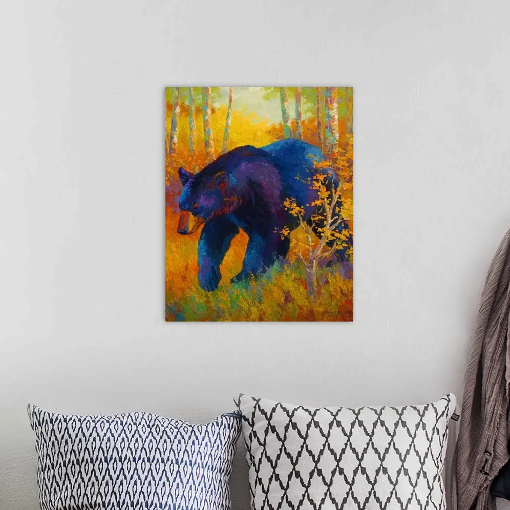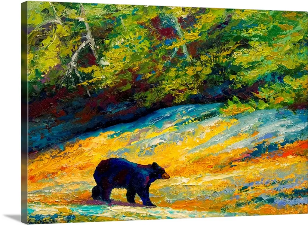 Large, portrait painting of a giant black bear walking through a clearing in a forest of brightly colored foliage. Painted with thick, textured brushstrokes, using a variety of bright colors.