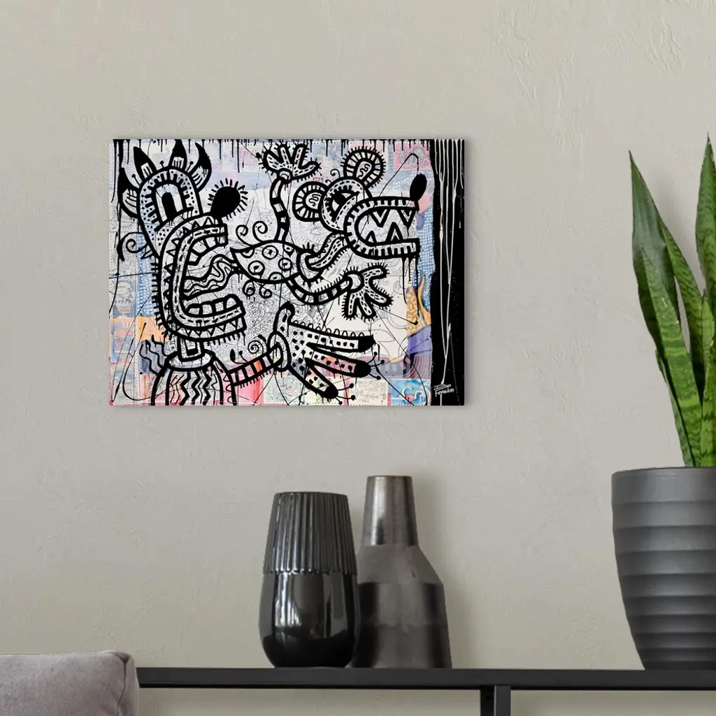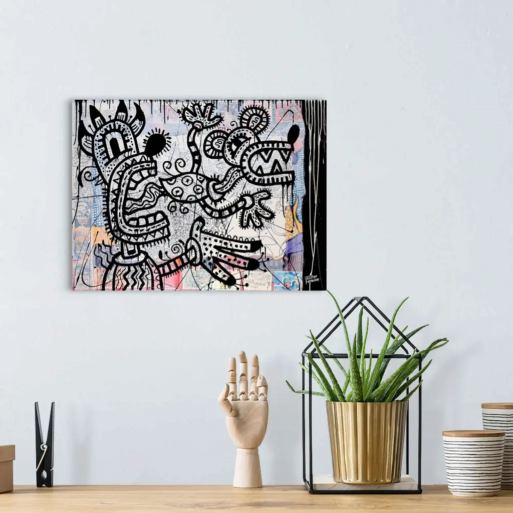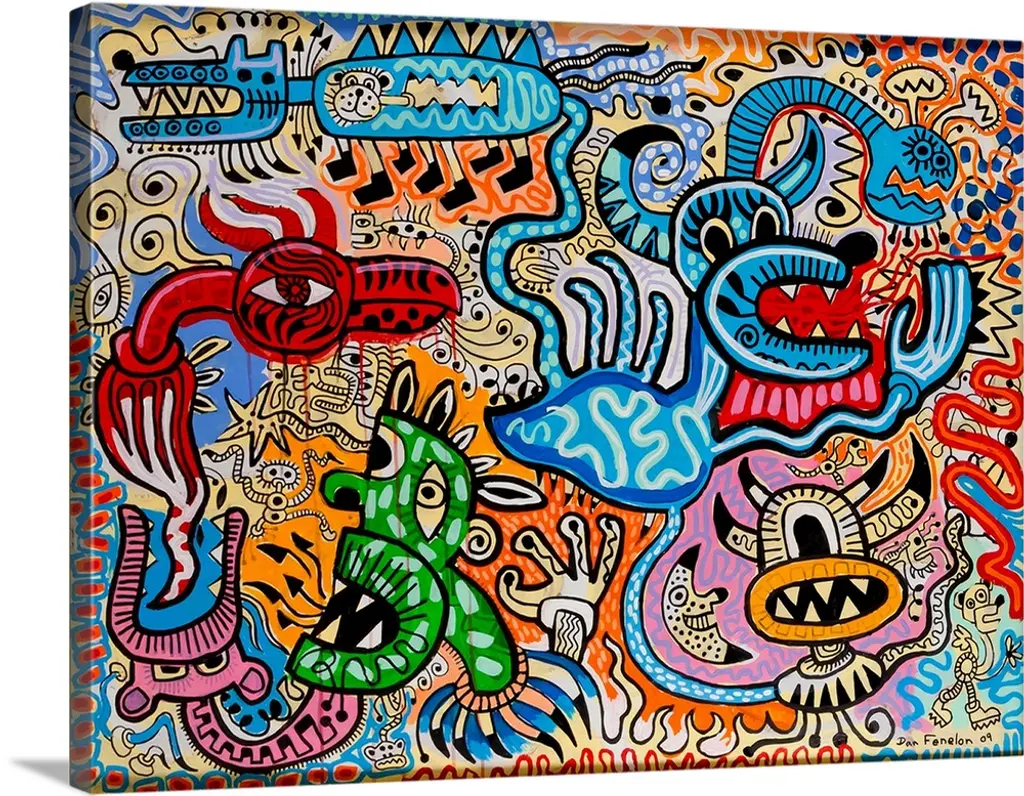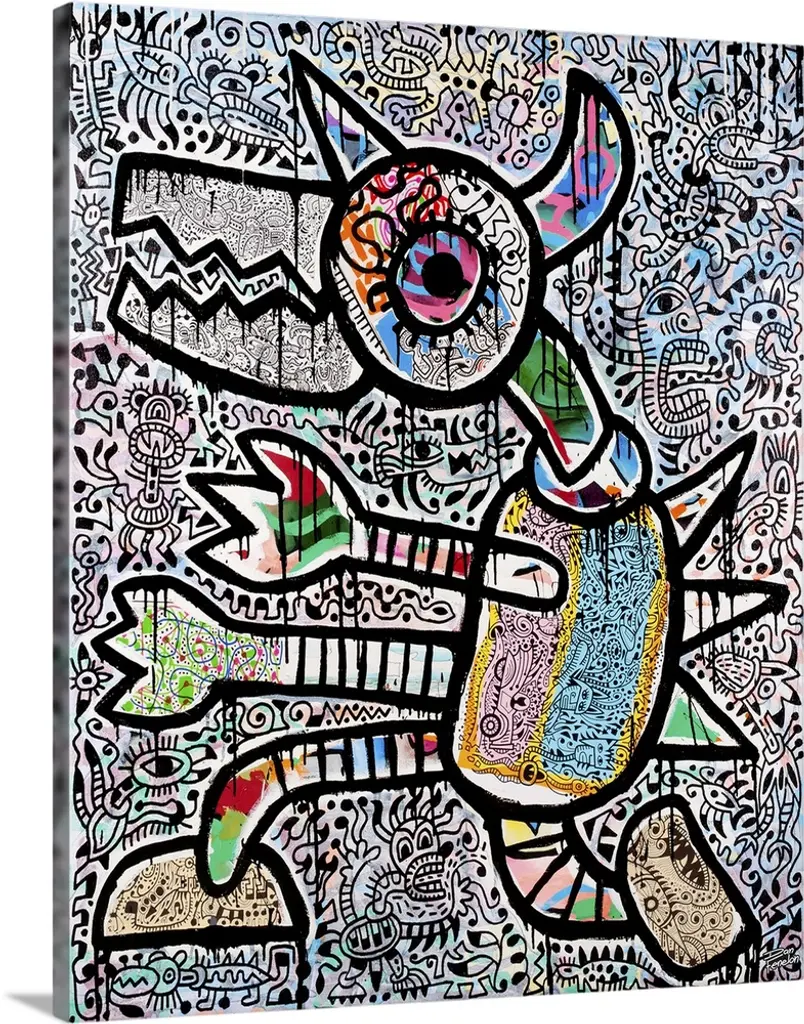Contemporary painting of a monster with a mouse like creature flying out of its mouth, against an abstract background.