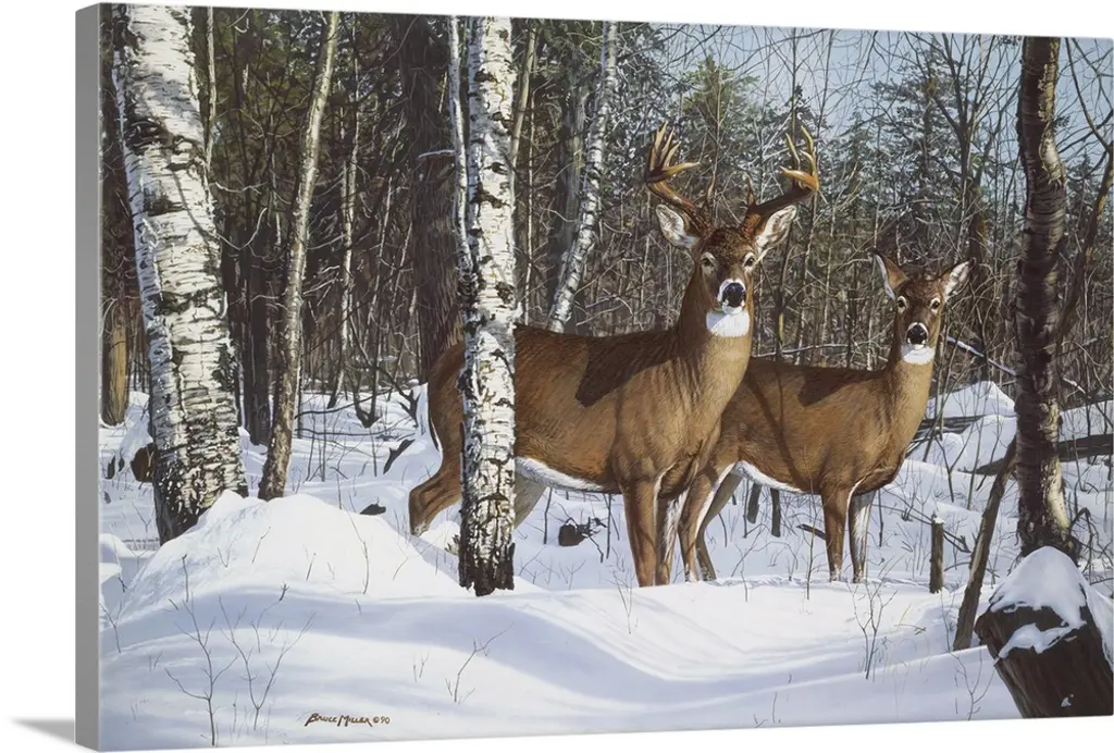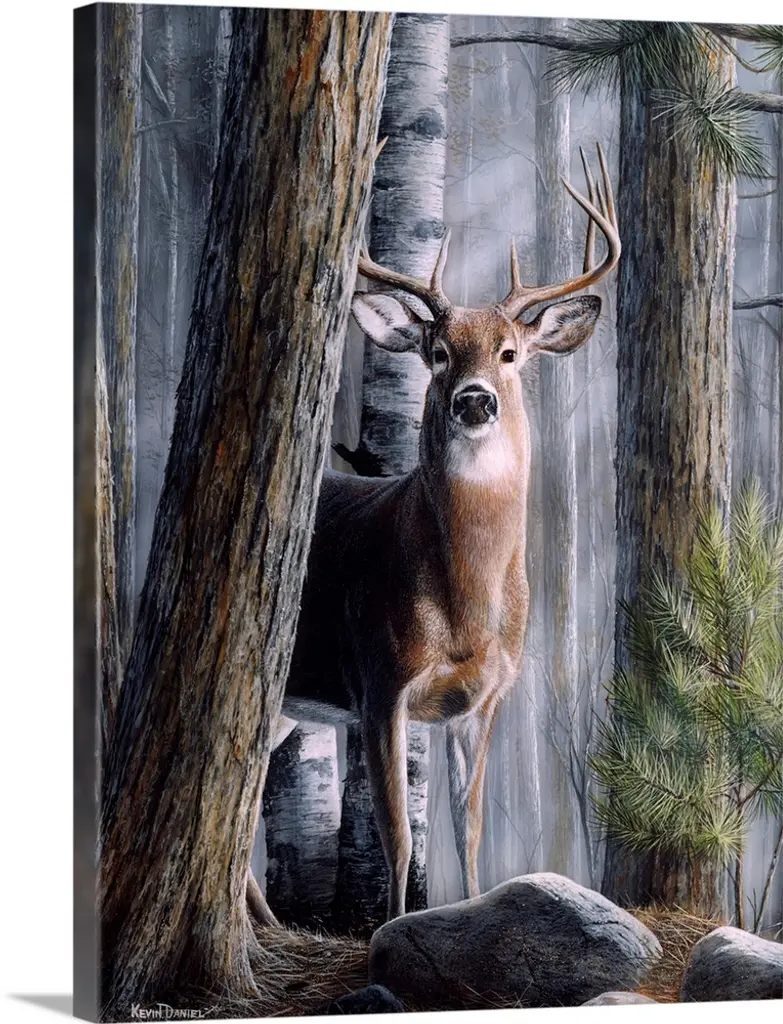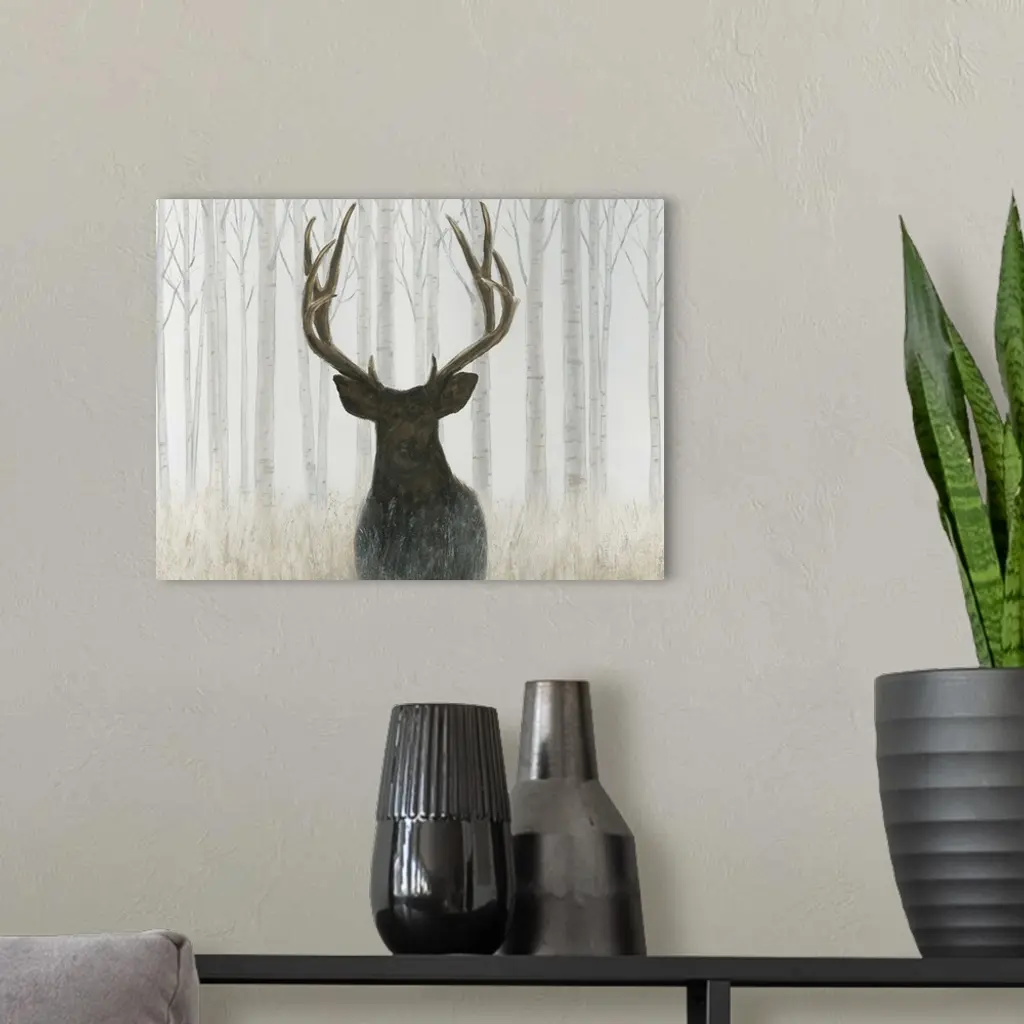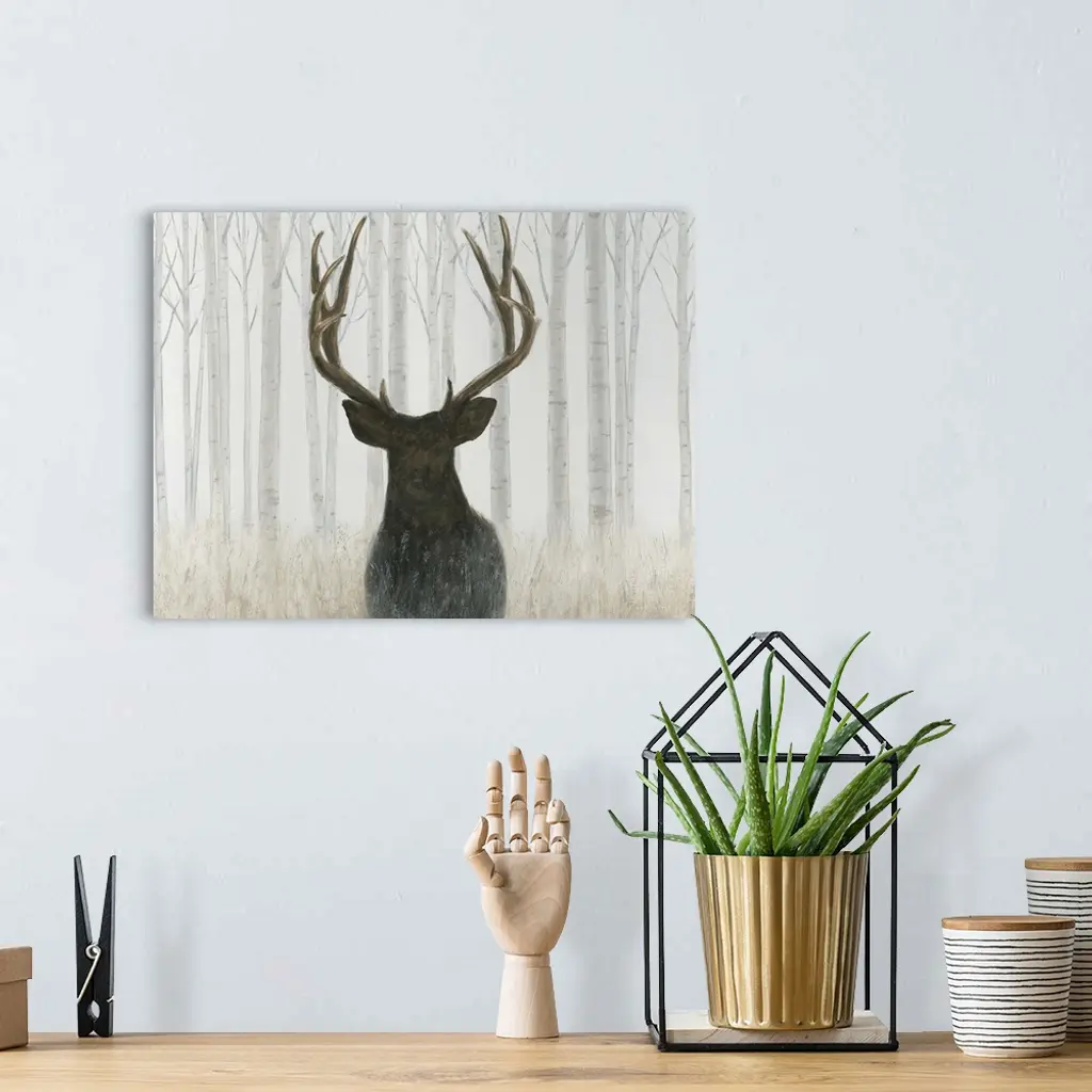 Contemporary painting of a deer silhouette with large antlers in a light forest.