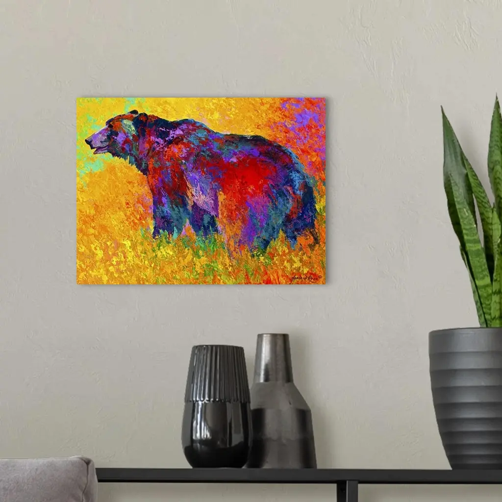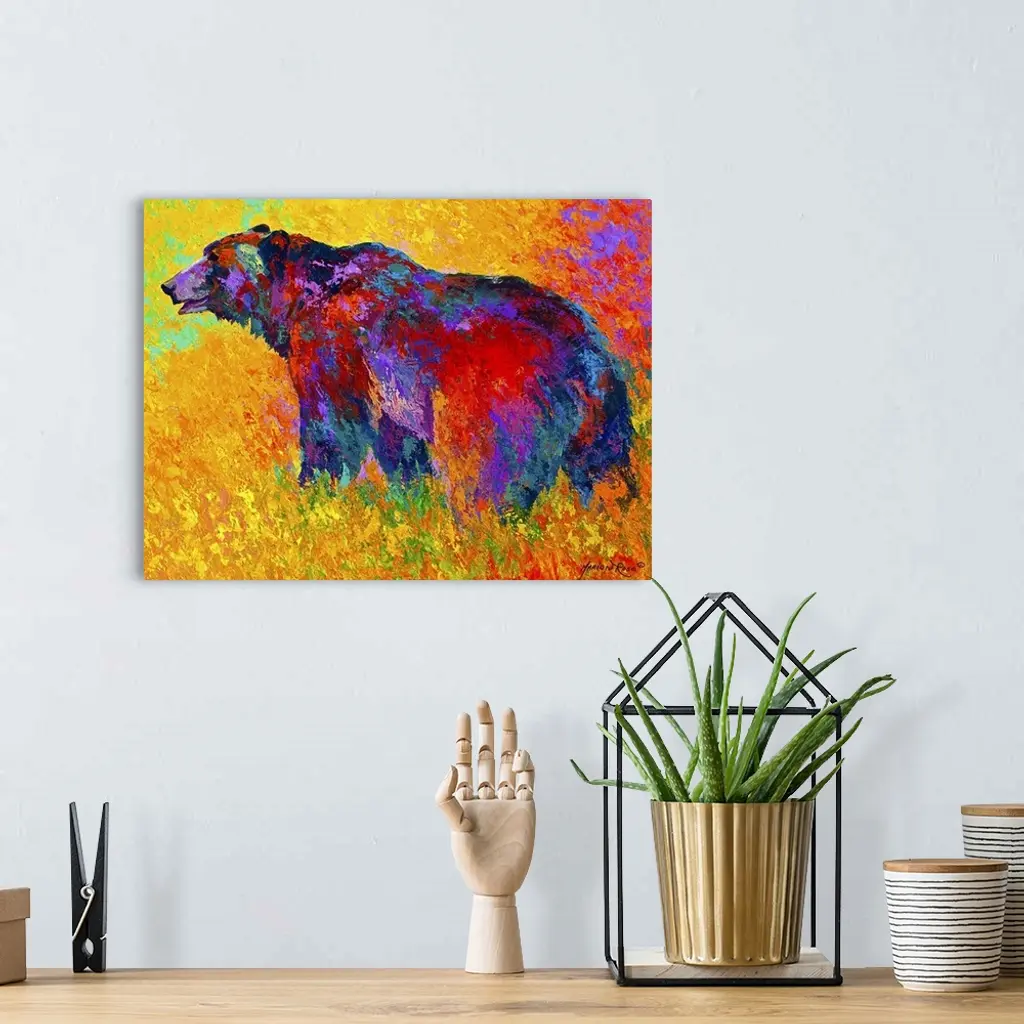 Abstract painting on canvas of a bear made up of multicolored brushstrokes.
