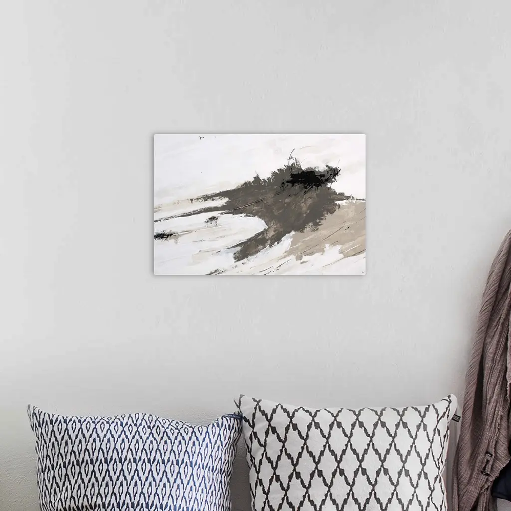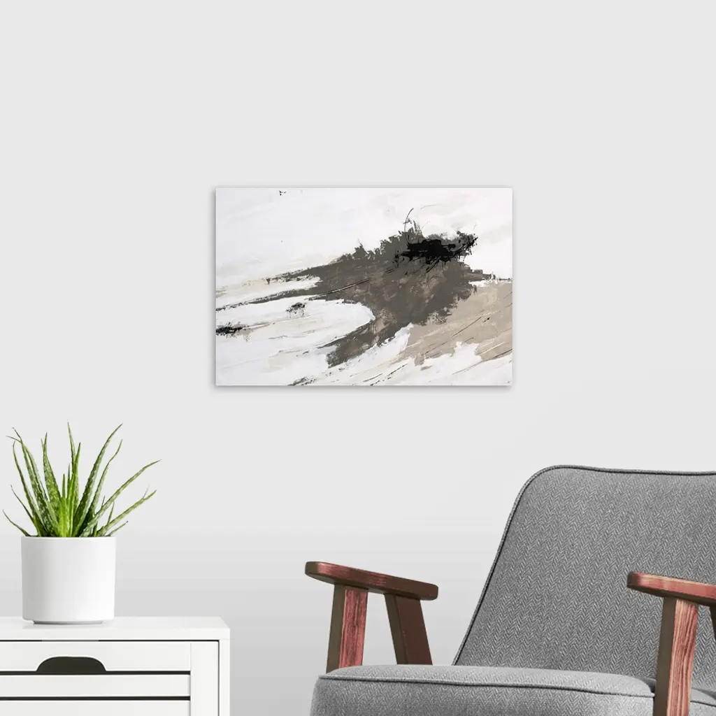 Abstract painting of two large grey masses that appear to be flying as they streak across the image.