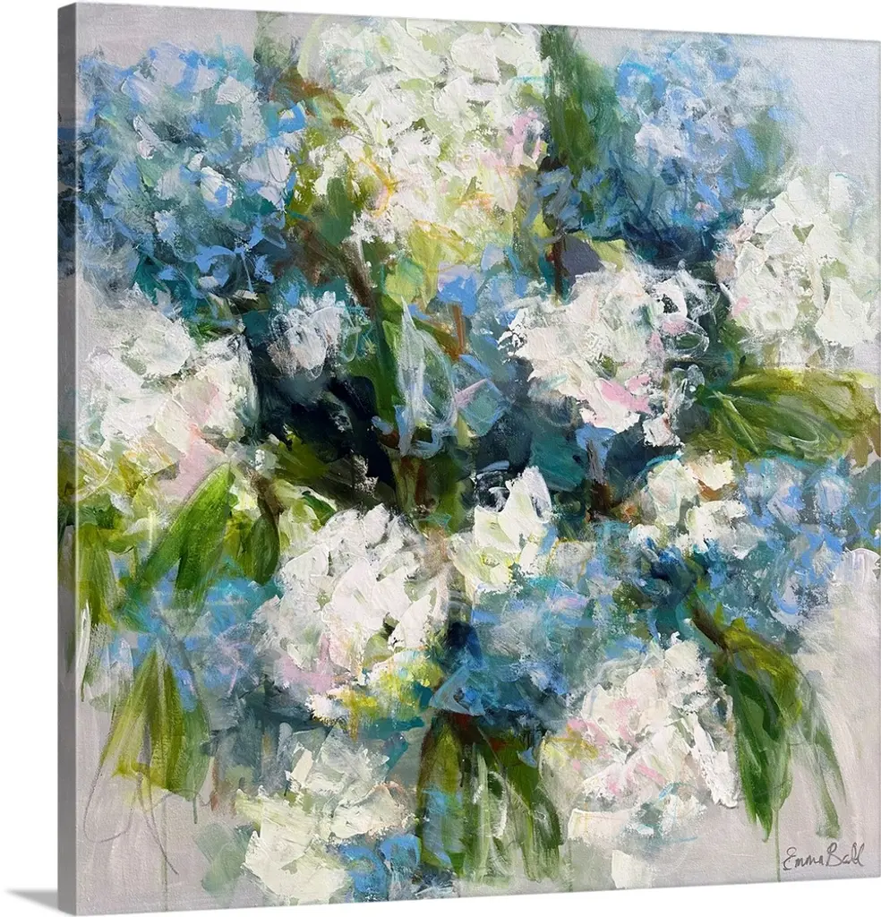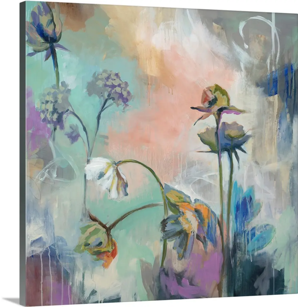 Decorative artwork of a group of light-colored flowers with wide petals and small leaves on a golden, textured background.