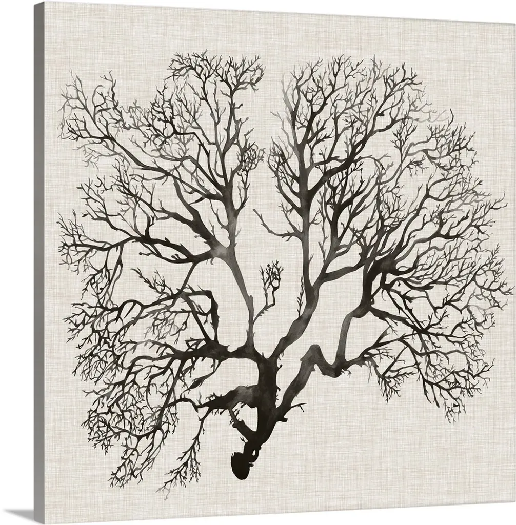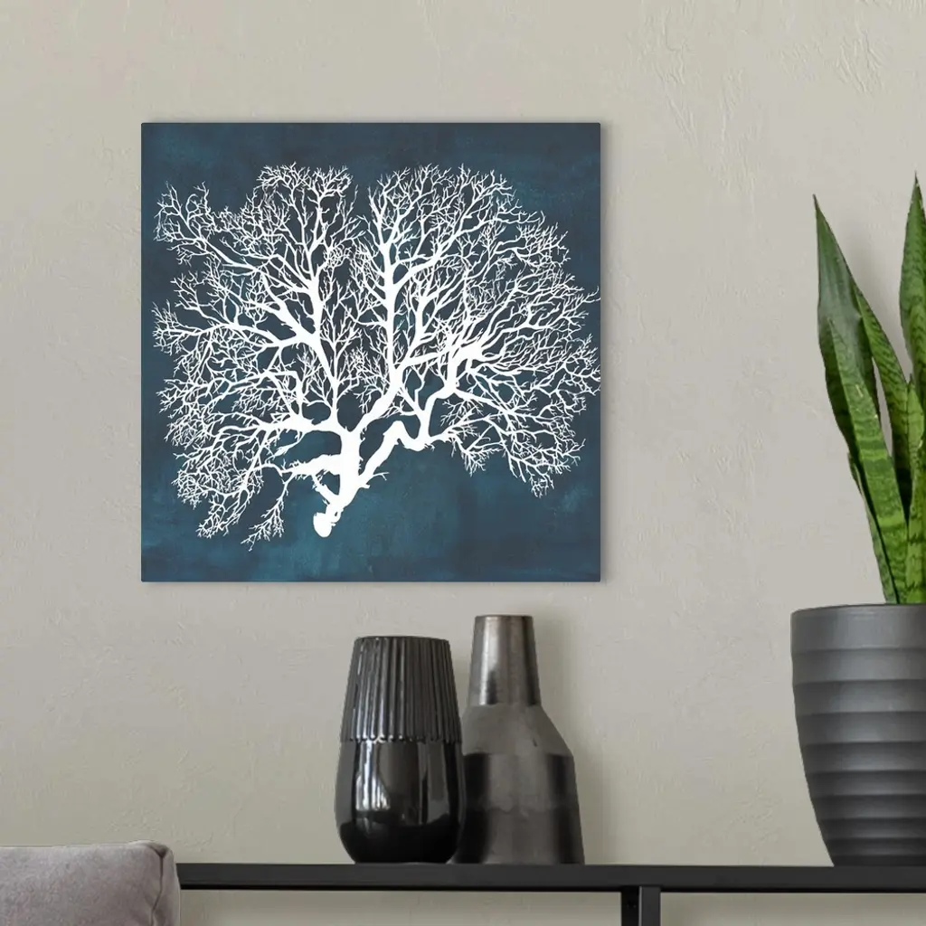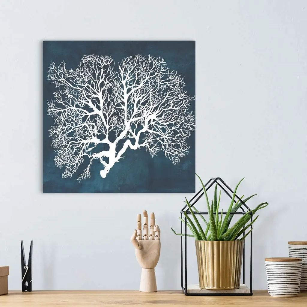 Contemporary nautical themed artwork of a sea fan in white against a dark navy blue background.