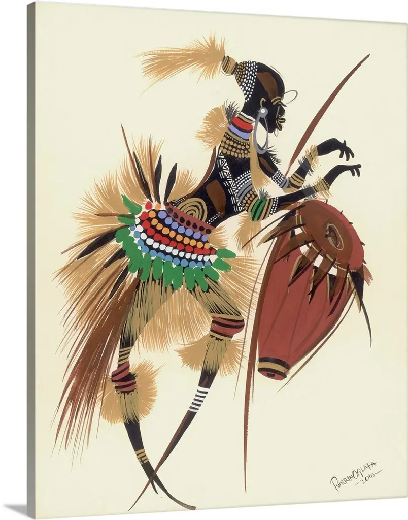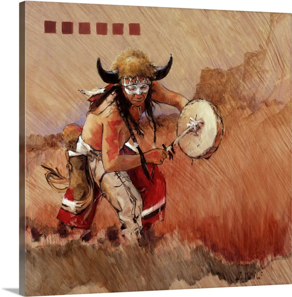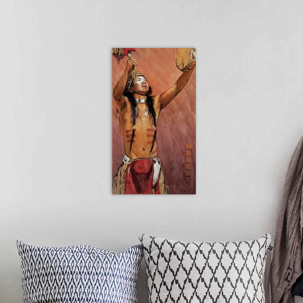 Contemporary western theme painting of a native American in traditional and ceremonial dress.