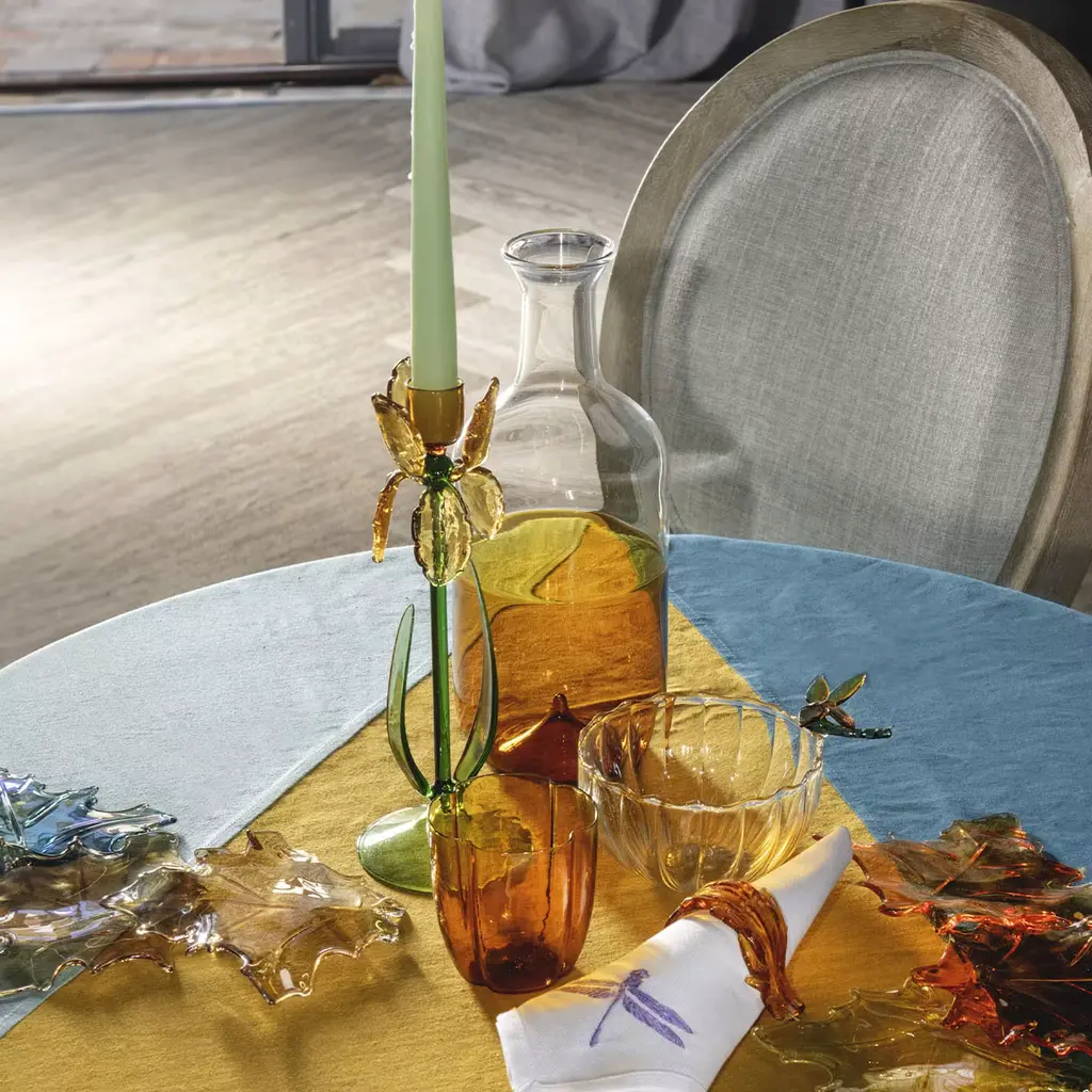 A superb design masterfully handcrafted of mouth-blown glass, this candle holder is created in co-creation with Summerill and Bishop London. From the sketch of Summerill and Bishop London and the work of Catherine Urban and the glass masters, sprout this co-creation collection of two candleholders: Iris and Lotus. Glass opens like a flower, holding in its center the space for a candlestick. Colors are light and delicate, in the nuances of spring nature.