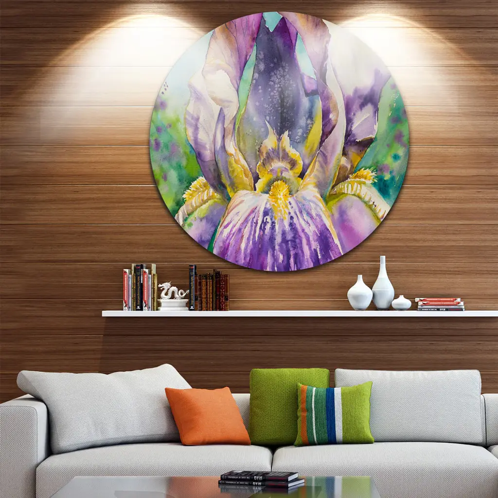 Bring Contemporary Abstraction to your home with this large Circle Metal wall art. This Iris Flower Close-up Metal Artwork makes it the focal point of any room or office. - White Gloss Coating ensures colors are extra vibrant with light reflection.- Aluminum grade Sheet Metal with 1 inch mounting frame on the back giving the illusion that the artwork is floating on the wall..- Mounting Brackets are included along with instructions.- High Quality Digital images are created directly into a glossy aluminum panel producing a stunning and captivating print into the glossy finish of the metal.- Water, Fire and Scratch resistant HD Aluminum panels.- Looks better than any photo paper and guaranteed to last at least 20 years- Easy to clean with a microfiber cloth. Colors are far superior to regular Canvas Art. - Easy to Hang