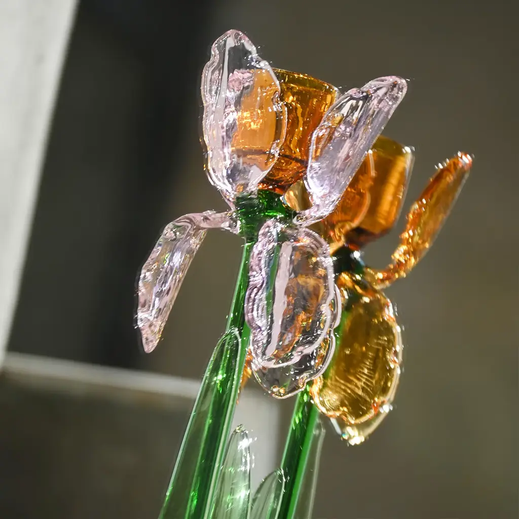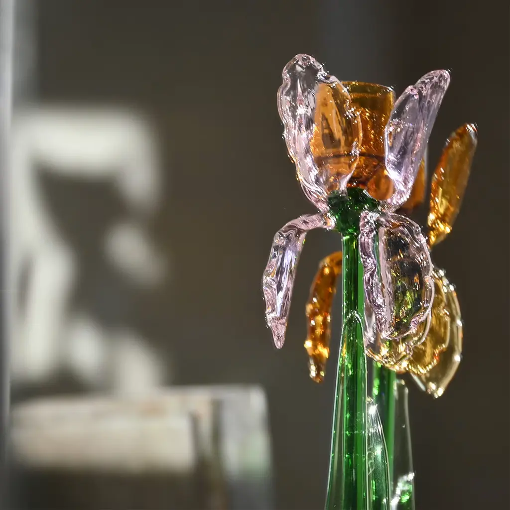 A superb design masterfully handcrafted of mouth-blown glass, this candle holder is created in co-creation with Summerill and Bishop London. From the sketch of Summerill and Bishop London and the work of Catherine Urban and the glass masters, sprout this co-creation collection of two candleholders: Iris and Lotus. Glass opens like a flower, holding in its center the space for a candlestick. Colors are light and delicate, in the nuances of spring nature.