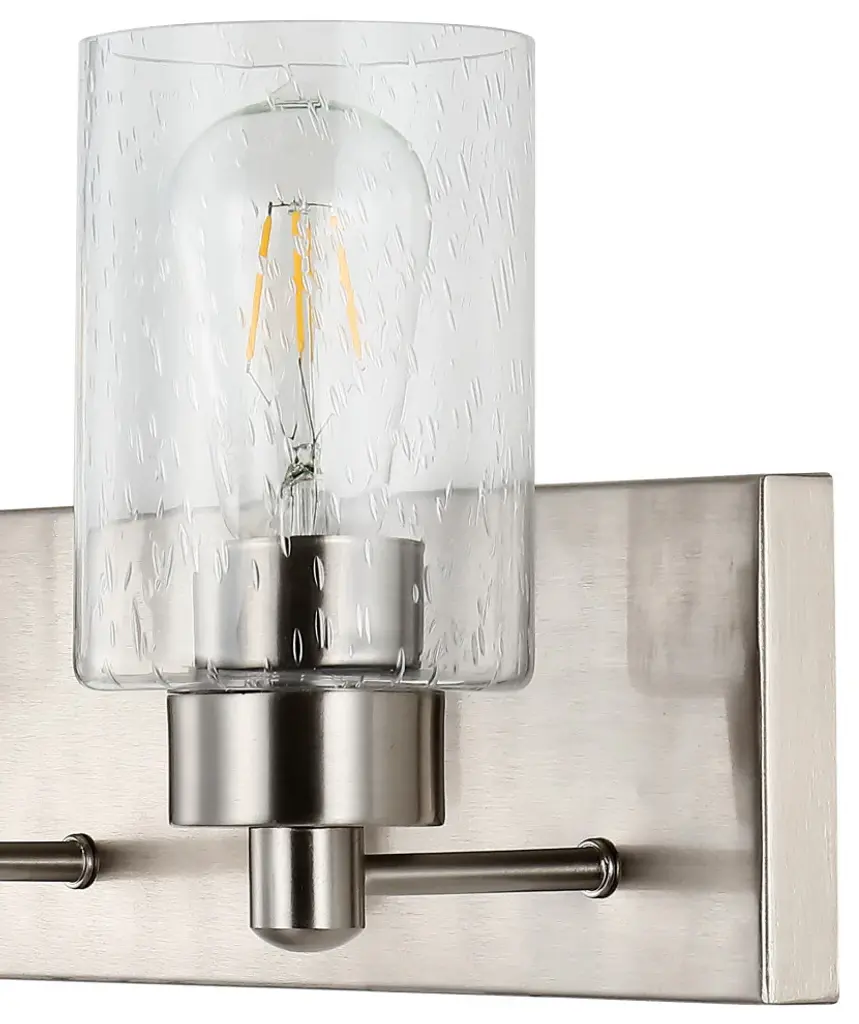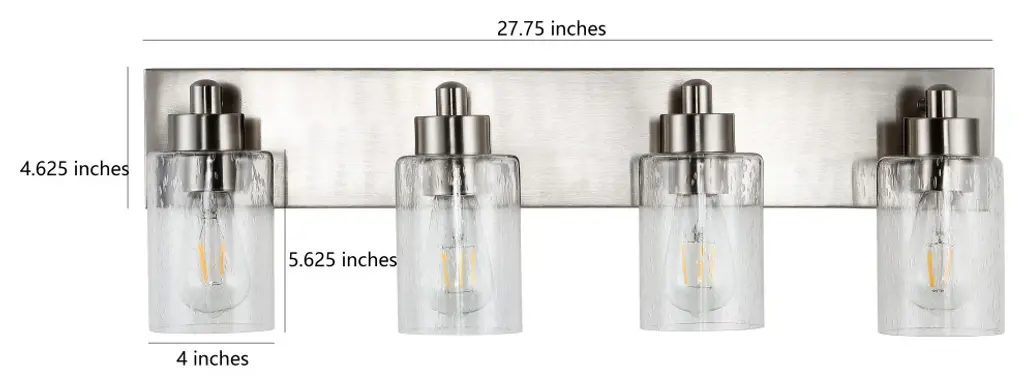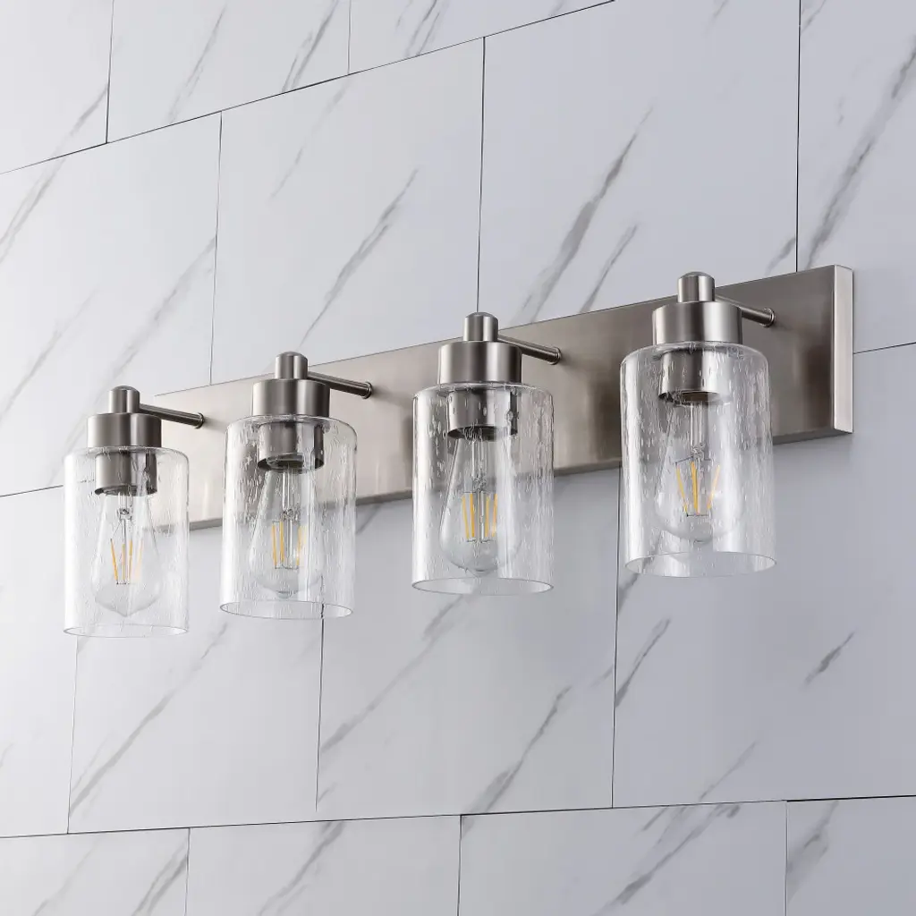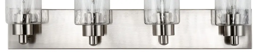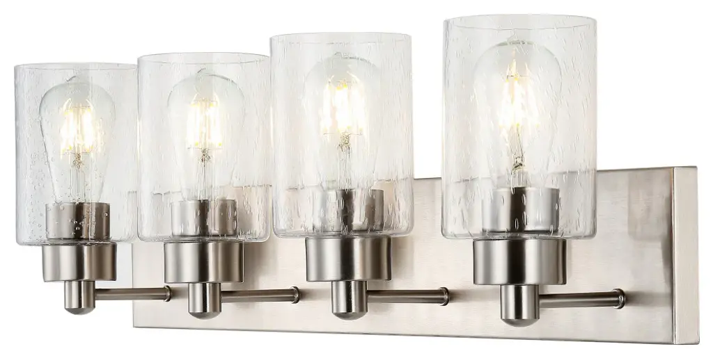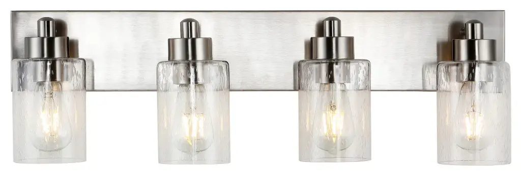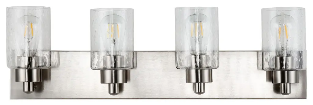 Elevate your bath vanity with our modern take on classic mid-century wall light. Four LED bulbs are included, casting a warm glow and providing plenty of light. The pewter-inspired nickel finish adds Art Deco sparkle, and clear bubble-glass shades add to the elegant vintage style. This vanity light can be installed either facing up or down.-Replace outdated wall sconces or vanity lights with this modern classic for an instant French-inspired makeover-This 4-light fixture is perfect for a single sink in a large bathroom; or use one over each sink on a double vanity-Our light fixtures work with LED-compatible dimmers; professional installation is recommended.-Eco-friendly 9W LED bulb included-Takes 4 bulbs and compatible with Type "A" 40W or CFL 13W or LED 9W-Color Temperature: 2700K-CRI: 80-Color: Nickel with clear shade-Body Material: Iron/Glass-Includes: One (1) lamp-Assembly Required-Lamp: 8.25 inches high x 27.75 inches wide x 6 inches deep-Shade: 5.63 inches high x 4 inches wide x 4 inches deepYou see a lamp.We see a decorative work of art.A perfectly curved shade casts a dramatic shadow on a floor. Compatible with LED lightbulbs: as easy on the environment as they are on the eyes. The JONATHAN Y Lighting collection considers every detail from impeccably sourced materials to designer styling. And our prices are so attractive, we''ve transformed a functional necessity into a fashion accessory.JONATHAN Y Lighting - a fashion revolution in home decor.