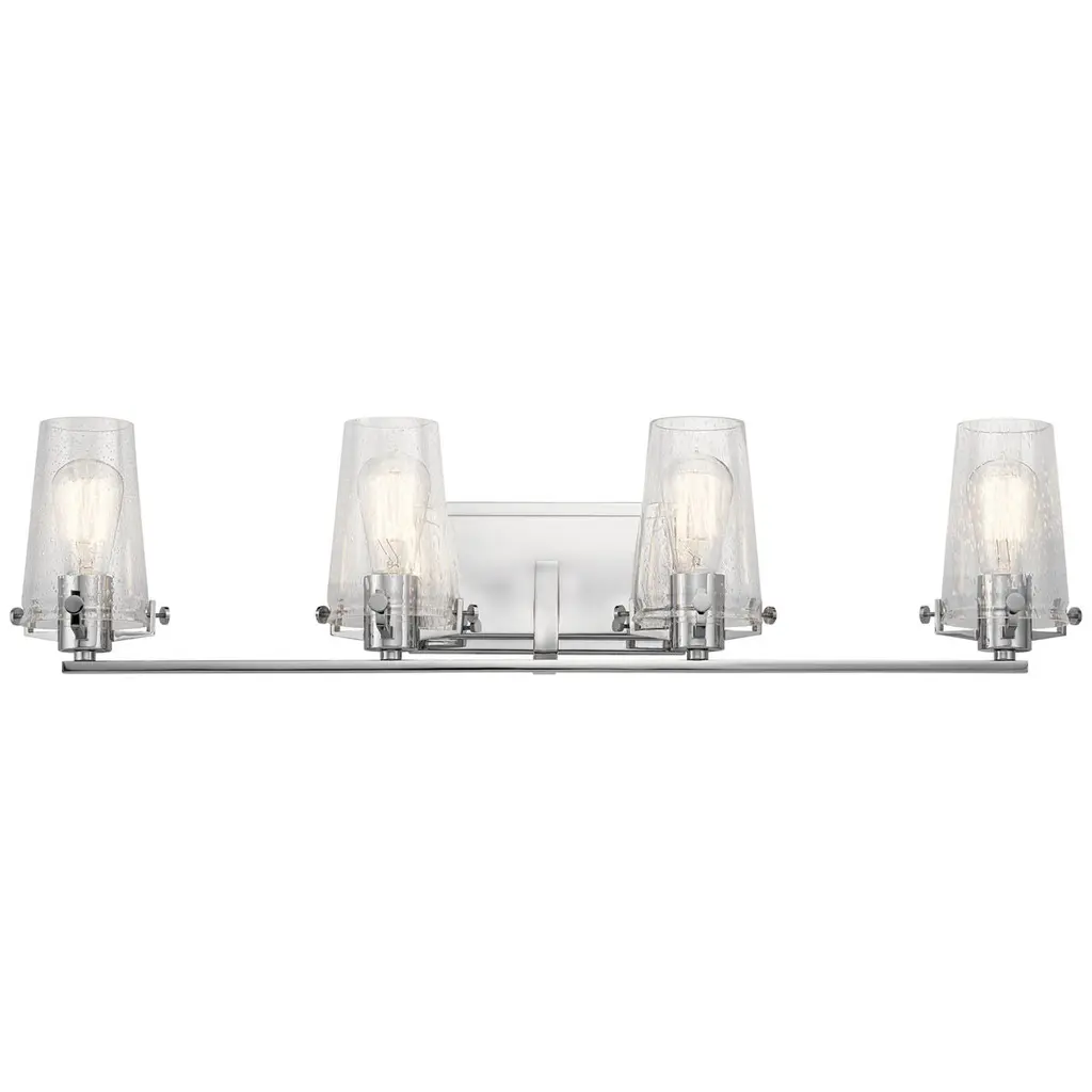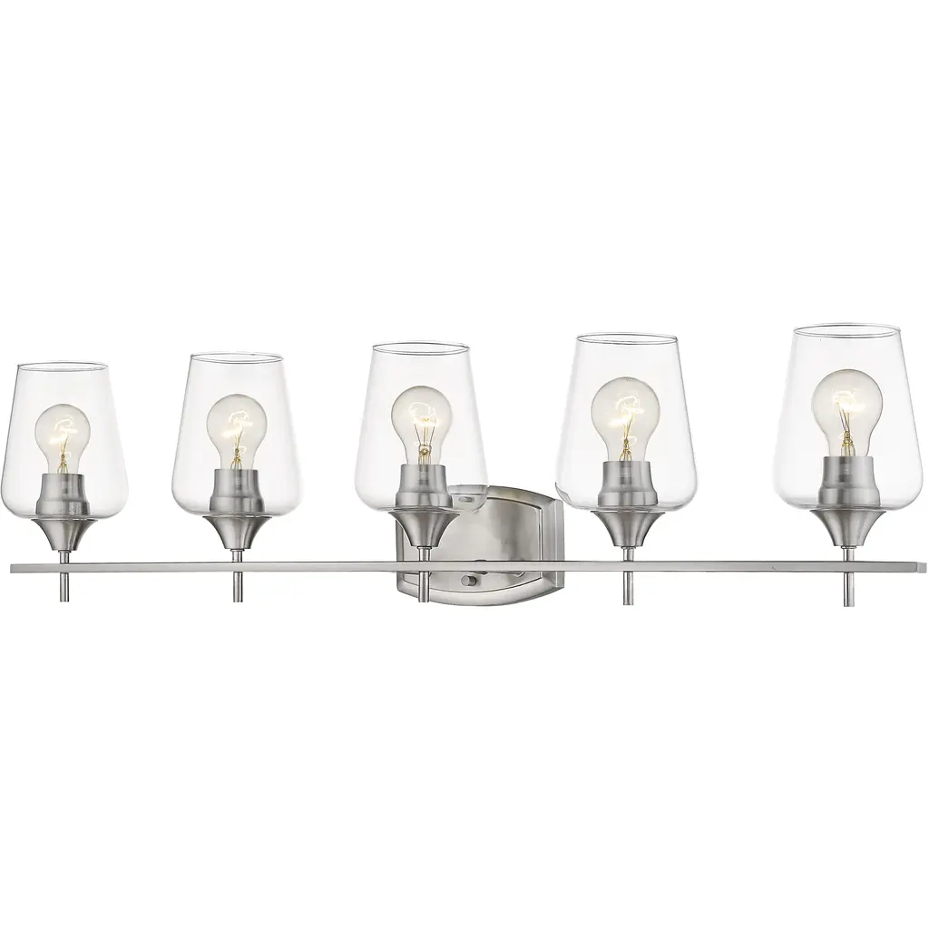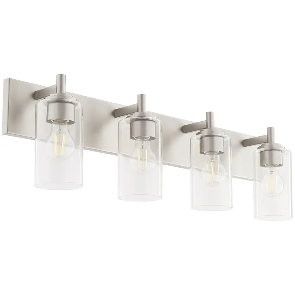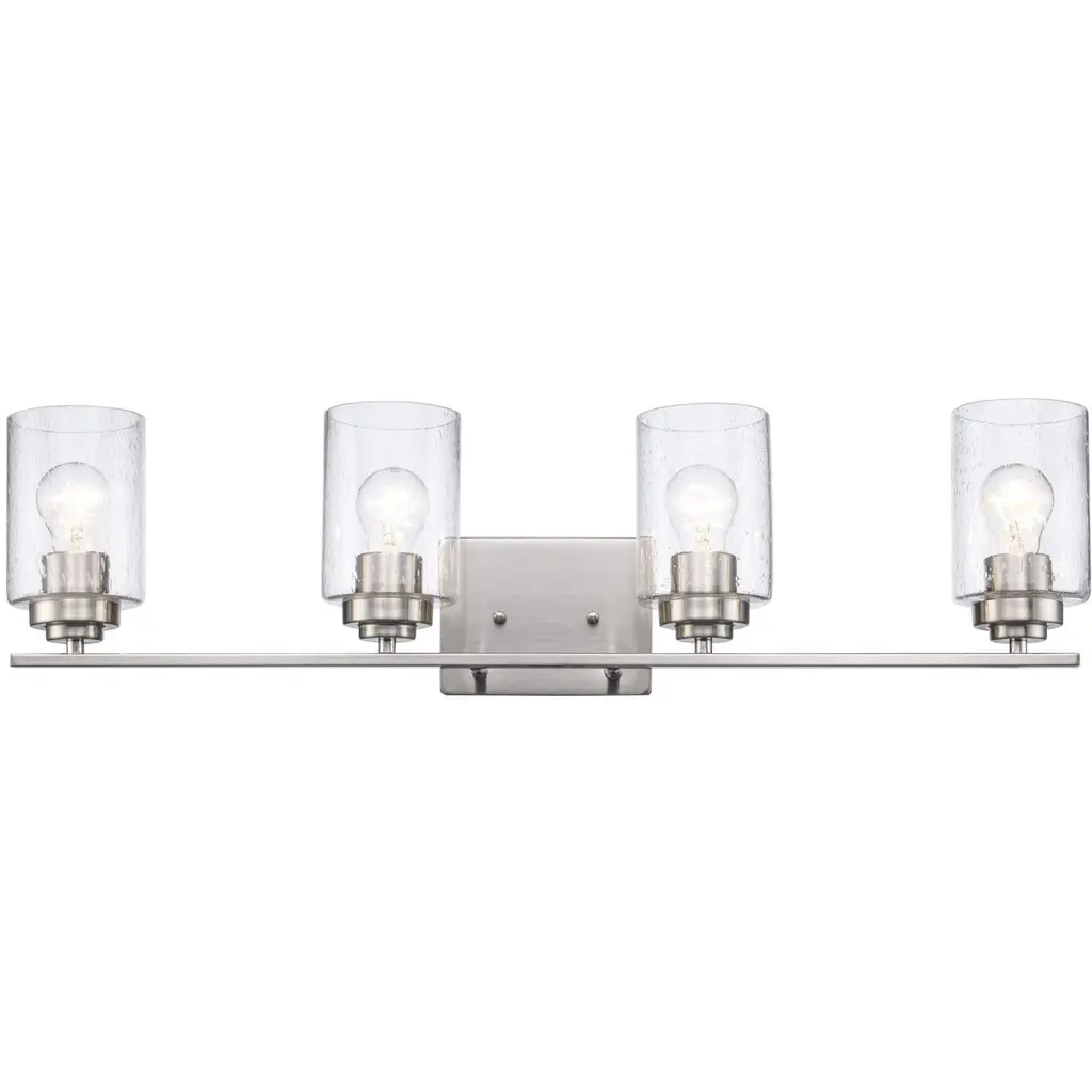 Elevate your bath vanity with our modern take on classic mid-century wall light. Four LED bulbs are included, casting a warm glow and providing plenty of light. The pewter-inspired nickel finish adds Art Deco sparkle, and clear bubble-glass shades add to the elegant vintage style. This vanity light can be installed either facing up or down.-Replace outdated wall sconces or vanity lights with this modern classic for an instant French-inspired makeover-This 4-light fixture is perfect for a single sink in a large bathroom; or use one over each sink on a double vanity-Our light fixtures work with LED-compatible dimmers; professional installation is recommended.-Eco-friendly 9W LED bulb included-Takes 4 bulbs and compatible with Type "A" 40W or CFL 13W or LED 9W-Color Temperature: 2700K-CRI: 80-Color: Nickel with clear shade-Body Material: Iron/Glass-Includes: One (1) lamp-Assembly Required-Lamp: 8.25 inches high x 27.75 inches wide x 6 inches deep-Shade: 5.63 inches high x 4 inches wide x 4 inches deepYou see a lamp.We see a decorative work of art.A perfectly curved shade casts a dramatic shadow on a floor. Compatible with LED lightbulbs: as easy on the environment as they are on the eyes. The JONATHAN Y Lighting collection considers every detail from impeccably sourced materials to designer styling. And our prices are so attractive, we''ve transformed a functional necessity into a fashion accessory.JONATHAN Y Lighting - a fashion revolution in home decor.