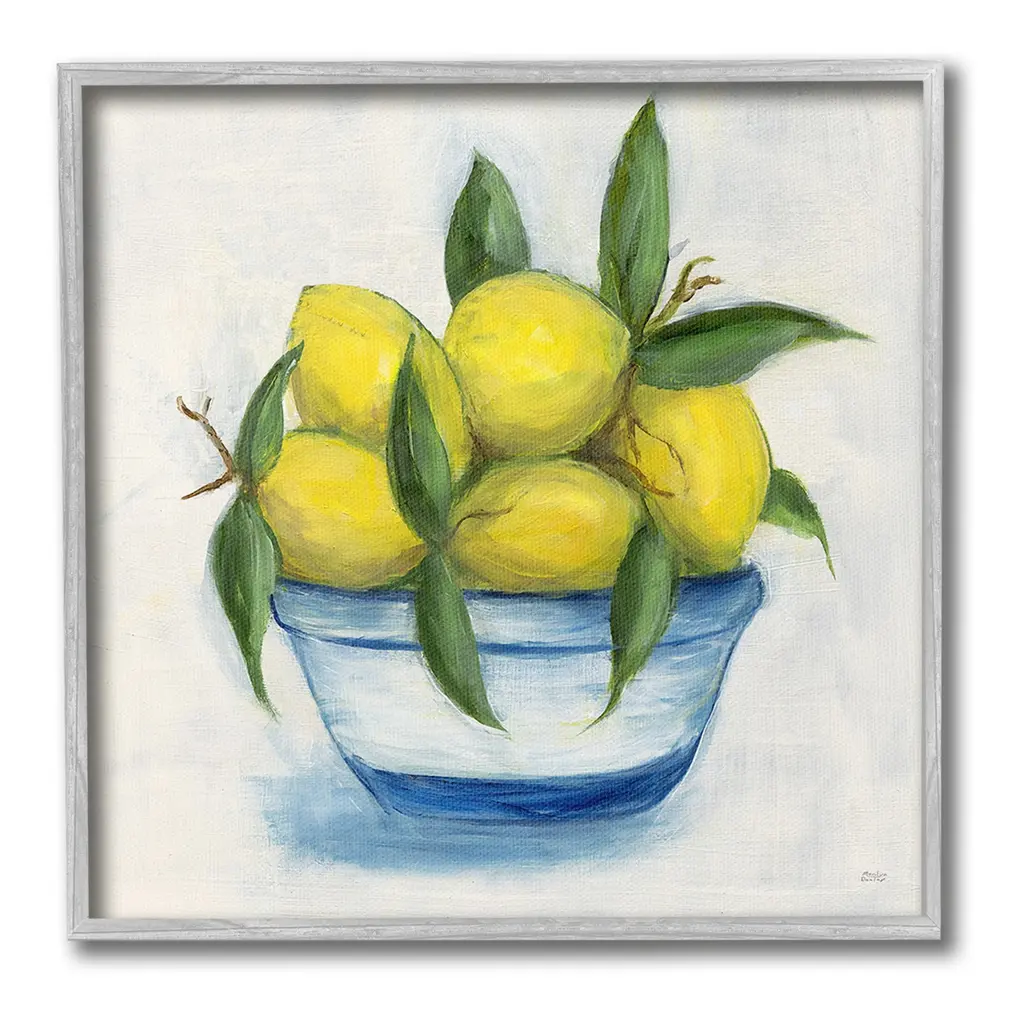 Lemons by Isabelle Z is a high quality piece of framed artwork. The finished size of this piece is 22" X 22". It has a Classic Champagne Silver with Ornate Inner Edge frame, is single matted and finished with high quality Acrylic Plexiglass.