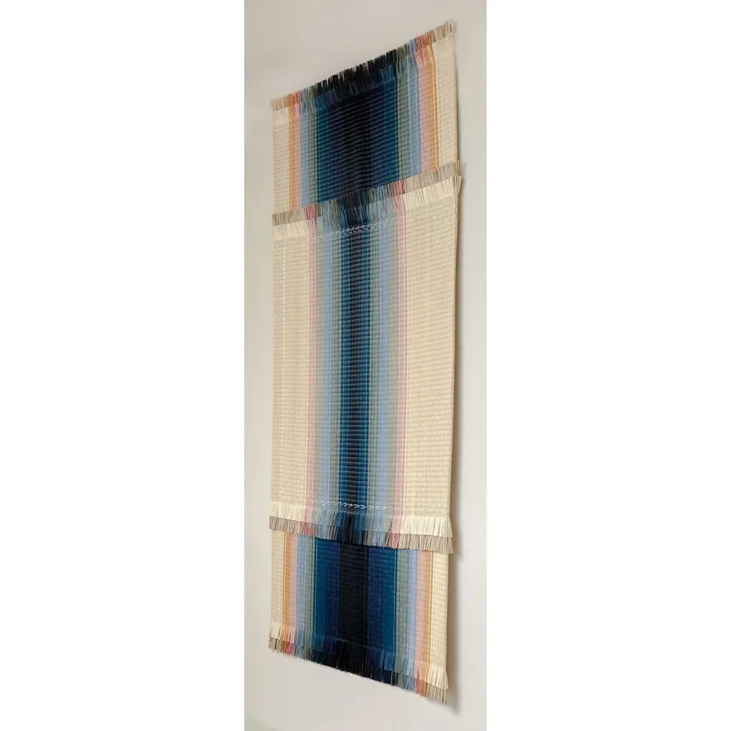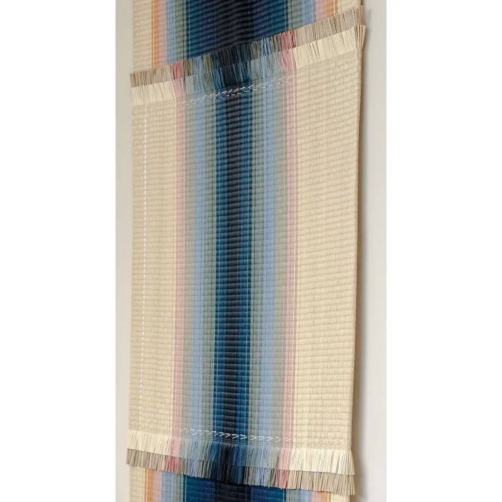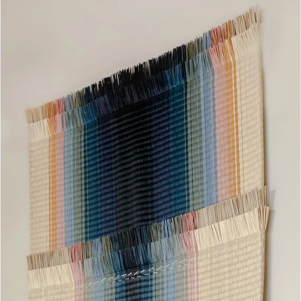 ISHOKU Perspective 02 by Mae EngelgeerLimited edition of 5.Dimensions: D 0,5 x W 85 x H 180 cm.Materials: Igusa straw.ISHOKU PERSPECTIVE wall panels.Graphic compositions made by colores igusa straw creating perspectives. Inspired by the first tatami floor mats used in Japan for tea ceremonies. Woven in Japan in colaboration with Mitsuru Yokoyama and hand finished in Amsterdam.Textile design has always been at the heart of Dutch designer Mae Engelgeer’s work, from her high school days to her studies at the Amsterdam Fashion Institute and Sandberg Instituut. Since opening her own studio in 2013, she has nurtured her curiosity for the Craft, experimenting within the existing boundaries of textile production to elevate old techniques to a modern stage.Mae Engelgeer’s work embraces subtle colour palettes, patterns and linear elements. Complex compositions merge with perfection to establish harmony. Creative explorations into the contrasting of materials and textures result in works that luxurious in their tactility and dimensionality.In addition to developing her own collections, Mae Engelgeer collaborates with brands around the world on projects ranging from textile products and furniture design to material explorations and art direction to Large Scale installations and public artworks.“My work is driven by intuition and the desire to create. While I consider myself to be a dreamer in the creation of new atmospheres, I am able to quickly translate those ideas into tangible works using the right textures, materials and colours. When asked for my vision in collaborations, I feel a certain sense of freedom to explore a multitude of possibilities.”.