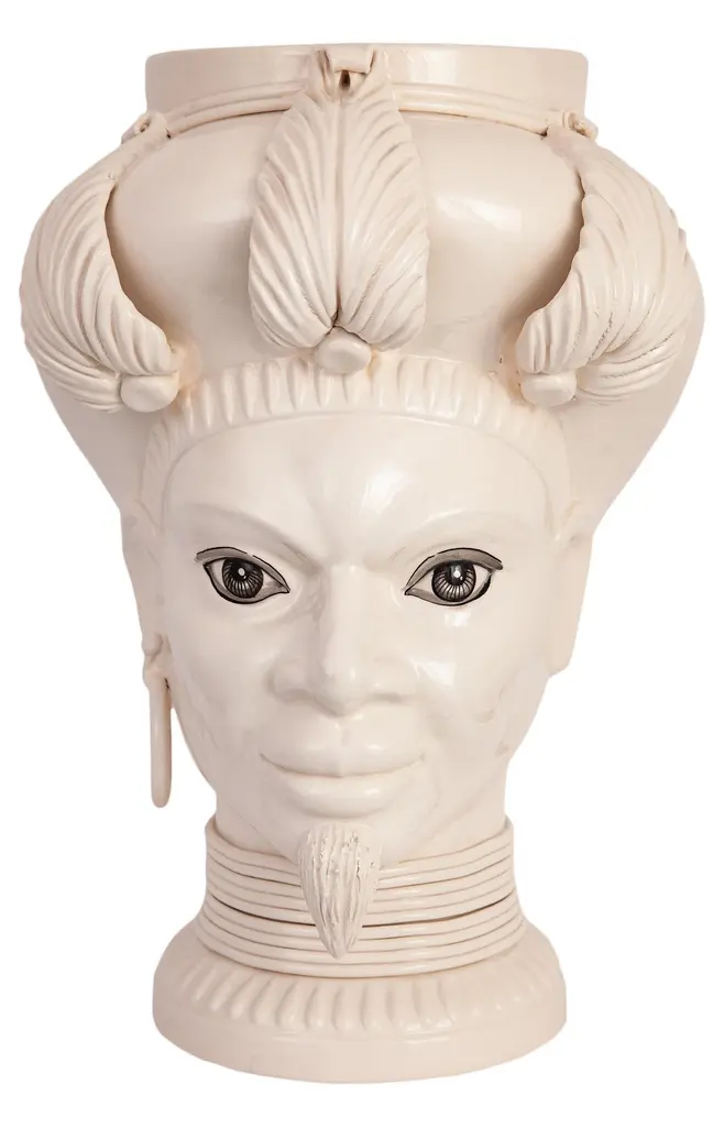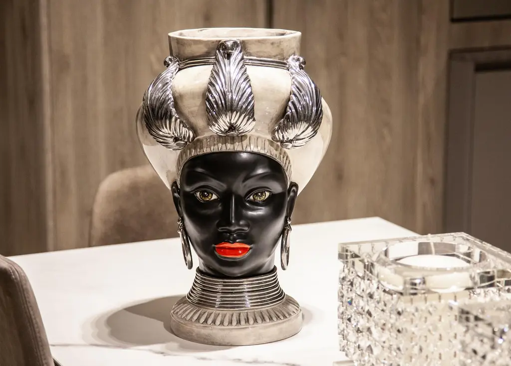 THE COLLECTIONThis collection offers ideas for contemporary décor through sophisticated revelations of art bound to the tradition of ceramics of Caltagirone, objets d’art that combine history and design.The extreme attention to details, supported by twenty years of experience of master craftsmen, is the company’s strength.The production technique hides secrets and art mixtures that make the product unique and exclusive. Mosche Bianche chooses to combine art and design to recall history through ceramic artworks in doing so, history revives, as in a fairy tale, an incredible civilization that is the sicilian culture.The moorish heads in ceramics, tribute to the beauty of ancient Sicily and its traditions, draw inspiration from a legend of love and jealousy set during the arabic domination in Sicily.A STORY OF LOVE AND JEALOUSYThe legend tells that during the moorish domination in Sicily around 1000, in the arabic district of Palermo “al hàlisah” that a moor who, overwhelmed by a violent passion, declared his love to her. Noticed means “the chosen one”, a sweet girl the young girl charmed by his promise of love reciprocated. However, the moor was hiding a terrible truth. He already had a wife and children back home. So, when the girl discovered it, she decided to keep his beloved face with her forever. Without hesitation, she cut off his head and create a vase in which she planted a basil shoot. This aromatic plant has always had an aura of holiness as it represents the rulers’ plant. In this sense, that terrible act was justified by her absolute love to continue to take care of her beloved young moor. Every day in fact, the tears of the young heart-broken girl watered the plant of basil that kept thriving and flourishing. And all the neighbours, inebriated by that sentof the beautiful plant, started to commission clay vases shaped as a moor head.
