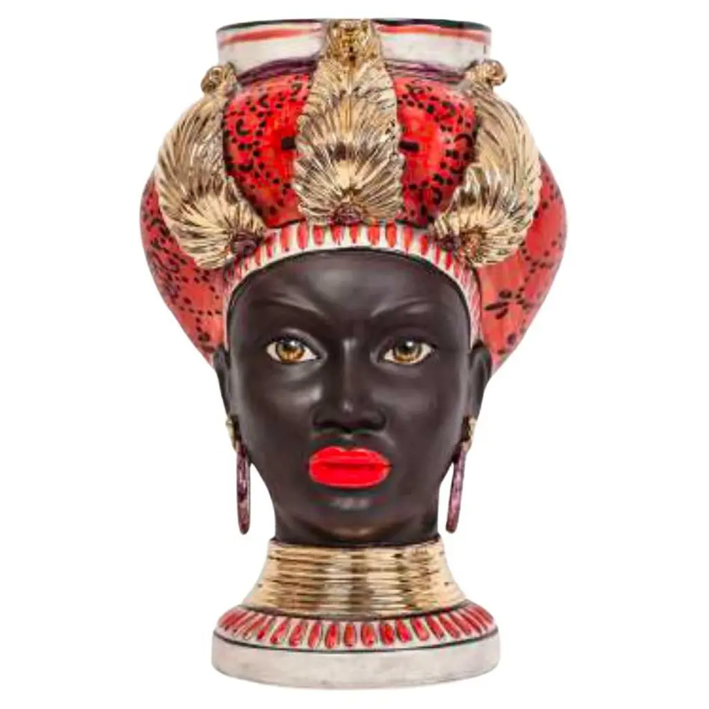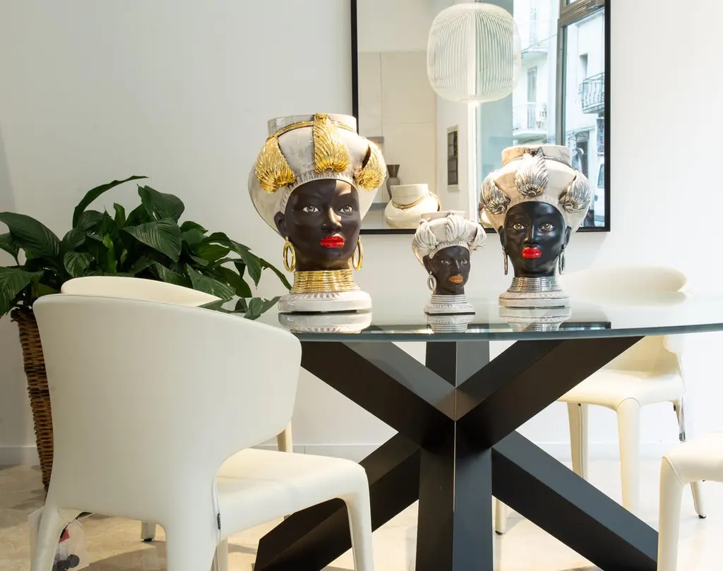 The collectionThis collection offers ideas for contemporary décor through sophisticated revelations of art bound to the tradition of ceramics of Caltagirone, objets d’art that combine history and design.The extreme attention to details, supported by twenty years of experience of master craftsmen, is the company’s strength.The production technique hides secrets and art mixtures that make the product unique and exclusive. Mosche Bianche chooses to combine art and design to recall history through ceramic artworks in doing so, history revives, as in a fairy tale, an incredible civilization that is the sicilian culture.The moorish heads in ceramics, tribute to the beauty of ancient Sicily and its traditions, draw inspiration from a legend of love and jealousy set during the arabic domination in Sicily.A story of love and jealousyThe legend tells that during the moorish domination in Sicily around 1000, in the arabic district of Palermo “al hàlisah” that a moor who, overwhelmed by a violent passion, declared his love to her. Noticed means “the chosen one”, a sweet girl the young girl charmed by his promise of love reciprocated. However, the moor was hiding a terrible truth. He already had a wife and children back home. So, when the girl discovered it, she decided to keep his beloved face with her forever. Without hesitation, she cut off his head and create a vase in which she planted a basil shoot. This aromatic plant has always had an aura of holiness as it represents the rulers’ plant. In this sense, that terrible act was justified by her absolute love to continue to take care of her beloved young moor. Every day in fact, the tears of the young heart-broken girl watered the plant of basil that kept thriving and flourishing. And all the neighbours, inebriated by that sentof the beautiful plant, started to commission clay vases shaped as a moor head.