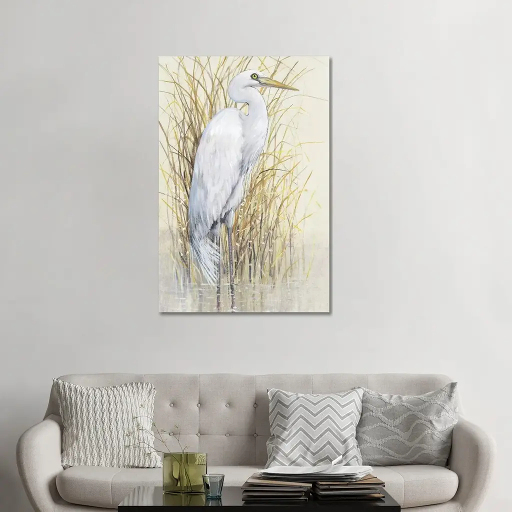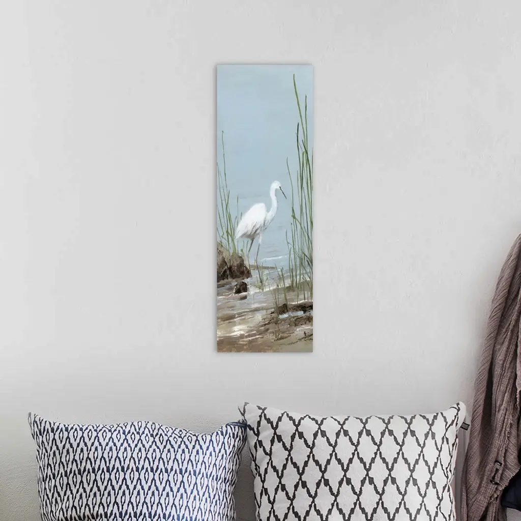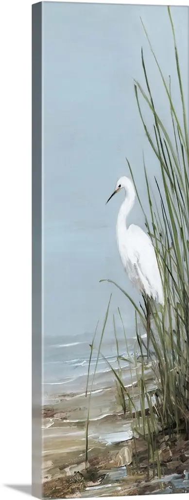 Tall panel painting of an egret on a rocky shore with tall beach grass.