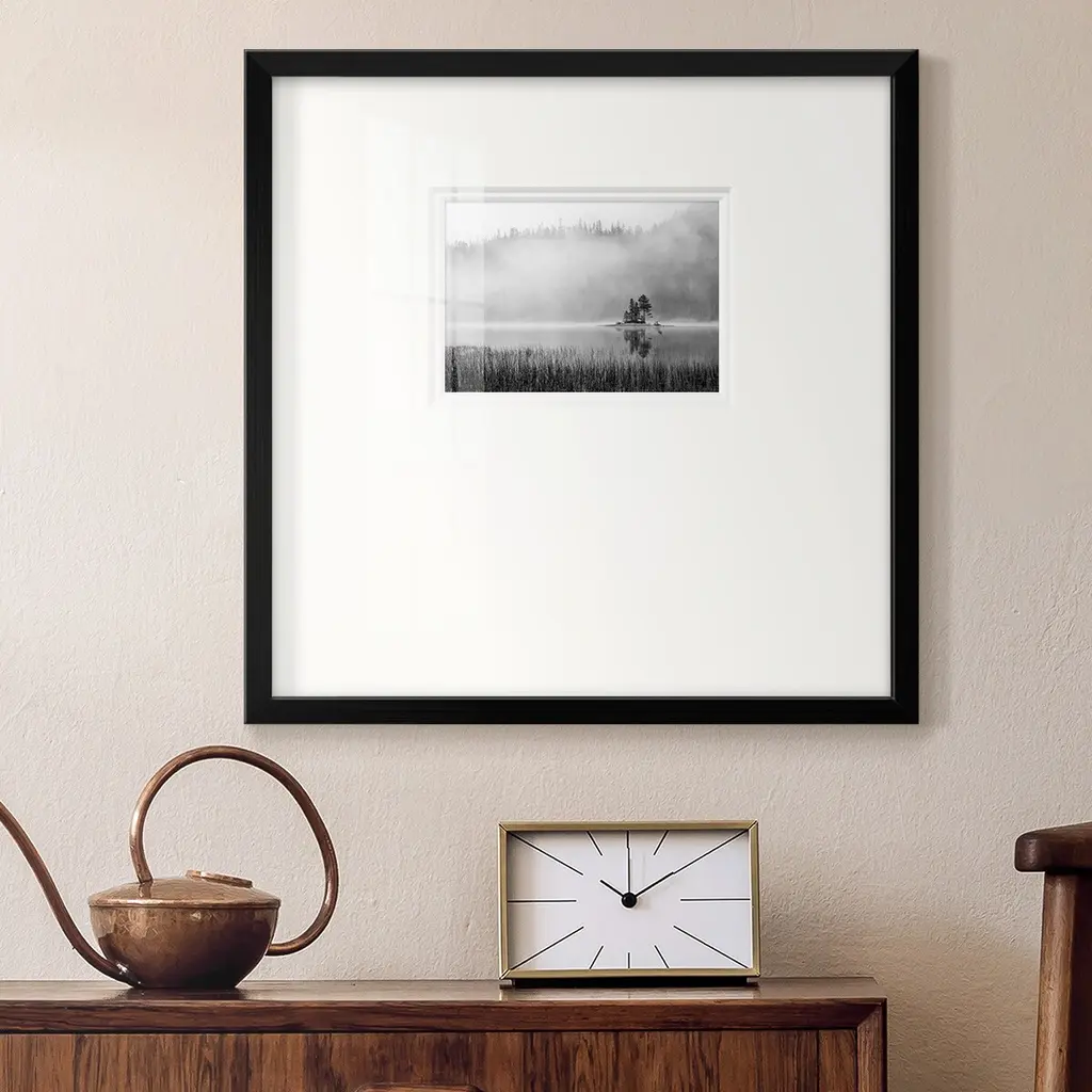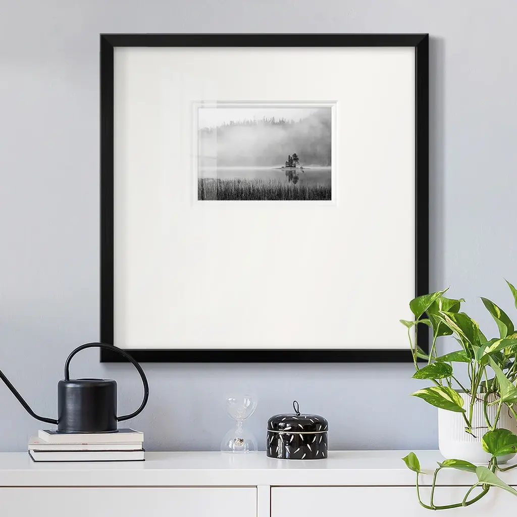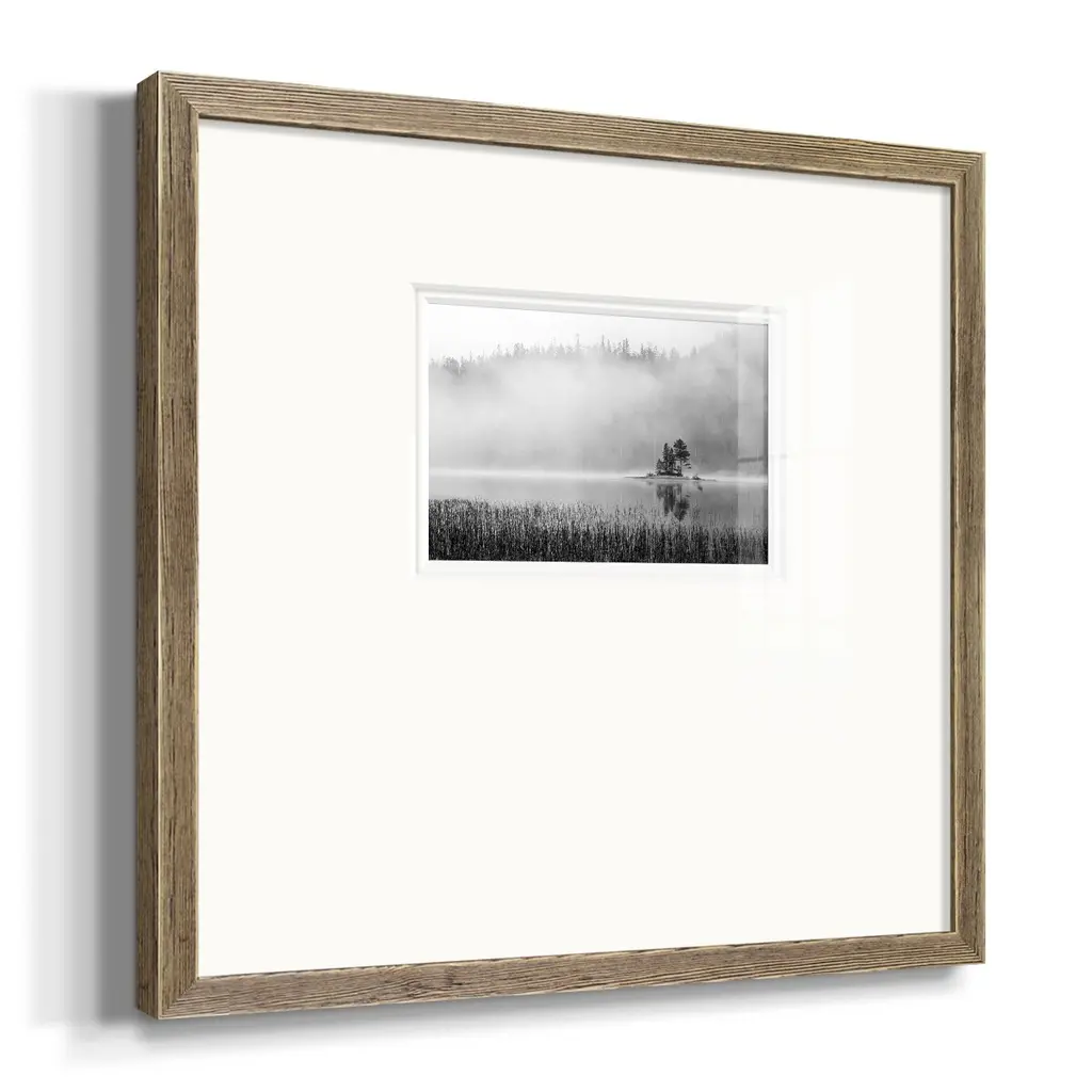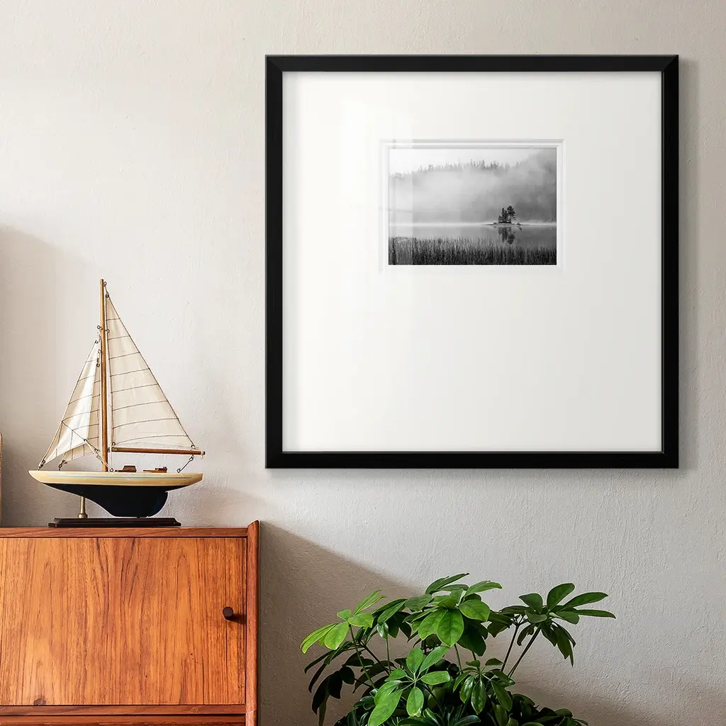 Island FogPremium Framed Print A framed cold pressed paper print featuring superior double matting and quality frame. 2 SIZES AVAILABLE 16''X16''' - Overall Size 20''X20''' - Overall Size Each piece is made to order. Each piece comes with hanging hardware. Made in the USA Ready to Hang Giclee Paper Print Plexiglass Beveled Matt Board Double Matte Board