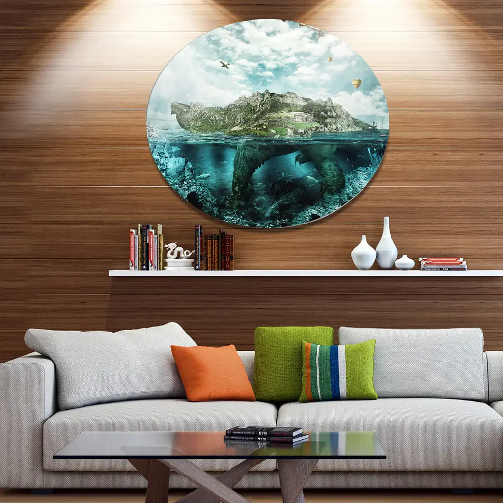Bring Contemporary Abstraction to your home with this large Circle Metal wall art. This Island-Like Large Fantasy Turtle Metal Artwork makes it the focal point of any room or office. - White Gloss Coating ensures colors are extra vibrant with light reflection.- Aluminum grade Sheet Metal with 1 inch mounting frame on the back giving the illusion that the artwork is floating on the wall..- Mounting Brackets are included along with instructions.- High Quality Digital images are created directly into a glossy aluminum panel producing a stunning and captivating print into the glossy finish of the metal.- Water, Fire and Scratch resistant HD Aluminum panels.- Looks better than any photo paper and guaranteed to last at least 20 years- Easy to clean with a microfiber cloth. Colors are far superior to regular Canvas Art. - Easy to Hang