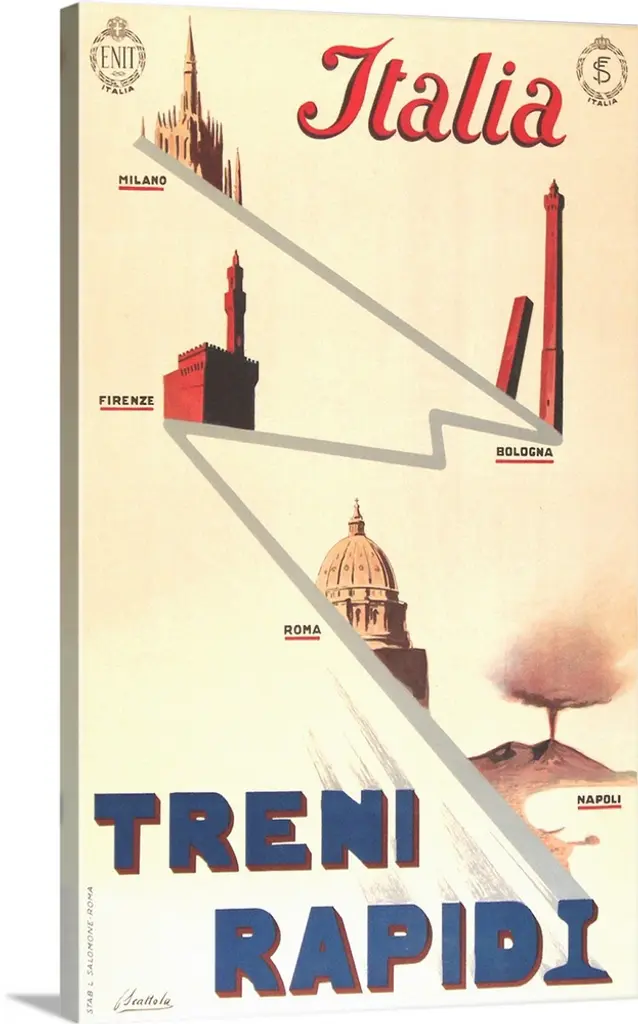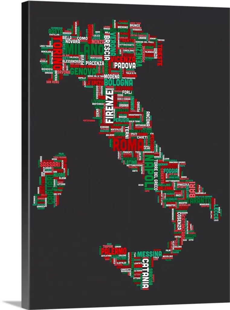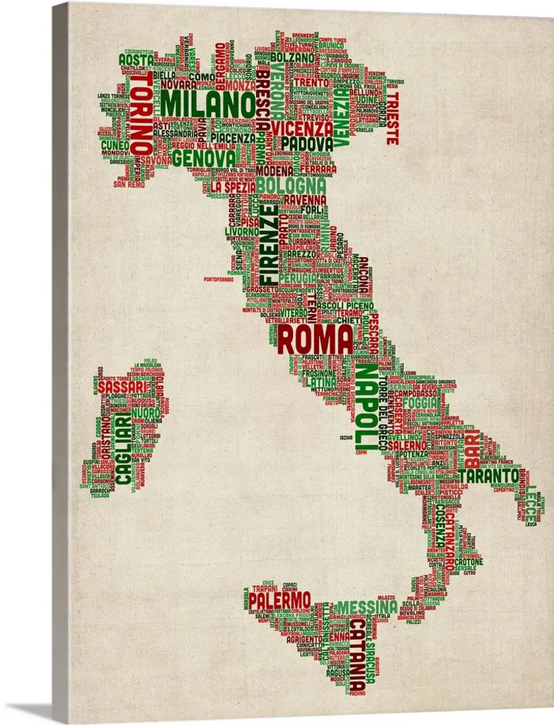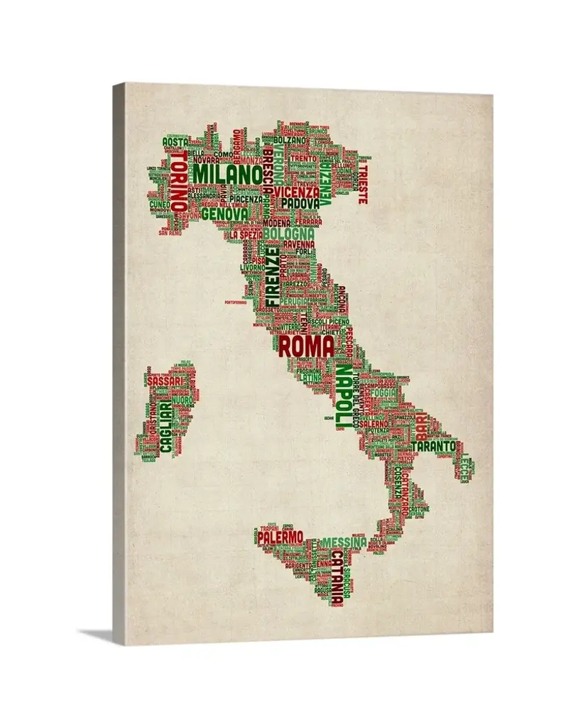 Italian Cities Text Map, Italian Colors On Parchment Wrapped Canvas Art Pri