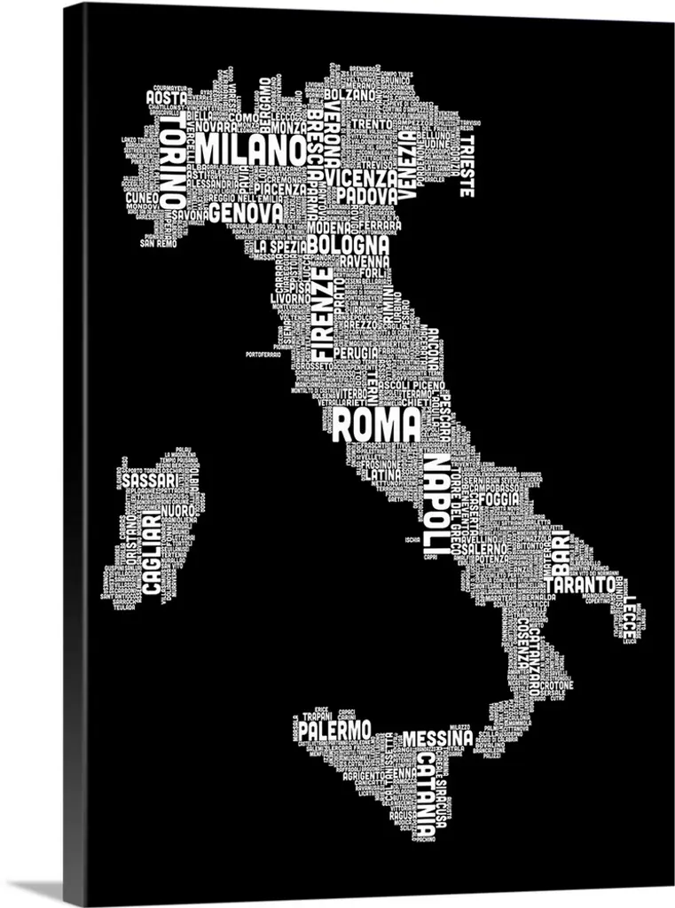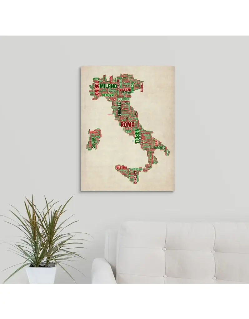 Gallery-Wrapped Canvas entitled 'Italian Cities Text Map, Italian Colors on Parchment'. Multiple sizes available. Primary colors within this image include: Dark Red, Brown, Forest Green, Peach. Made in the USA. Satisfaction guaranteed. Archival-quality UV-resistant inks. Canvases are stretched across a 1.5 inch thick wooden frame with easy-to-mount hanging hardware. Canvas is designed to prevent fading.
