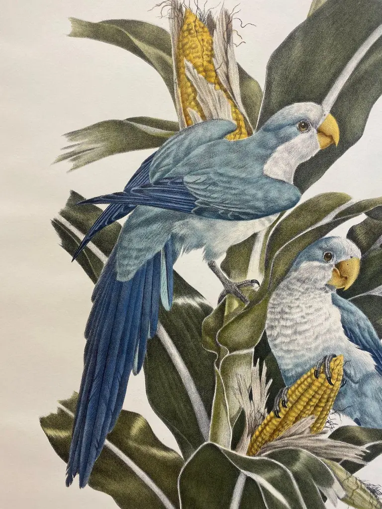 Italian Contemporary Hand Colored Print Axel Amuchastegui "Parakkeets" Blu Tones