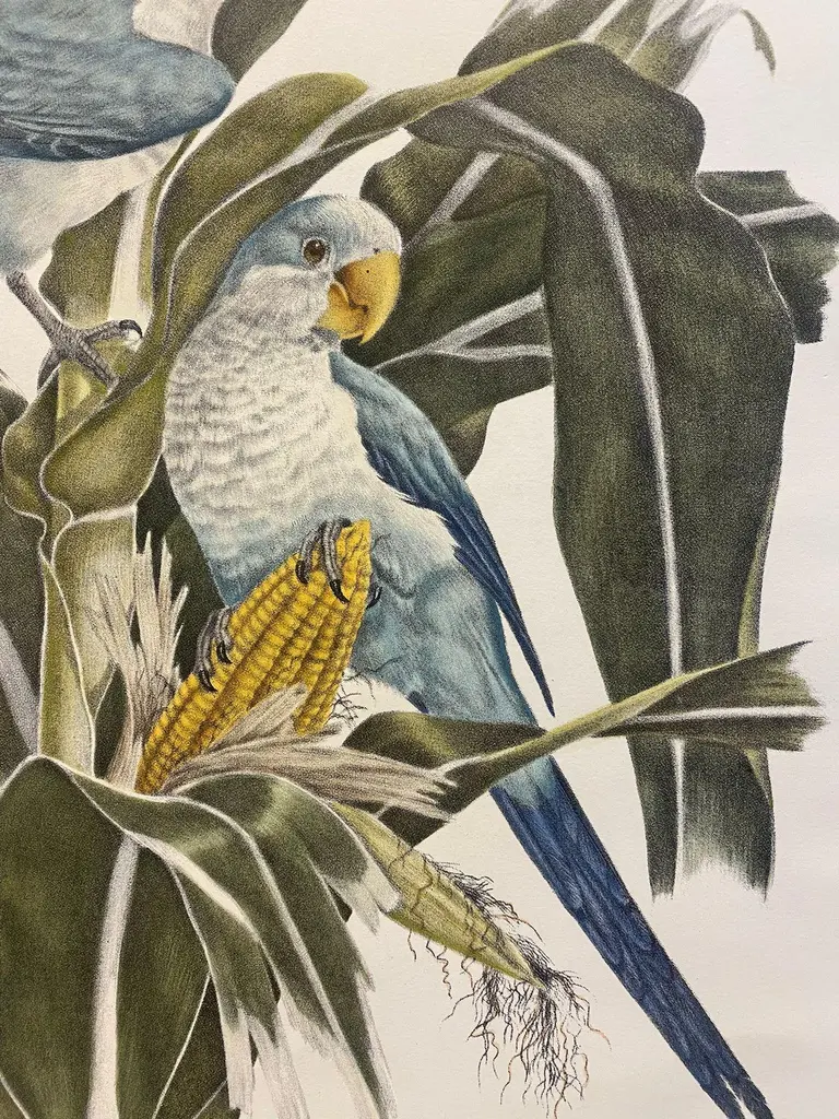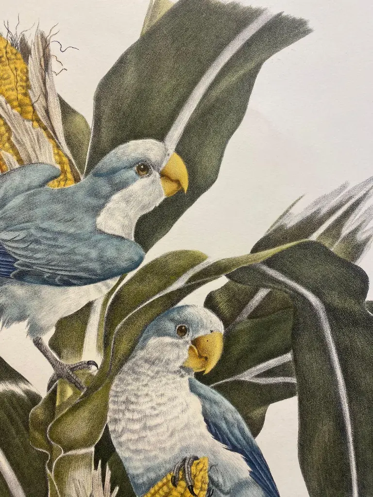 Elegant hand-watercoloured print representing two Ctetas-Green Parakeets in blue nuance. Image reproduced from the famous illustrations by Axel Amuchastegui.Printed manually on 100% cotton engraving paper in Florence Italy.Each print is entirely painted by hand with water colors and tempera in red tones.Matted in dark sage green with back hand detailing.Axel Amuchastegui is one of the best wildlife illustrators of the last 100 years. Axel was was born in 1921 in Cordoba, Argentina, and was a self taught artist. He loved the beauty of the natural environment in which he grew up. Axel developed a unique technique for his paintings using Chinese inks and watercolors.With an experience of over 40 years, Artecornici design creates high-quality handmade frames using precious woods and working various types of high-quality finishes, lacquers and ageing, offering a vast choice of models.Each print is an artisanal Florentine product, reproducing images of the European 18th and 19th centuries with the same printing techniques (engraving with a star press), the golden age of prints, which are then finished and watercolored exclusively by handThe richness of our work lies in the ability to make our customers' requests our own, creating products with personalized, unique, and precious creations, renewing our collections year after year.