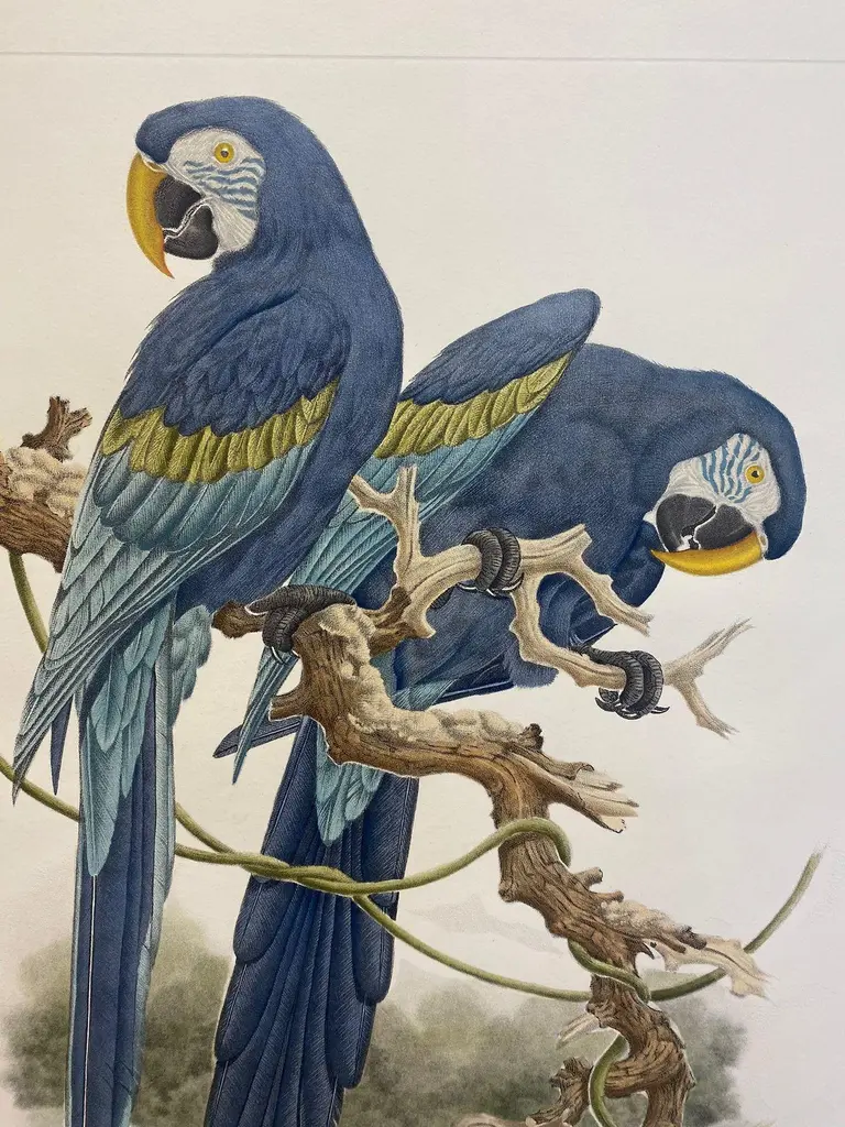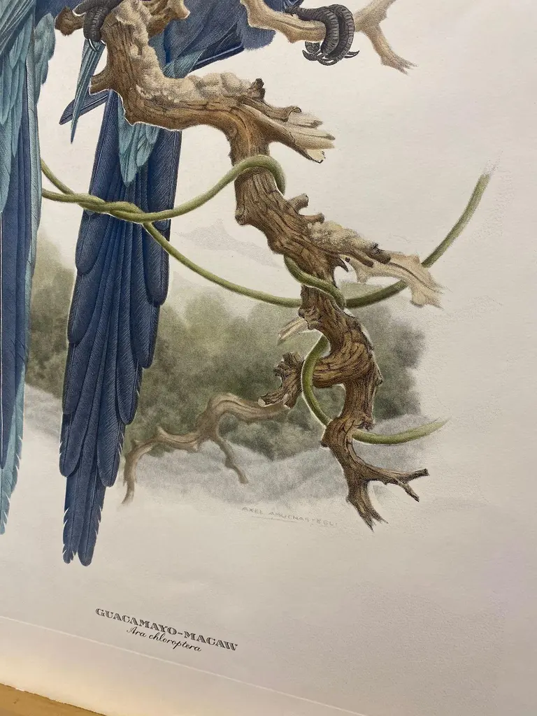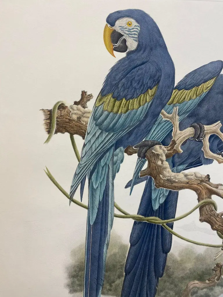Elegant hand-watercoloured print representing two South American Macaws Ara Chloraptera in blue nuance. Image reproduced from the famous illustrations by Axel Amuchastegui.Printed manually on 100% cotton engraving paper in Florence Italy.Each print is entirely painted by hand with water colors and tempera in red tones.Matted in dark sage green with back hand detailing.Axel Amuchastegui is one of the best wildlife illustrators of the last 100 years. Axel was was born in 1921 in Cordoba, Argentina, and was a self taught artist. He loved the beauty of the natural environment in which he grew up. Axel developed a unique technique for his paintings using Chinese inks and watercolors.With an experience of over 40 years, Artecornici design creates high-quality handmade frames using precious woods and working various types of high-quality finishes, lacquers and ageing, offering a vast choice of models.Each print is an artisanal Florentine product, reproducing images of the European 18th and 19th centuries with the same printing techniques (engraving with a star press), the golden age of prints, which are then finished and watercolored exclusively by handThe richness of our work lies in the ability to make our customers' requests our own, creating products with personalized, unique, and precious creations, renewing our collections year after year.