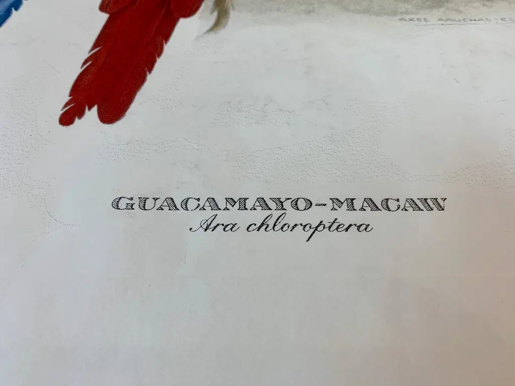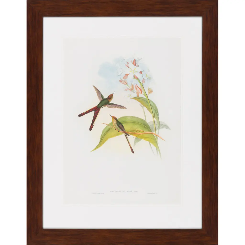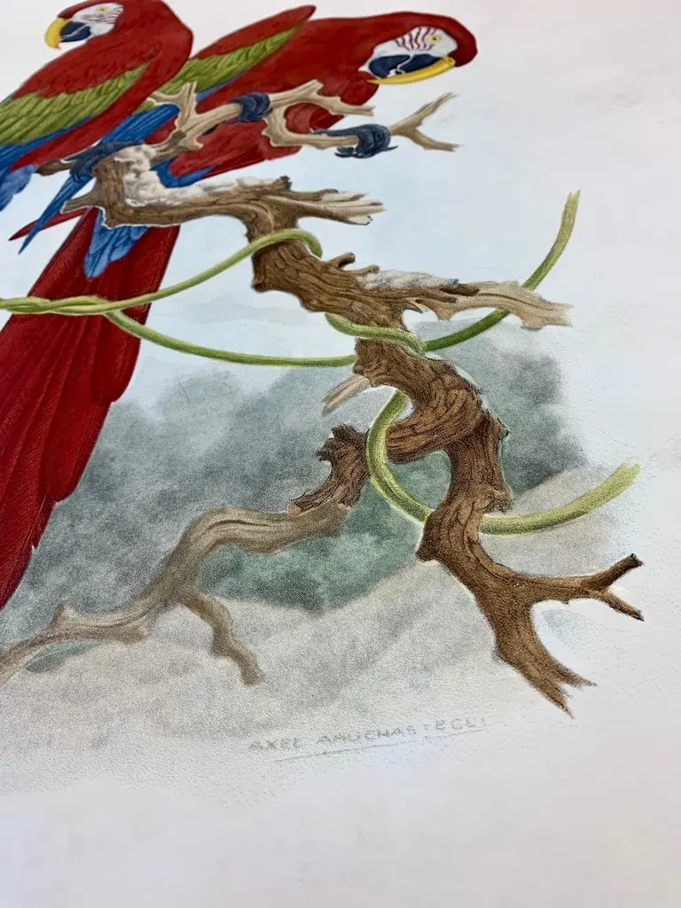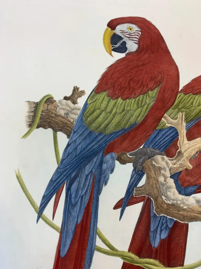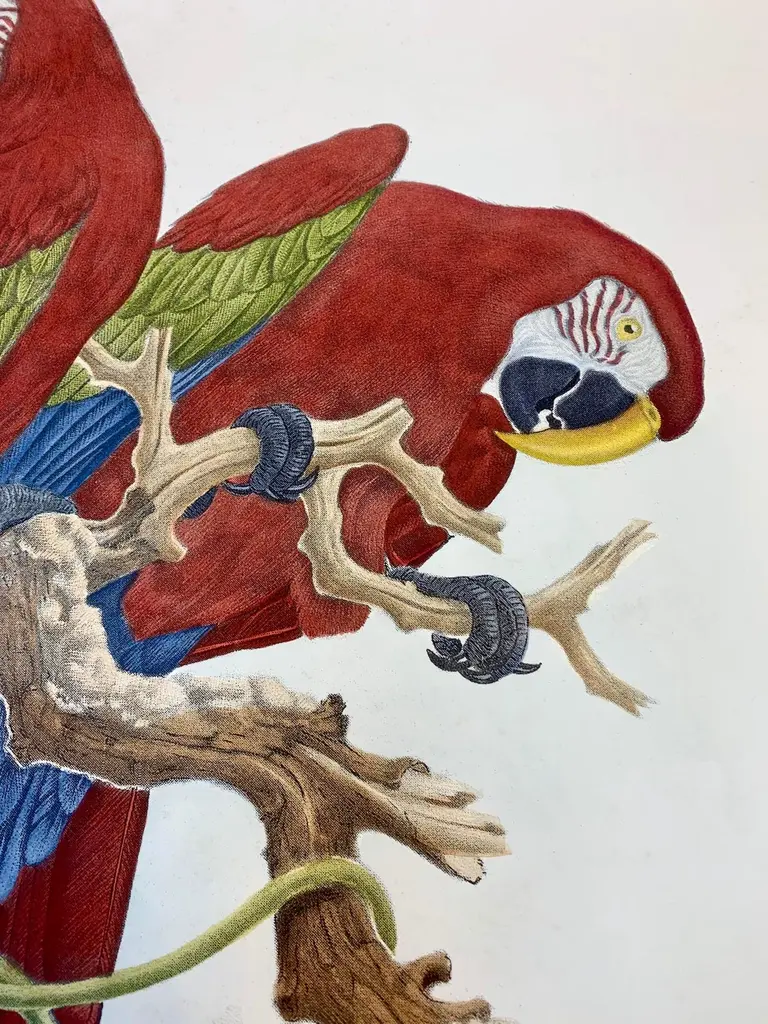 Big size print of two South American Macaws against a ground of tropical foliage.Printed manually on 100% cotton engraving paper in Florence Italy.Each print is entirely painted by hand with water colors and tempera.Matted in dark sage green with back hand detailing and framed in a wide handcrafted frame with black borders and mirror inserts.Artecornici design produces hand colored art prints, artisan frames, lightings, decorative accessories and furniture. All our products are designed and produced in Florence by Italian master craftsmen.