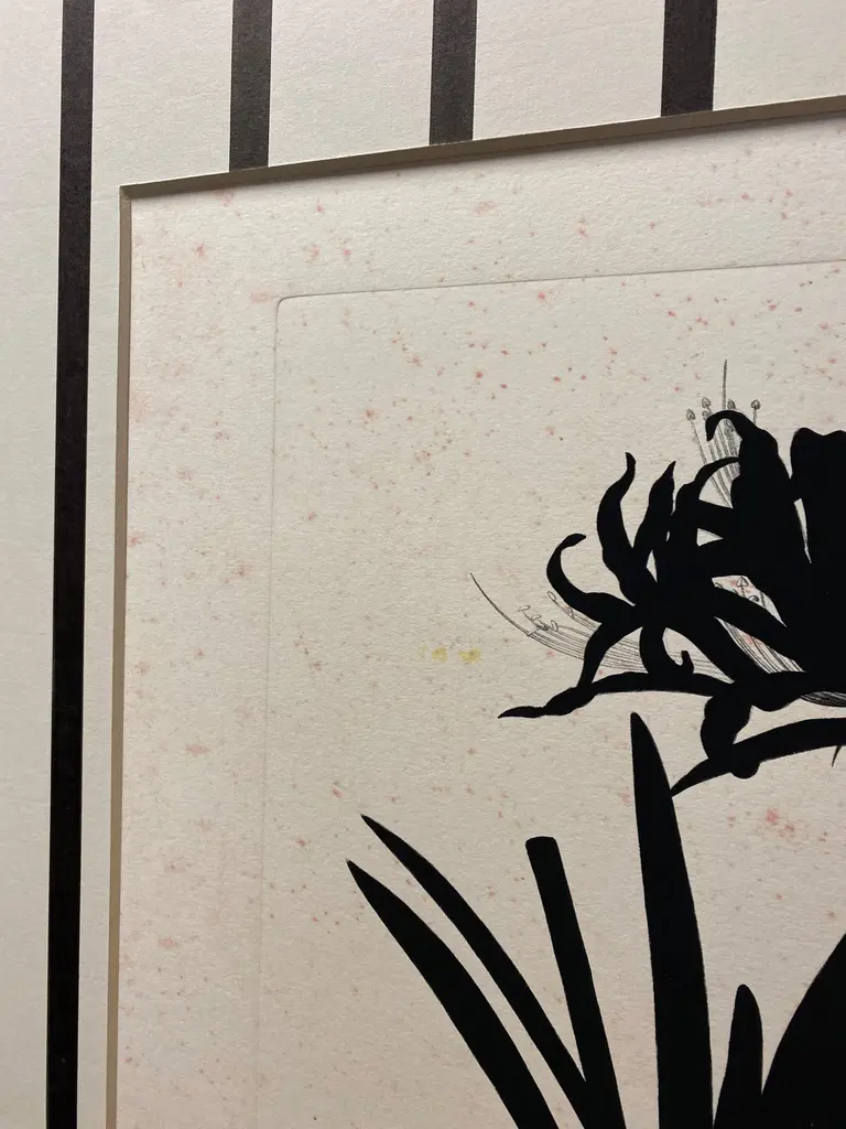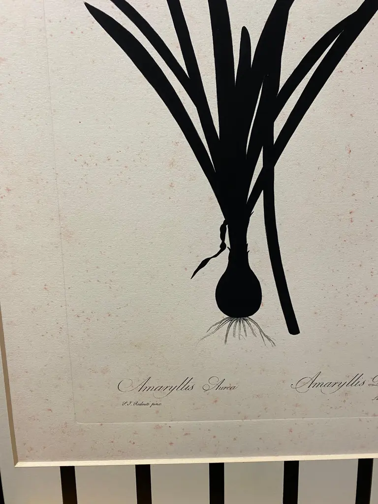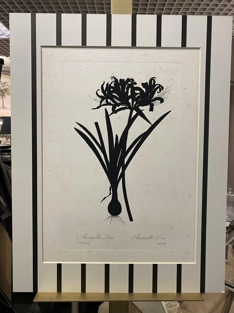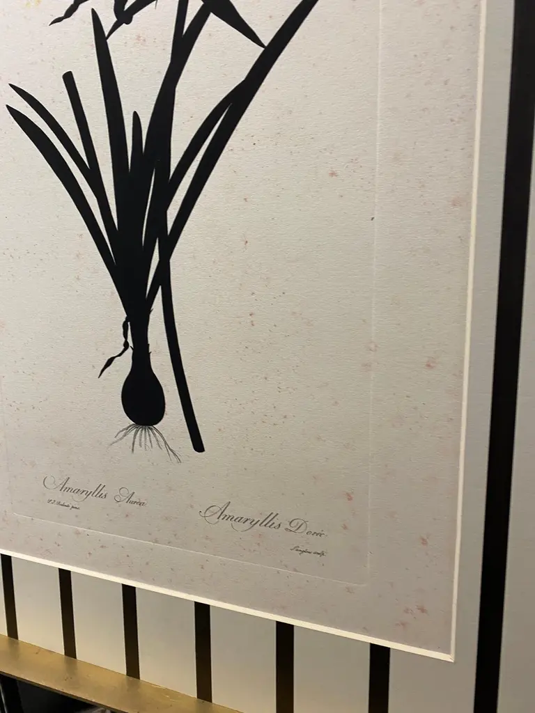Elegant hand-watercoloured black silhouette print representing "Amaryllis Aurea", printed on aged paper and accompanied by a stunning white passpartout with black stripesThis botanical style print is available in 3 different natural representations to create a bright and joyful composition. In series with:- Tulipe de Jardins- Amaryllis Aurea- Lilium SuperbumA silhouette is the image of a person, animal, object or scene represented as a solid shape of a single colour, usually black, with its edges matching the outline of the subject. The interior of a silhouette is featureless, and the silhouette is usually presented on a light background, usually white, or none at all. The silhouette differs from an outline, which depicts the edge of an object in a linear form, while a silhouette appears as a solid shape. Silhouette images may be created in any visual artistic medium, but were first used to describe pieces of cut paper, which were then stuck to a backing in a contrasting colour, and often framed.Cutting portraits, generally in profile, from black card became popular in the mid-18th century, though the term silhouette was seldom used until the early decades of the 19th century, and the tradition has continued under this name into the 21st century.With an experience of over 40 years, Artecornici design creates high-quality handmade frames using precious woods and working various types of high-quality finishes, lacquers and ageing, offering a vast choice of models.Each print is an artisanal Florentine product, reproducing images of the European 18th and 19th centuries with the same printing techniques (engraving with a star press), the golden age of prints, which are then finished and watercolored exclusively by handThe richness of our work lies in the ability to make our customers' requests our own, creating products with personalized, unique, and precious creations, renewing our collections year after year.